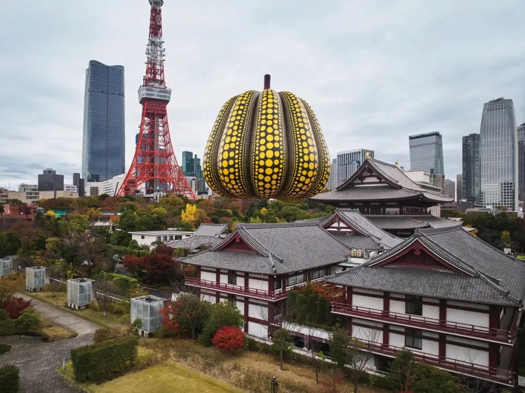 以埃菲尔铁塔为灵感的通讯塔东京铁塔旁盛开着一朵“巨大南瓜”,婴儿车里的小朋友也能看到的铬球雕塑和南瓜形状热气球。