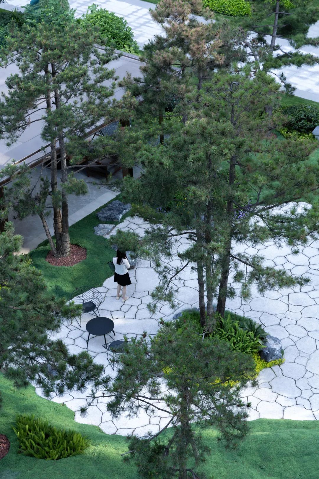 没有一棵树是偶然出现的。它的姿态、它的冠型、它的松针和枝干,都被丈量过、被推敲过。树与树、树与石、树与人,恰到好处地彼此映衬、又彼此烘托,最终形成一个舒服自在的关系。