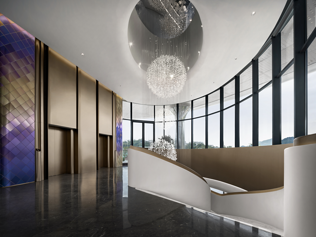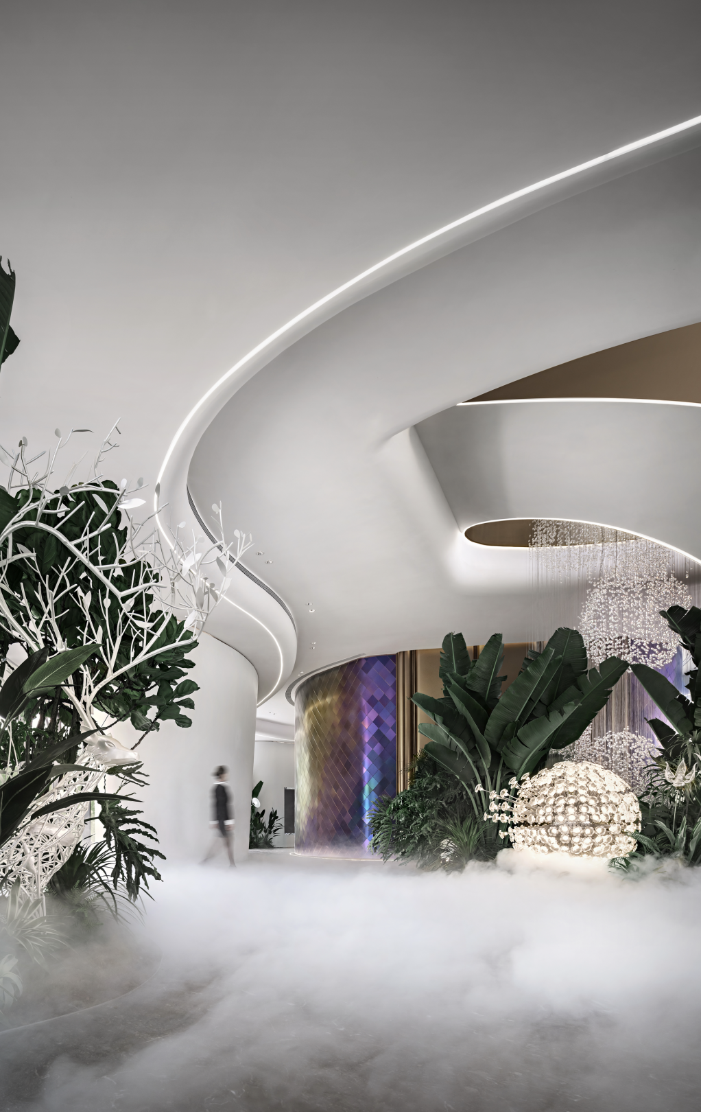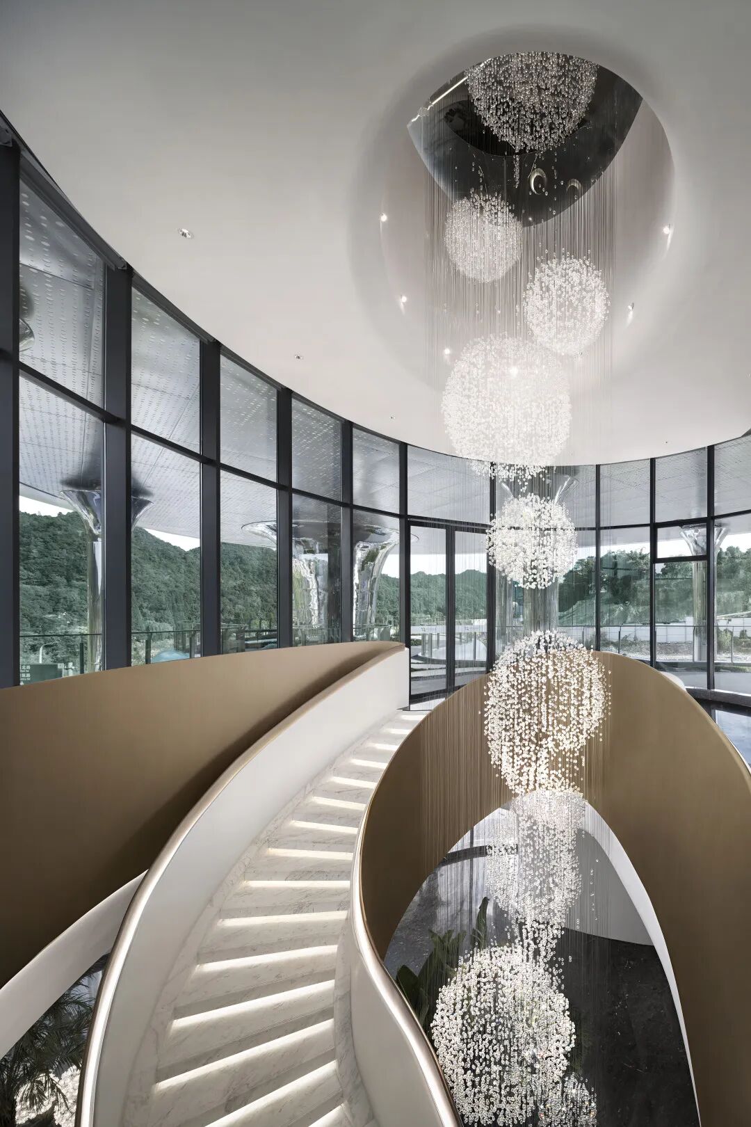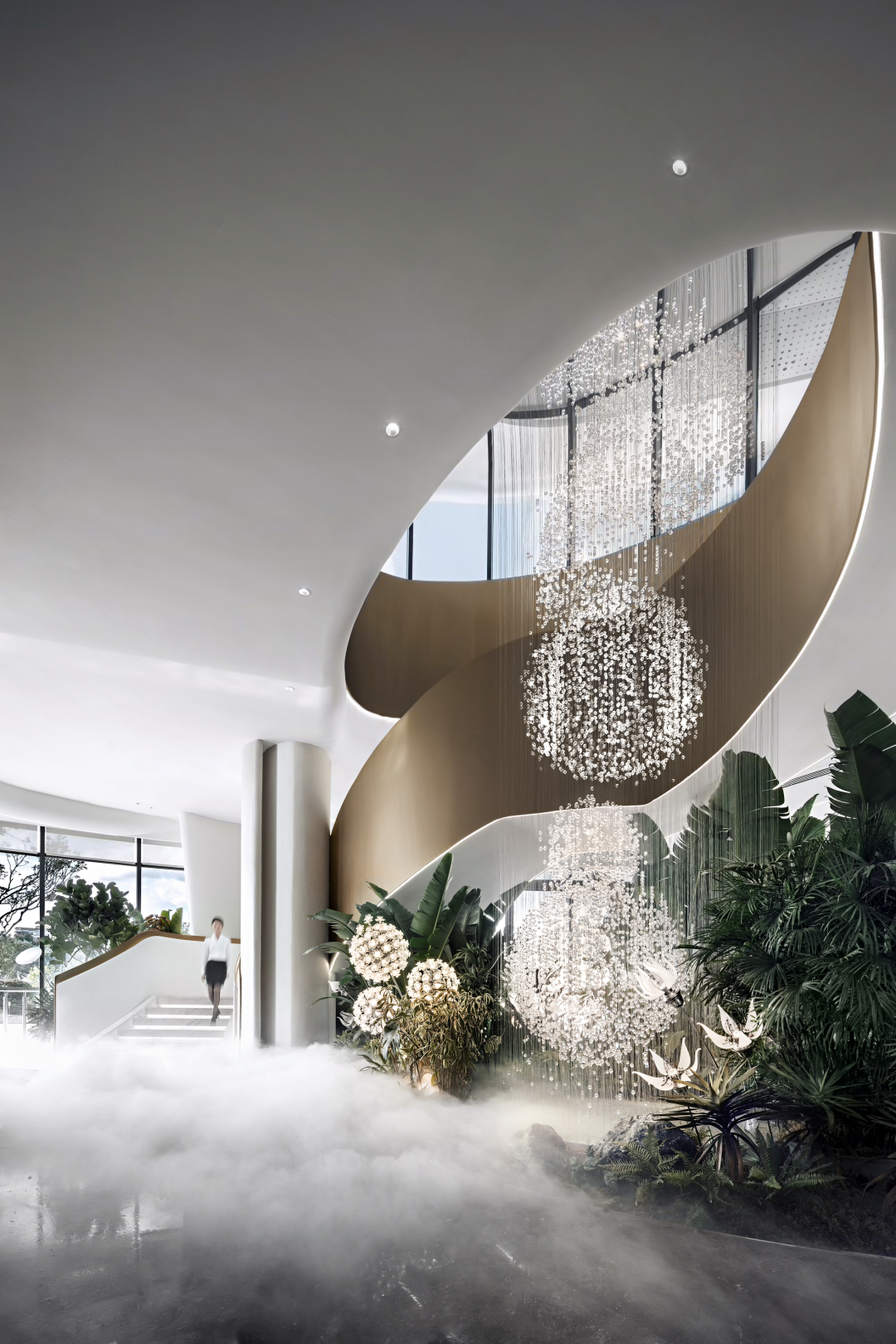 曲線形態的藝術樓梯宛如一條金色的紐帶蜿蜒而上,帶我們探索更多奇妙的空間。動態流線之美在提升韻律的同時,賦予空間靈性與活力,白與金的碰撞渲染潮流前衛氛圍,搭載傾瀉而下的震撼燈飾,使人宛若置身於一片奇幻境域中。