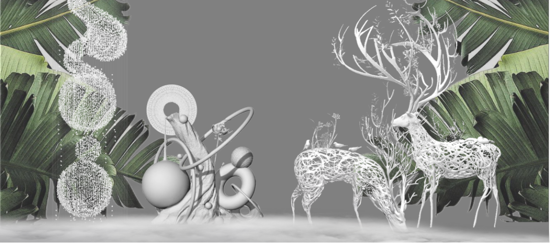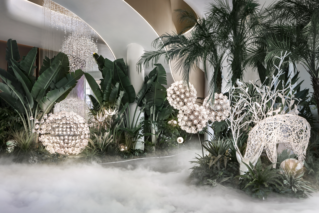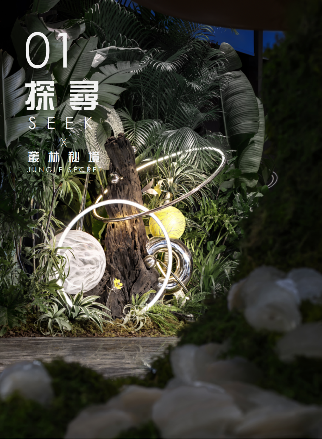 用金屬鍛造白色鏤空鹿形裝置,結合燈光譜寫【林深時見鹿】的浪漫故事。深林中心是一顆【未來之樹】,技術、顏色、材料的不同探索,層層遞進的實現具有高雅品質感的藝術深化,引發觀者向內探尋的欲望。