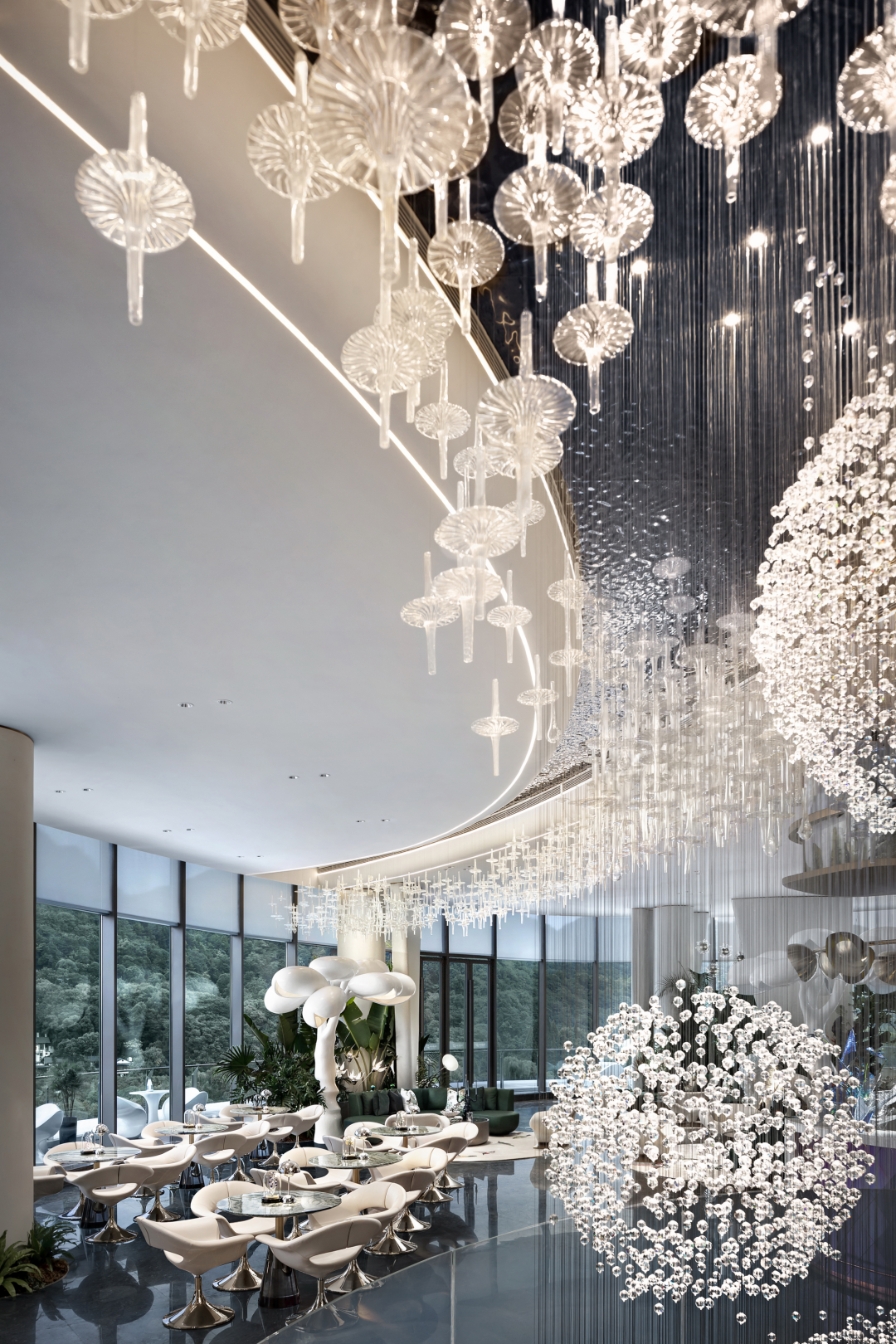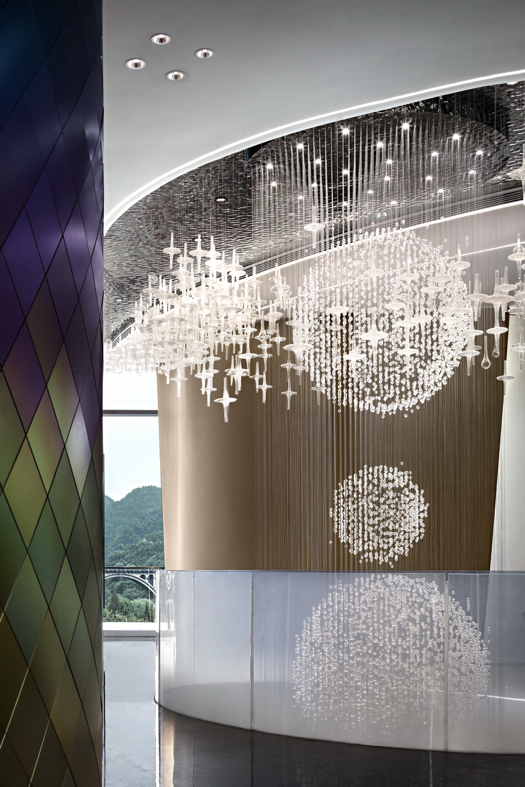 從三層傾瀉至一層的藝術裝置,捕捉於自然界的動態呈現,由1800根鋼絲垂掛38000個水晶珠組合而成,交織閃爍的藝術燈飾,星光點點的營造出瀑布一瀉而下的震撼場景。