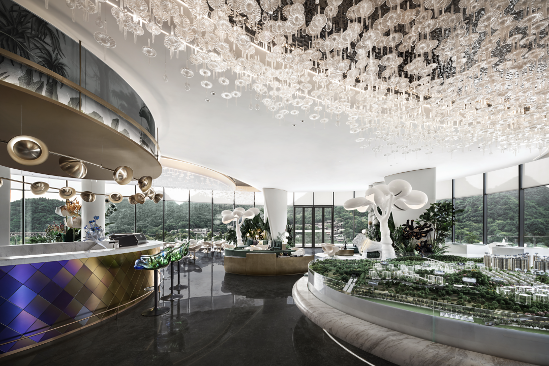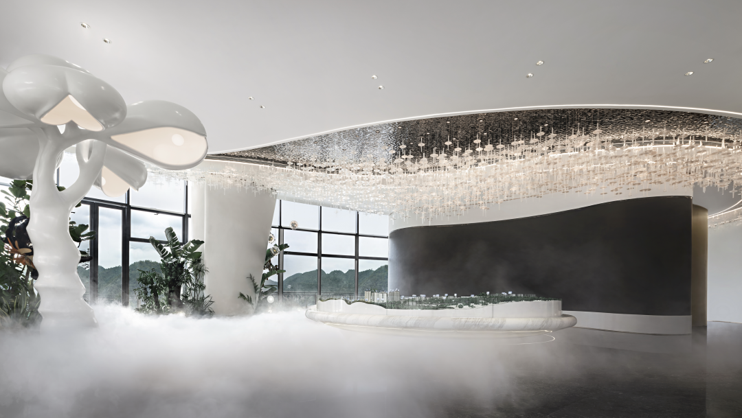 沙盤區頂面造型以曲線構建一個充滿律動且柔美的空間,天花水晶垂簾,如同在巖洞之中,水簾蔓延,匯聚成瀑布,在自然光下,形成波光粼粼的藝術美感。