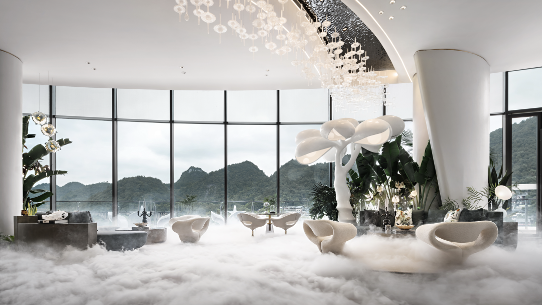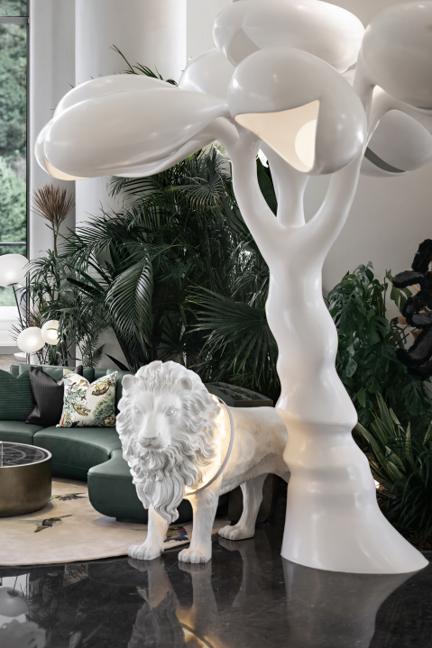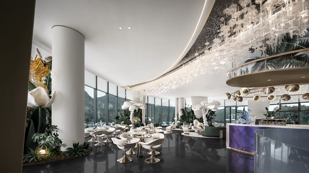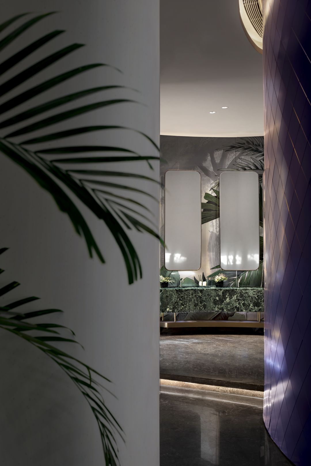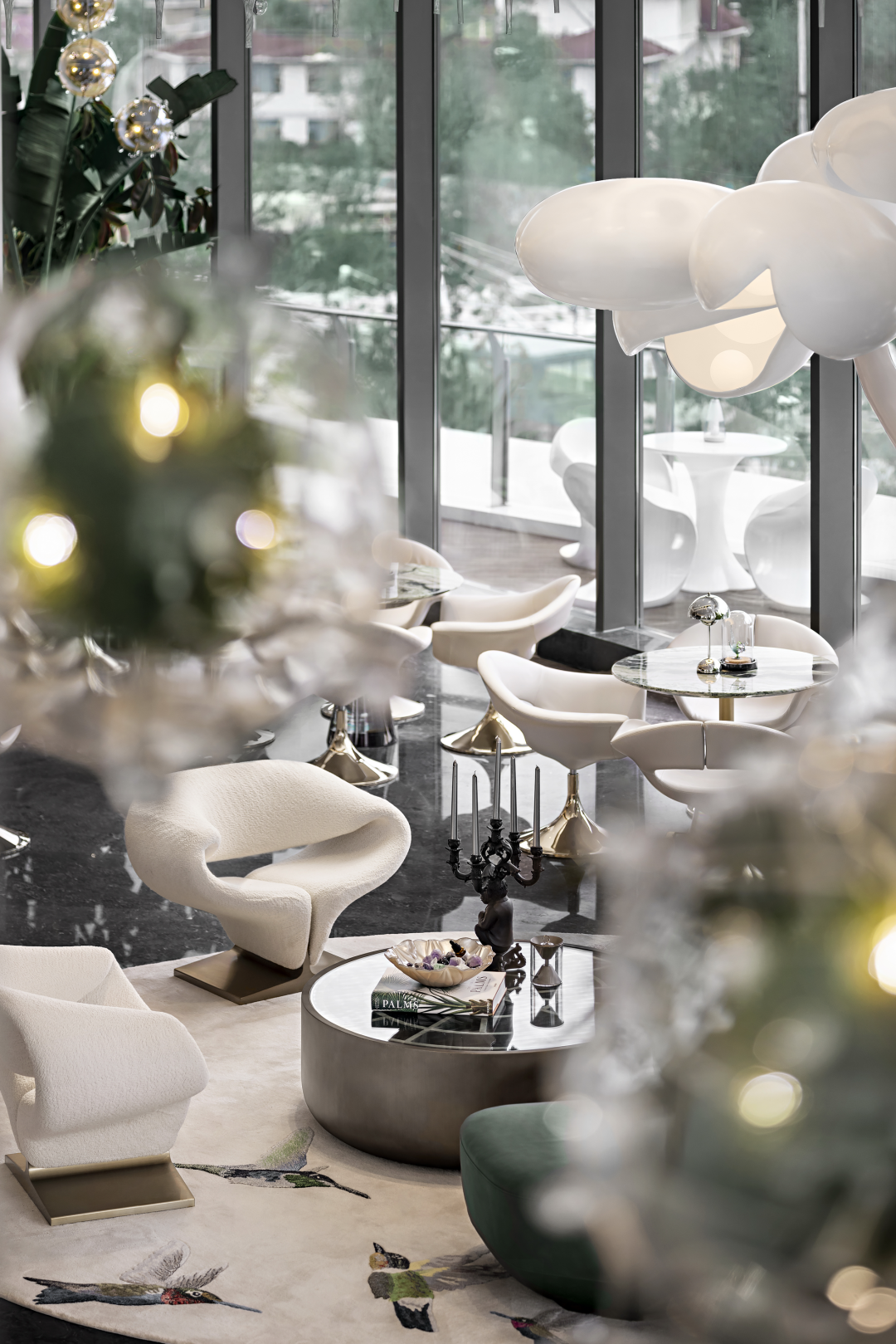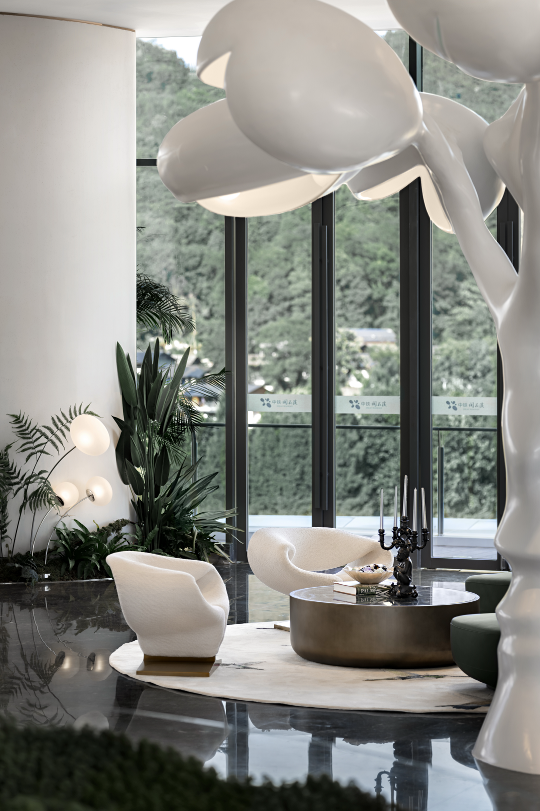 深洽區的曲線沙發與建築線條相互呼應,自然的綠色營造獨有的生命氣息,與達莉亞椅形成柔美又生動的圍坐格局,感性曲線在詩意的懸念中捕捉靈魂,結合蔥郁綠植與象征自然生態的藝術裝置,烘托靜謐寫意的從容藝境。