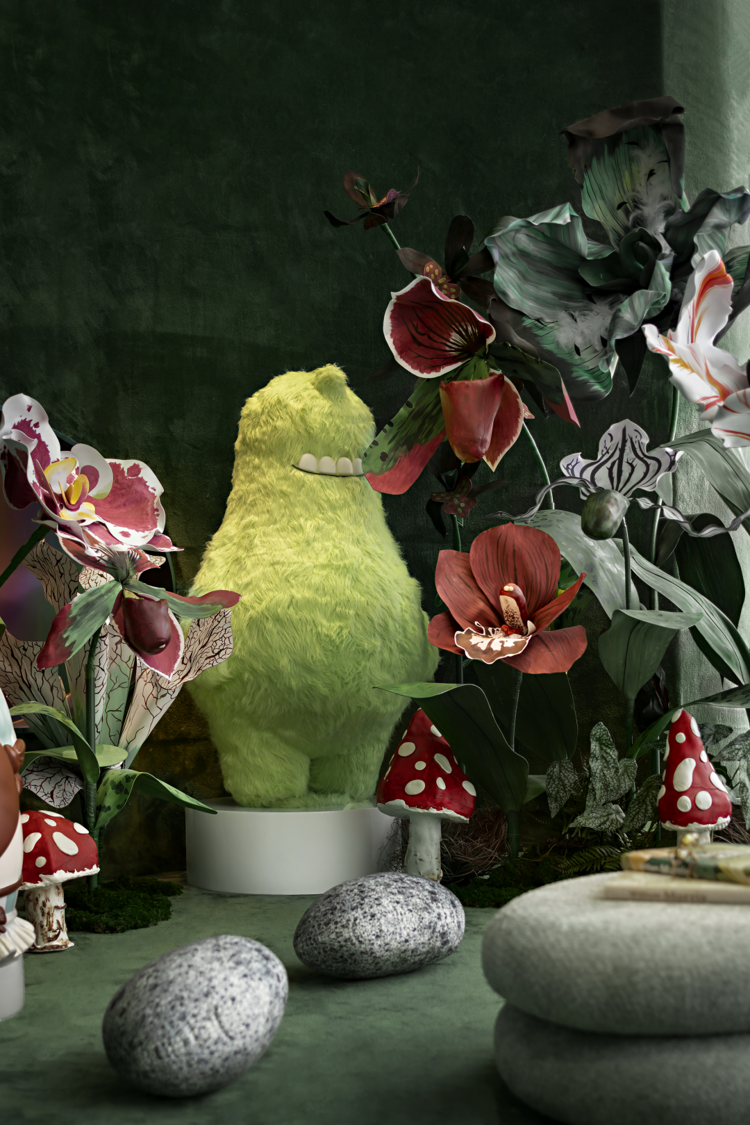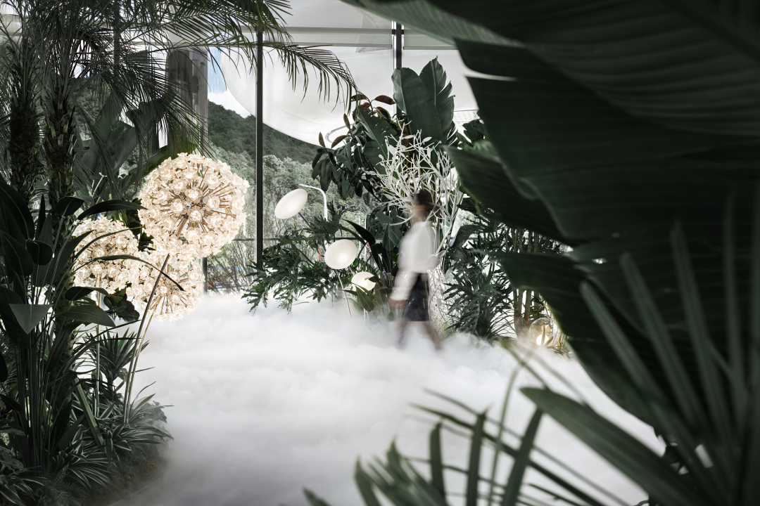 來到漫生活展示區,設計師通過自然情景的主題化打造,為訪者帶來沈浸式的感官體驗。樹木鱗次櫛比,搭配噴霧設備,讓空間彰顯的更加虛幻、飄渺,輕靈浪漫的【蒲公英】藝術裝置穿插飛舞於林中,起風而行,風靜而安,一個自然,神秘別具一格的森林形態立刻凸顯出來。