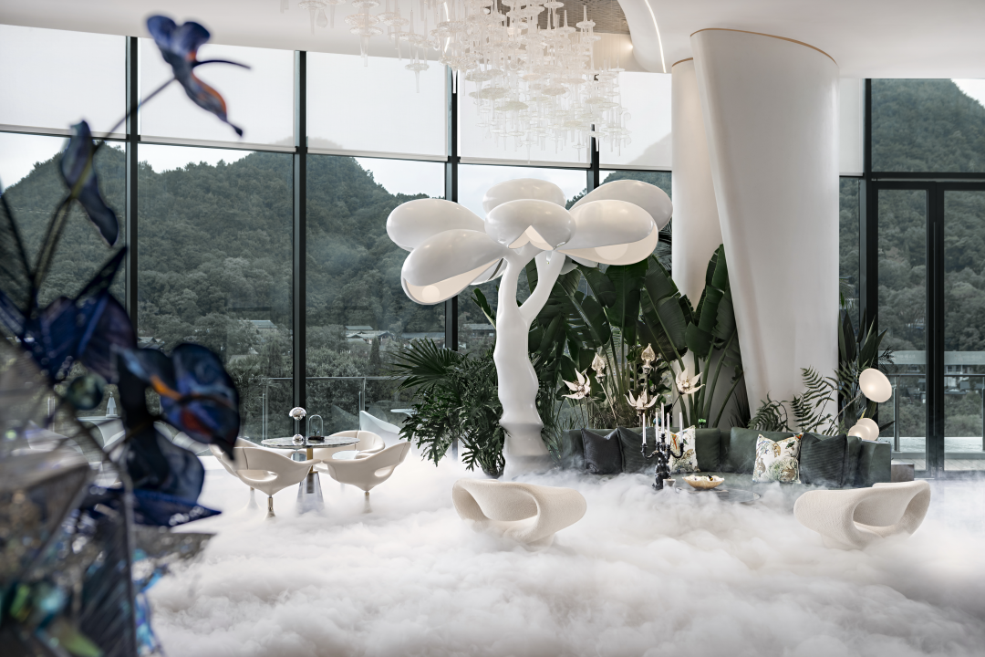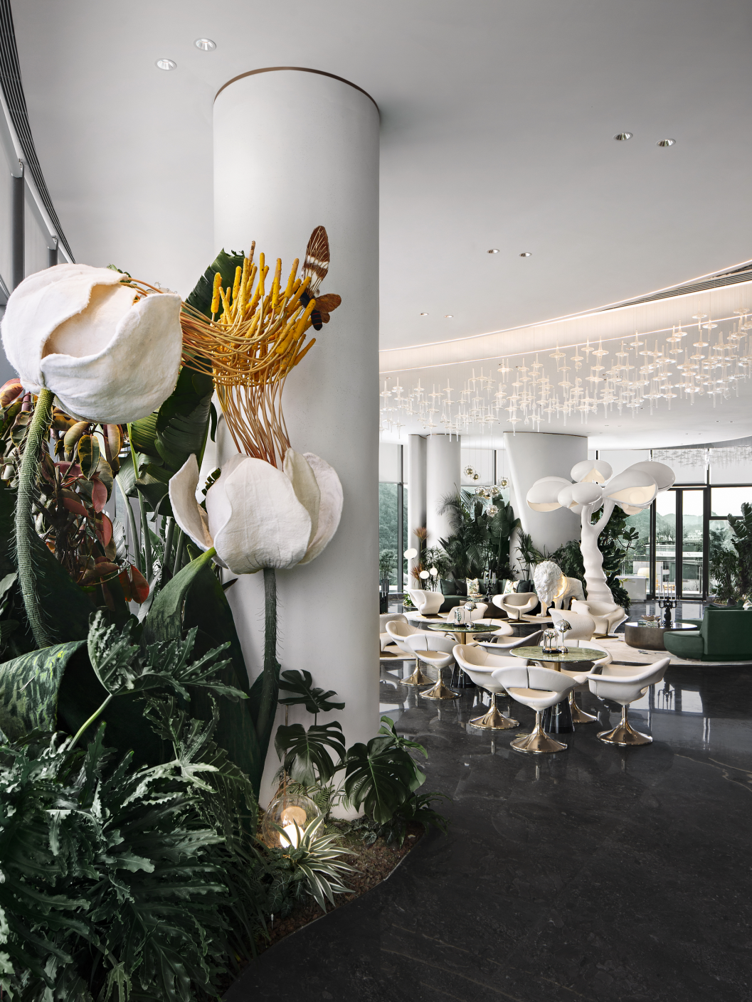 全景式落地窗將室外盎然景致收入視野,花卉扶手椅與室外景觀、室內景設,形成自然鮮活的對話,功能與美學達到了統一,營造出一份奇幻浪漫的美好生活意境。