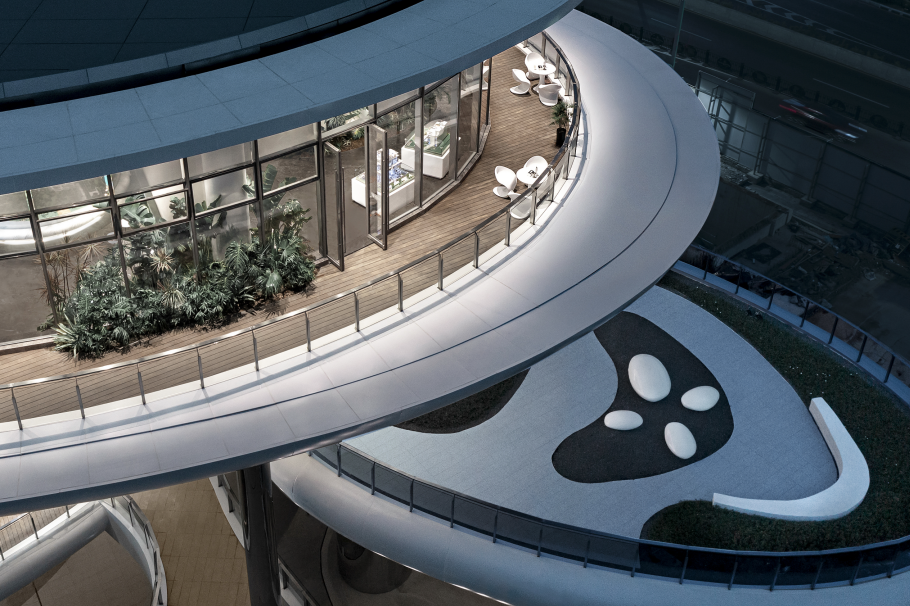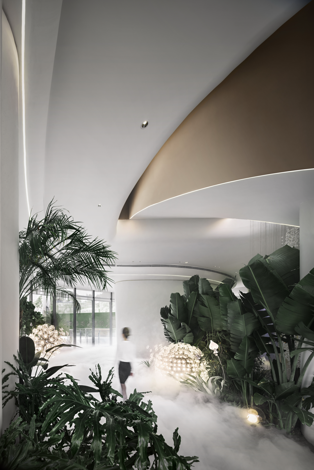 進入前廳,首先映入眼簾的便是一片自然開闊的都市叢林景象,曲線勾勒出各種形態的景觀花池,由內延申至室外,綠意環繞,疊疊重重,透出勃然生機氛圍。