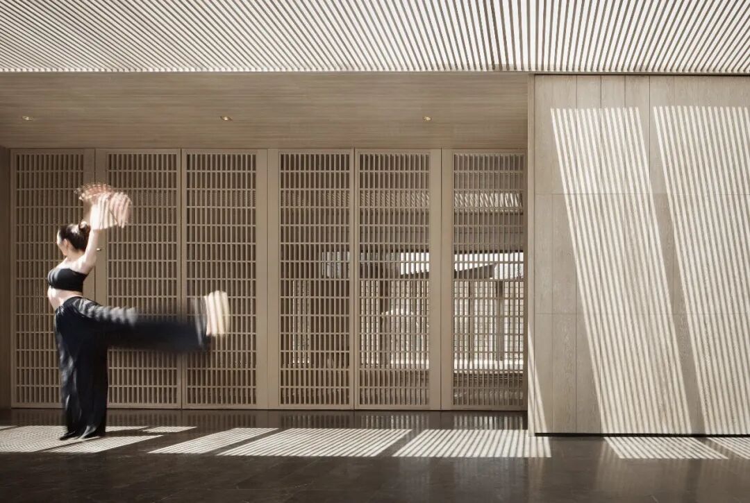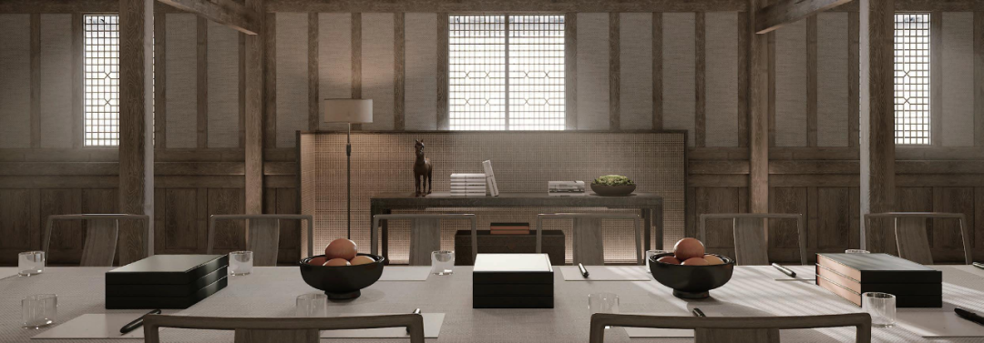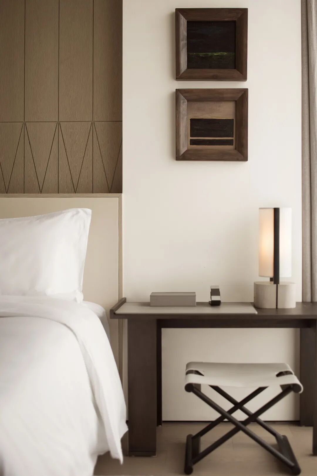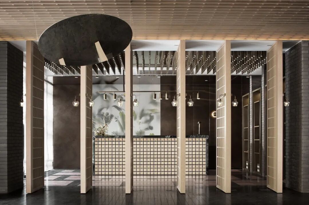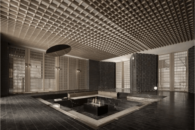 酒店接待大堂恰位于新老建筑的连接点,设计师希望它能保持“中立”、兼容古今。天花的样貌取自于传统建筑的“平棋”并对之简化、几何化。