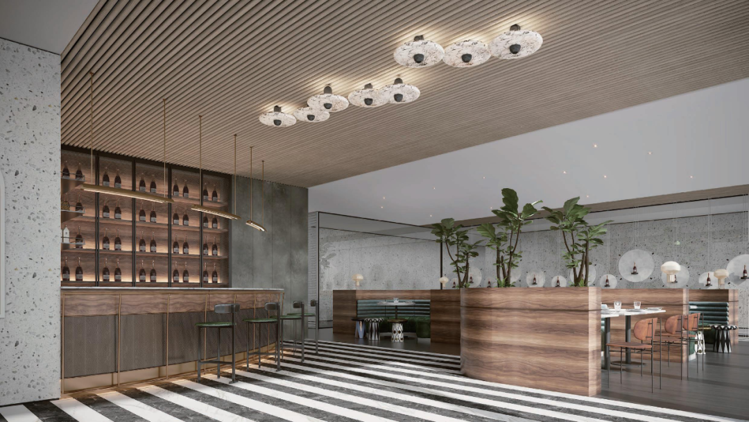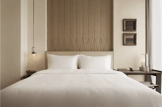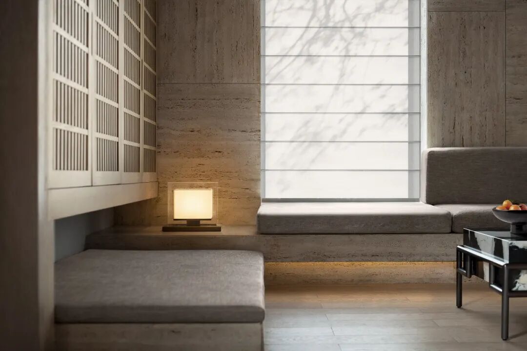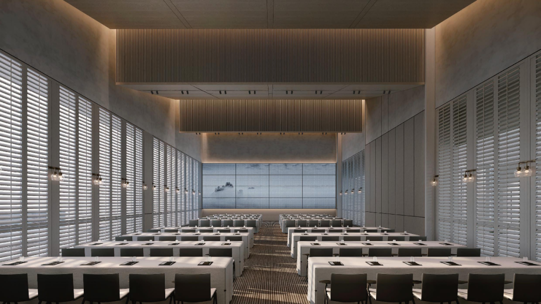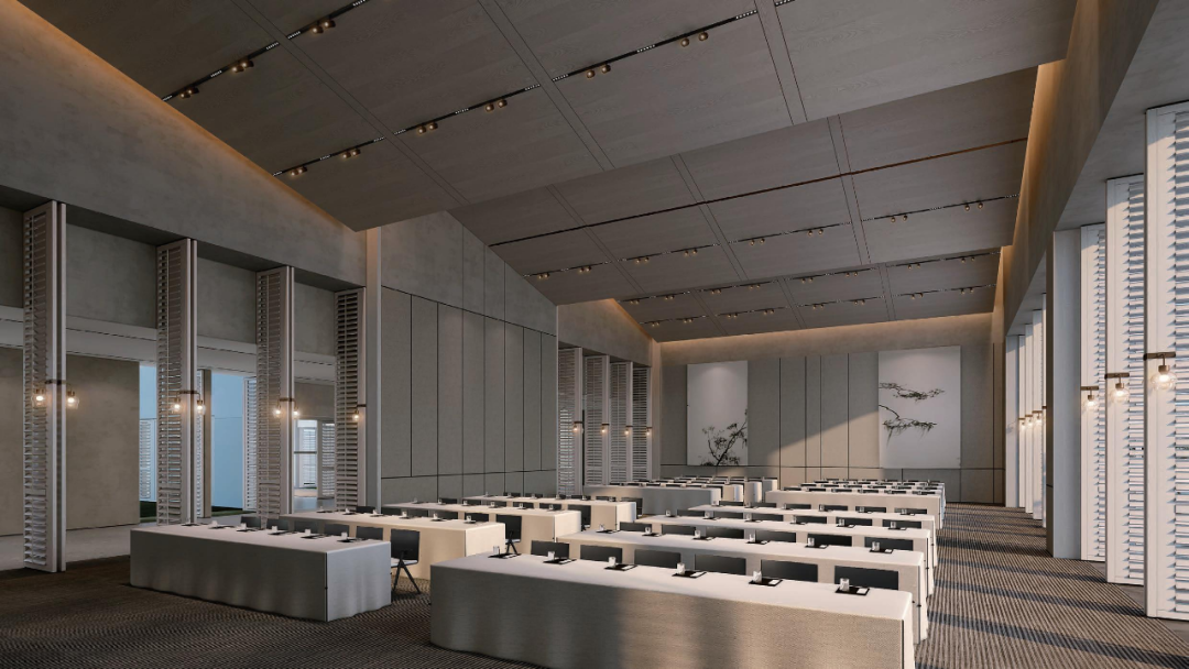 酒店接待大堂恰位于新老建筑的连接点,设计师希望它能保持“中立”、兼容古今。天花的样貌取自于传统建筑的“平棋”并对之简化、几何化。
