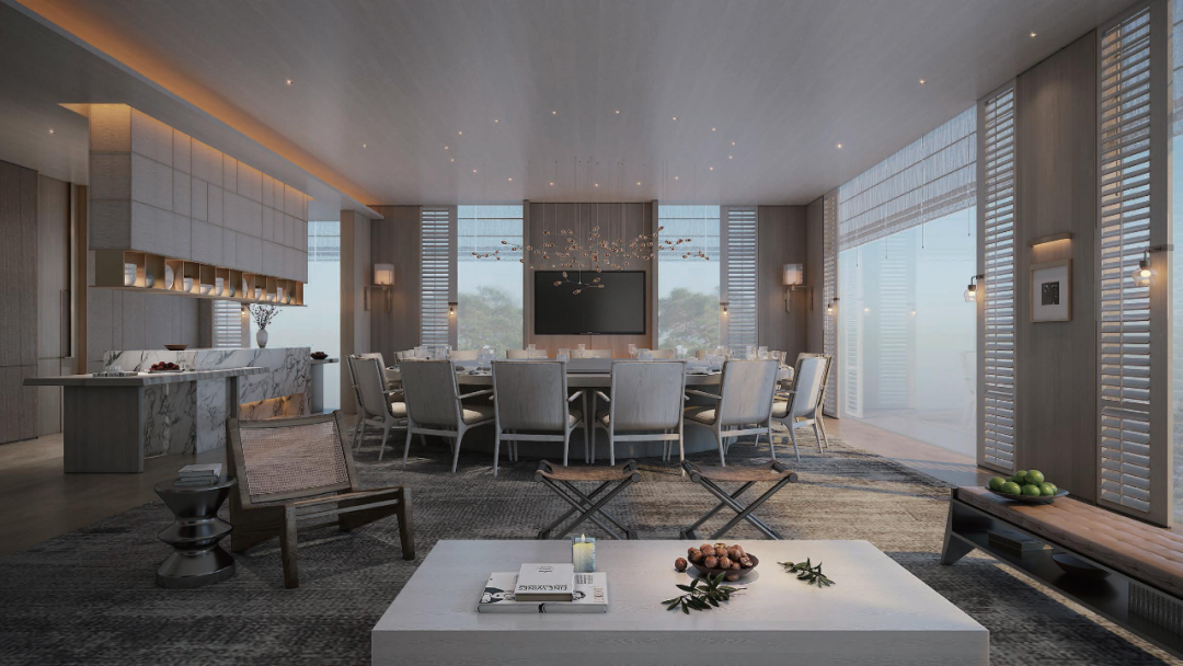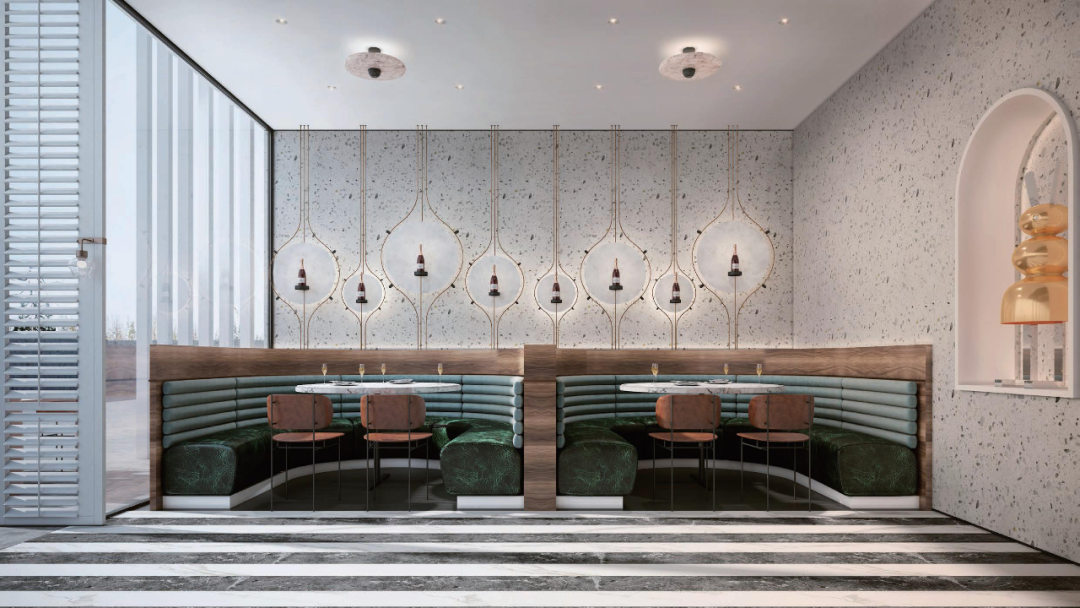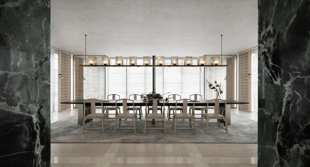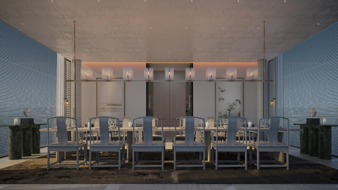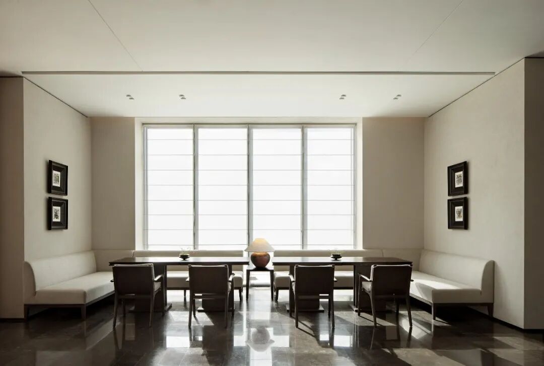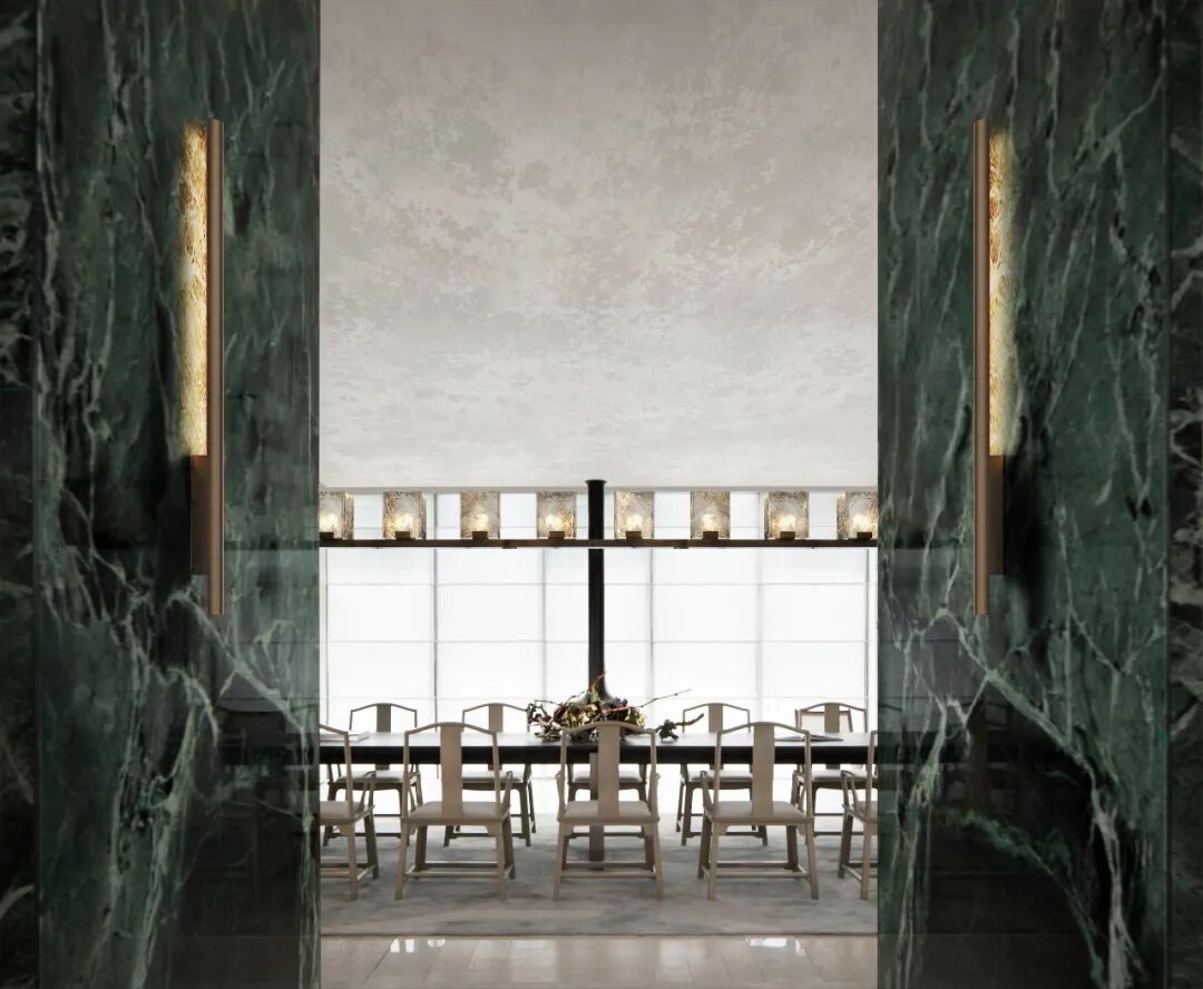 西餐包间仅用绿色石材与其余空间形成区分,家具则在明清风骨上做简化、增加现代感,融于酒店的整体叙事。