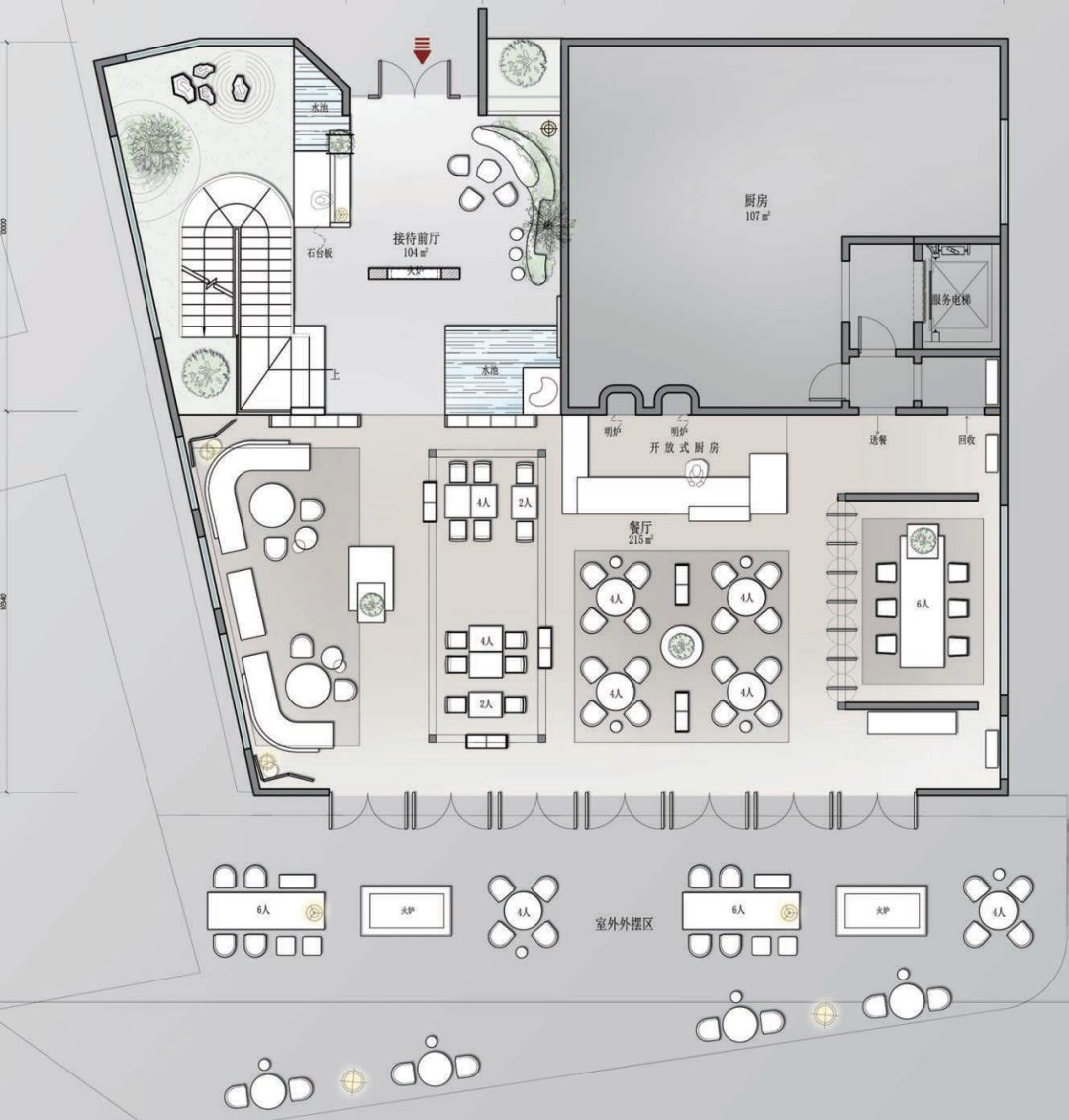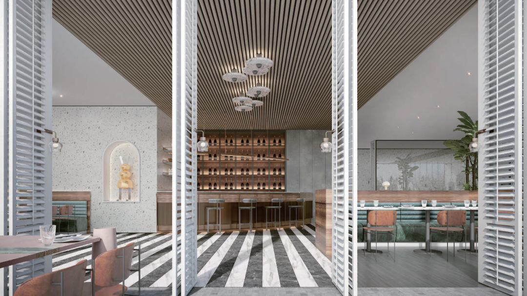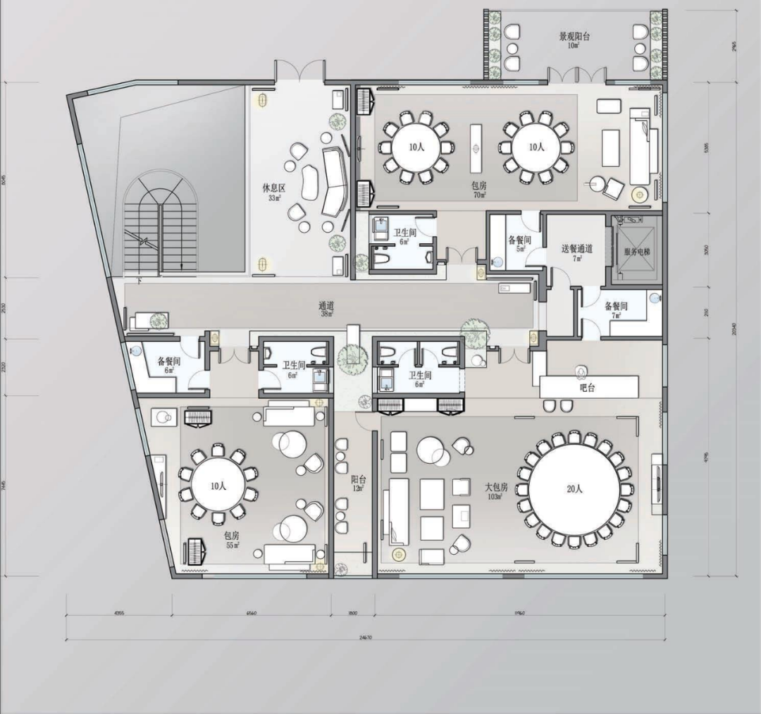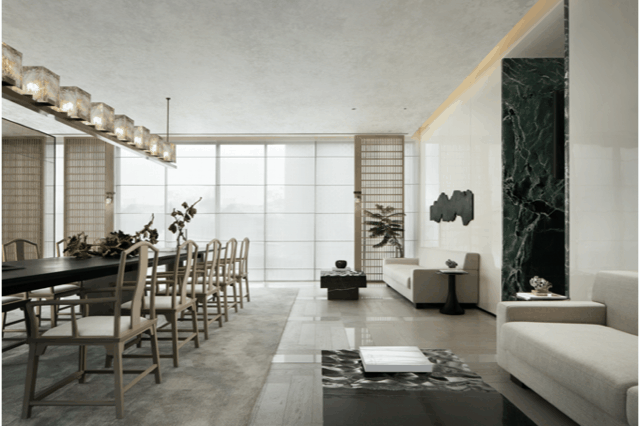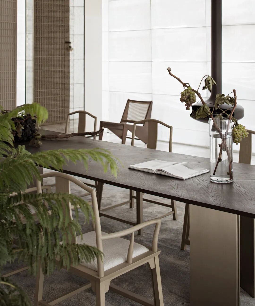 西餐包间仅用绿色石材与其余空间形成区分,家具则在明清风骨上做简化、增加现代感,融于酒店的整体叙事。