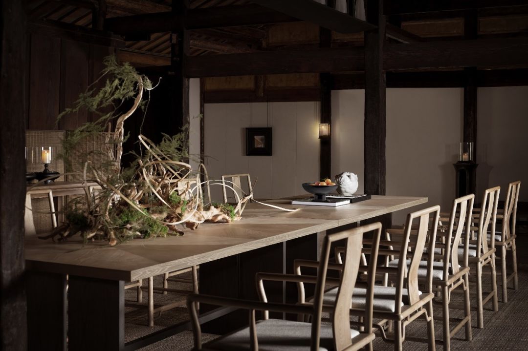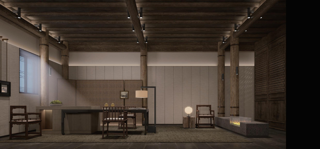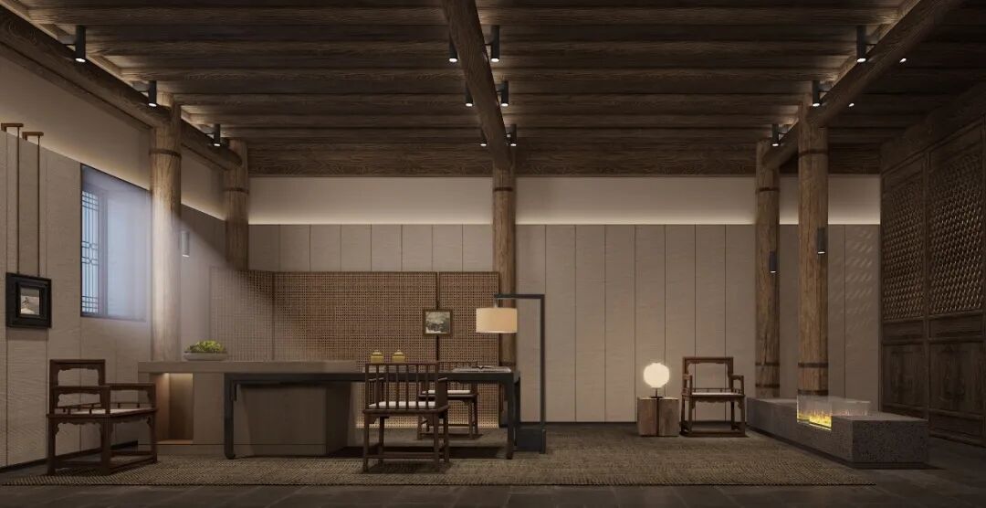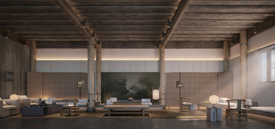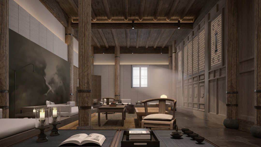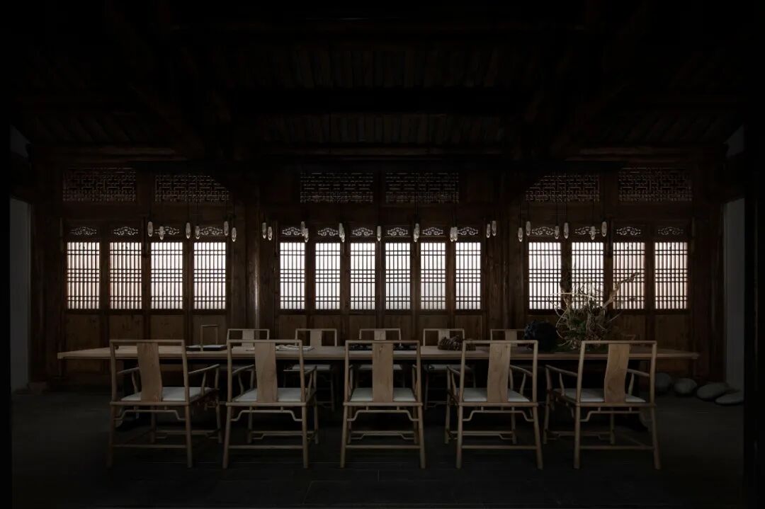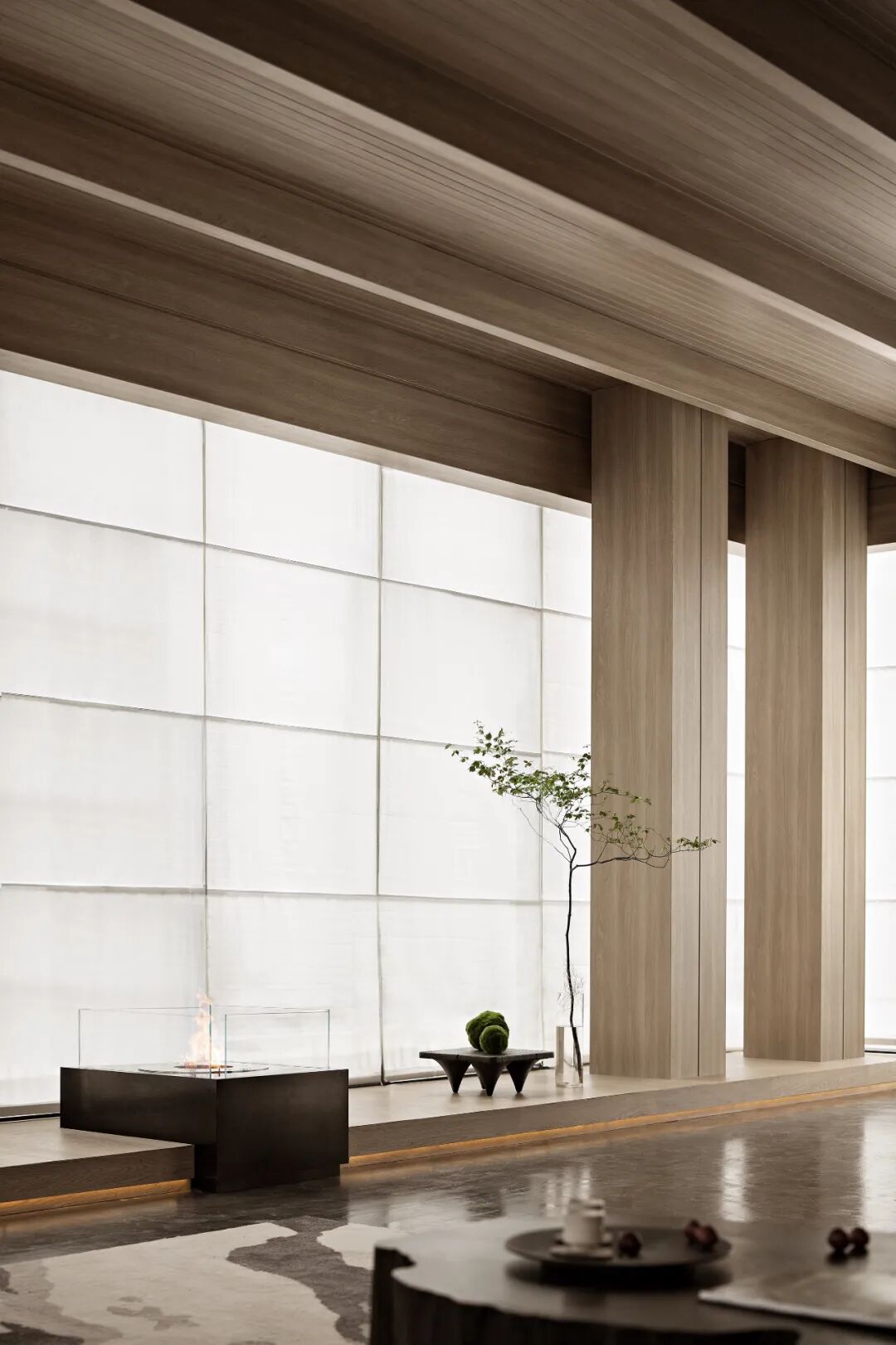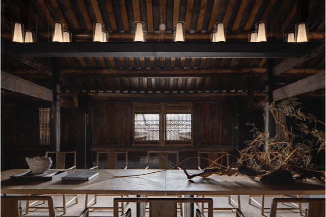 墙面的瓦片装饰画、树枝状的灯具、“石缝间长出”的长桌……自然与历史的形态勾勒空间,于古色古韵中浅尝萦绕齿间的茗香。茶室与之隔廊相对,沐浴在周围的景观之中。