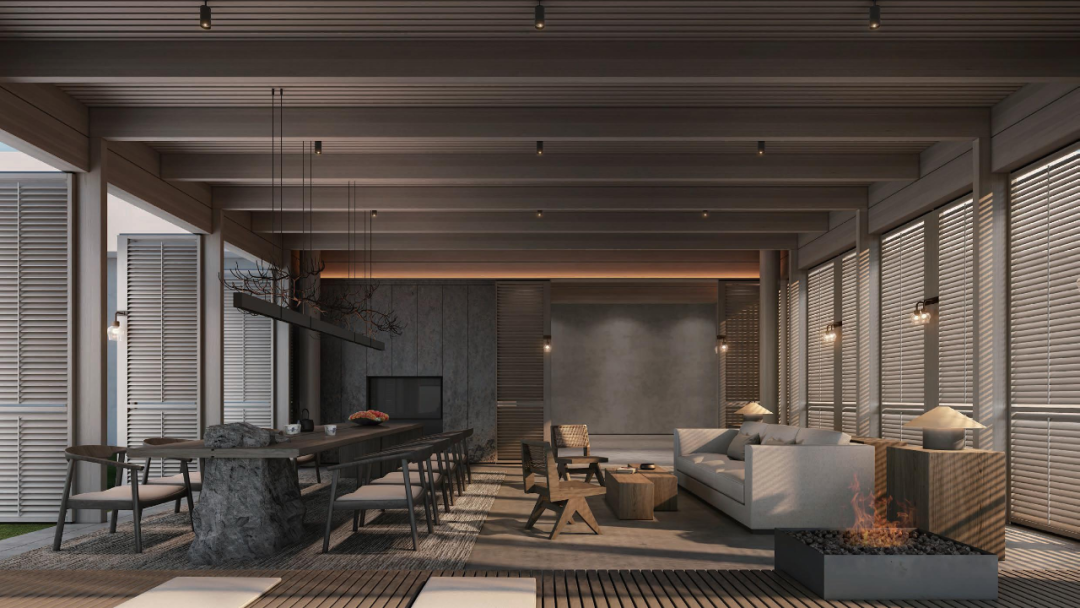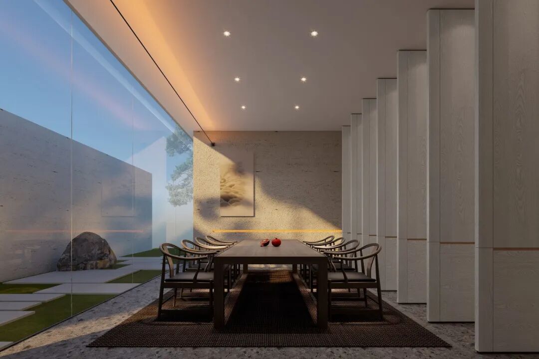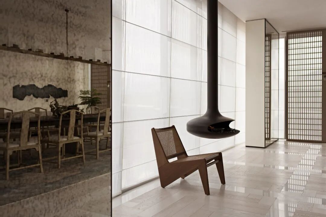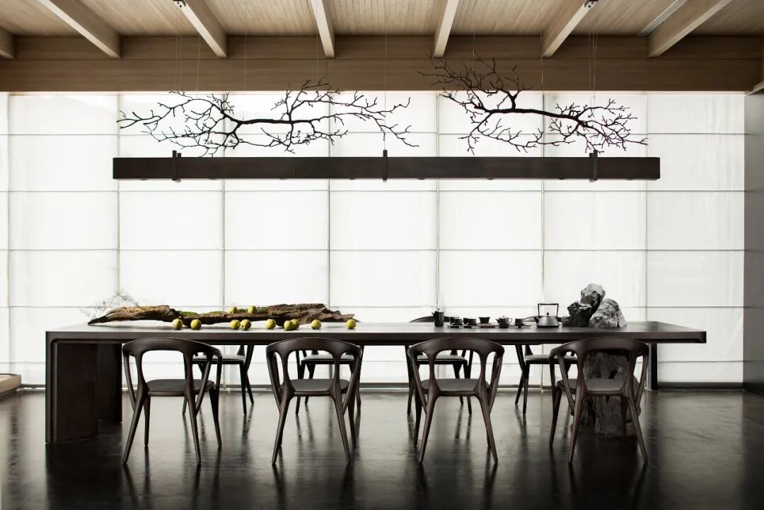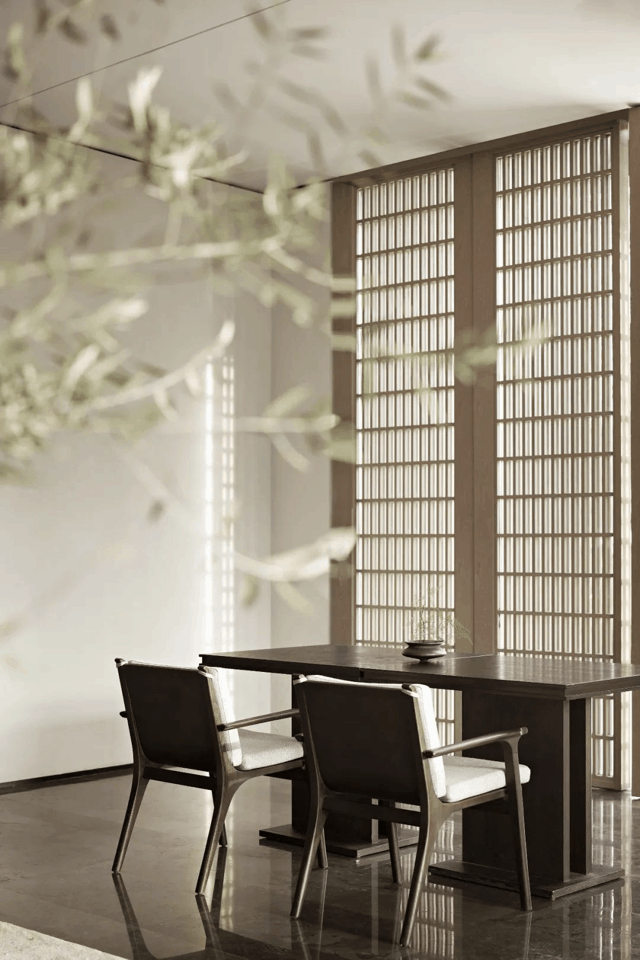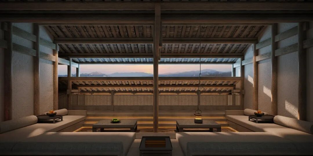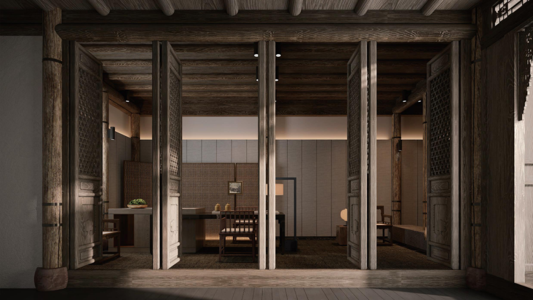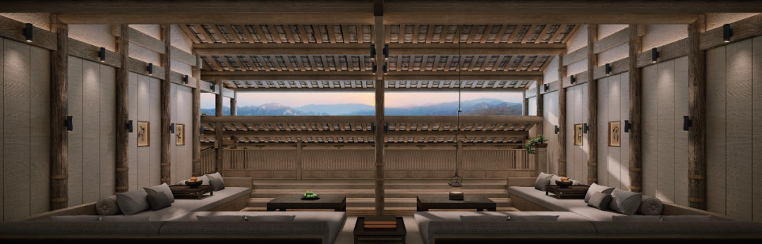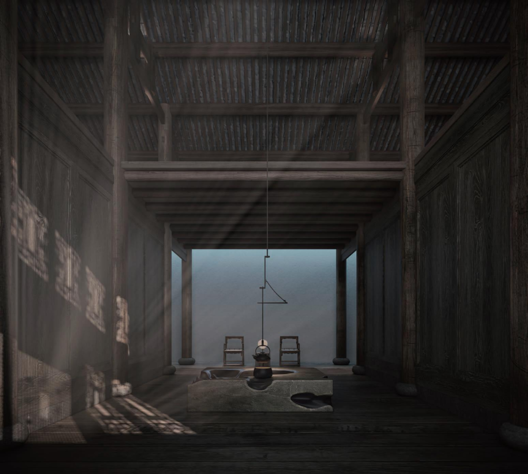 墙面的瓦片装饰画、树枝状的灯具、“石缝间长出”的长桌……自然与历史的形态勾勒空间,于古色古韵中浅尝萦绕齿间的茗香。茶室与之隔廊相对,沐浴在周围的景观之中。