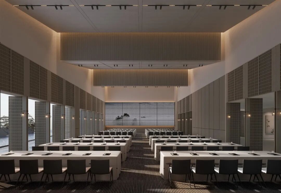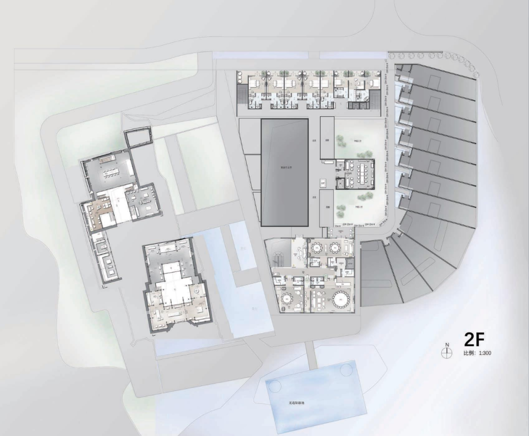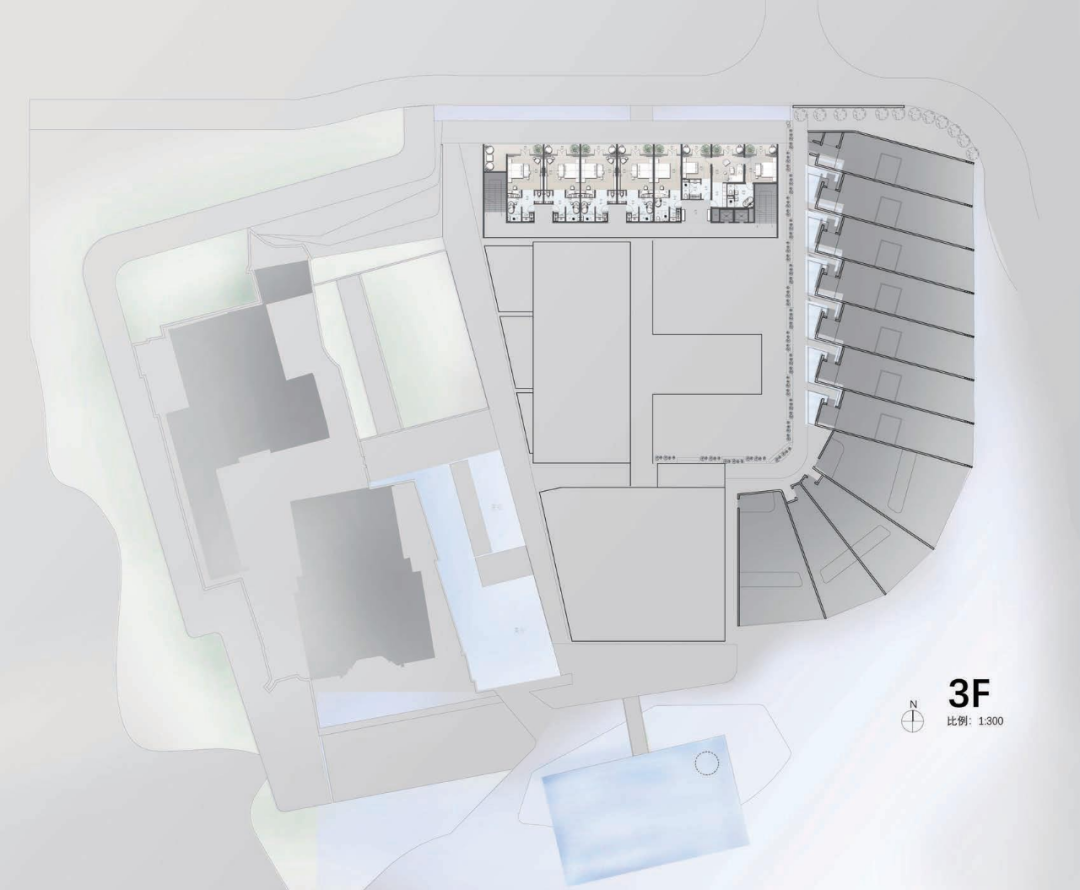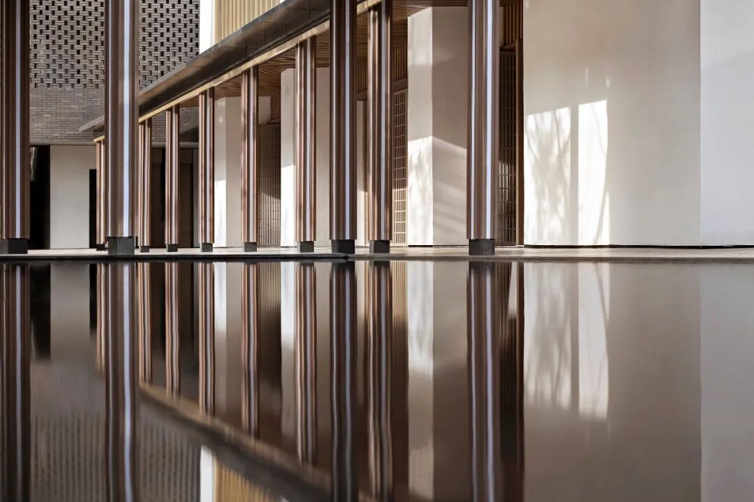 贴着老建筑的山墙面,一条亲水过廊将人引至新建筑,即酒店的主体。古法构图、现代设计,IDM以青砖为材、以坡屋为顶、以日光为媒,希望新与旧之间具有率性的反差,又有和谐的美感。
