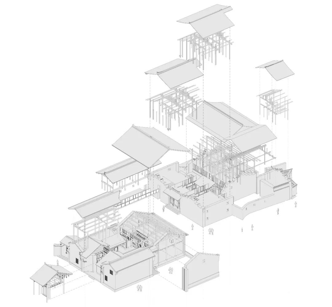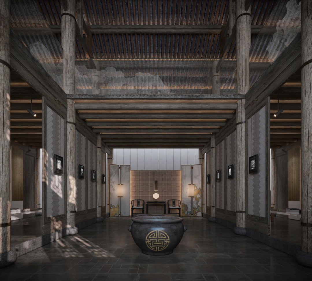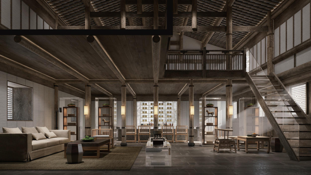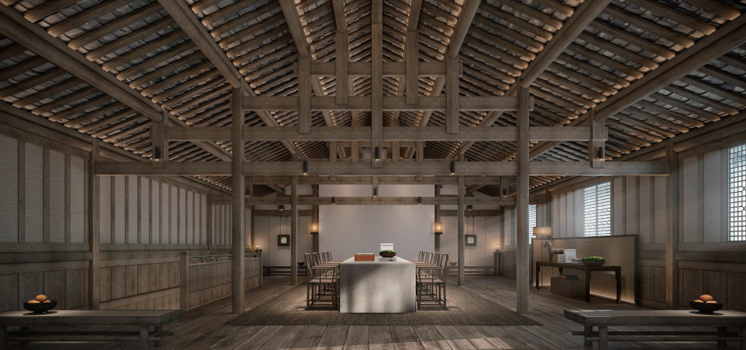 设计以府邸为序厅,保留历史建筑的灵魂,依其原貌进行结构修复。拆除无用的隔断,还原建筑的窗扇并将屋架露明,用玻璃瓦替换部分瓦片,空间便能迎接西昌阳光的照拂。