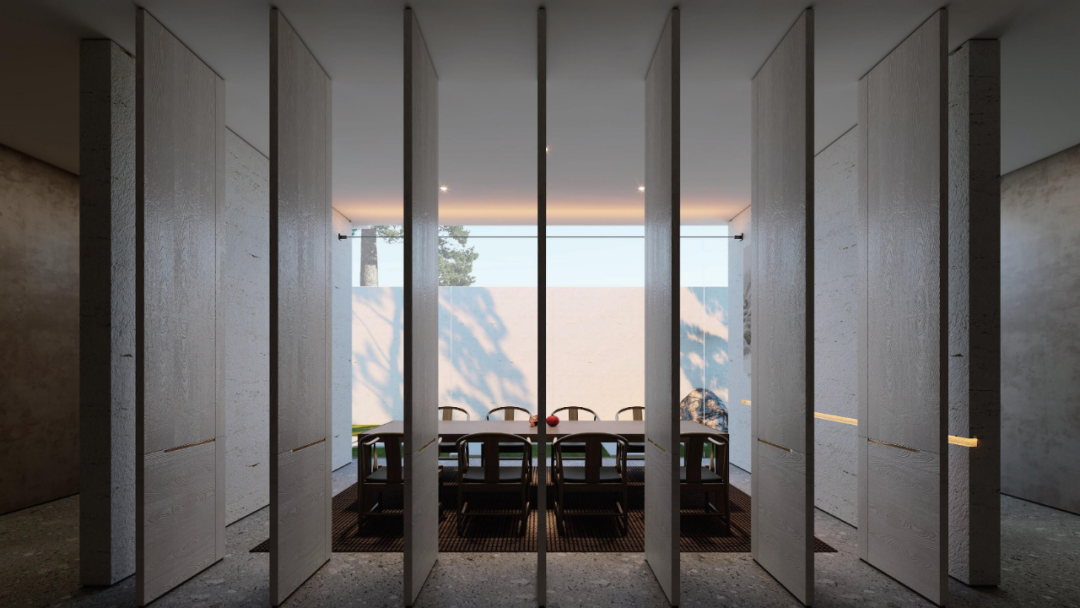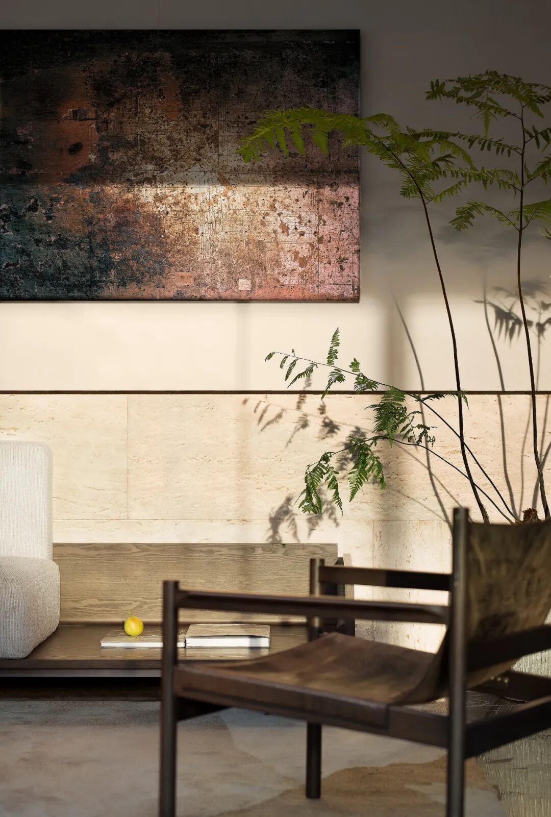 中式餐厅包间,可看老宅,洞石墙面效仿着夯土的肌理,与老建筑的纹理遥相呼应,又在与火山岩、木材的变化间配合西昌洁净的阳光丰富了空间的层次。