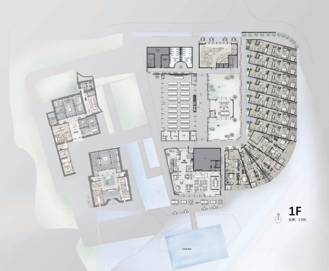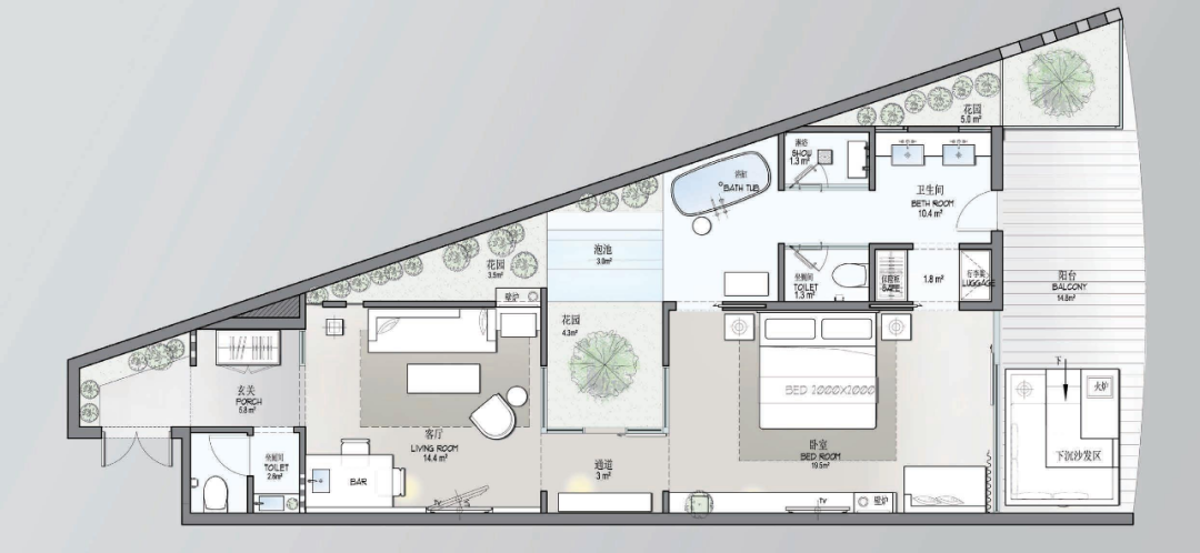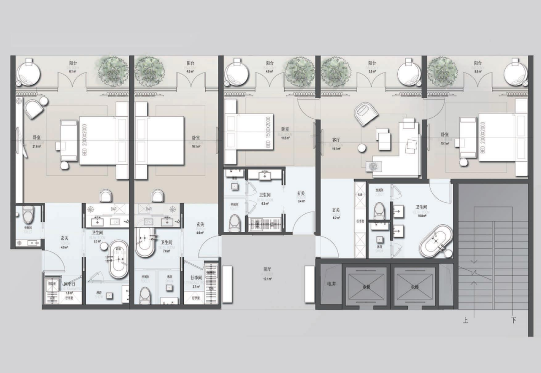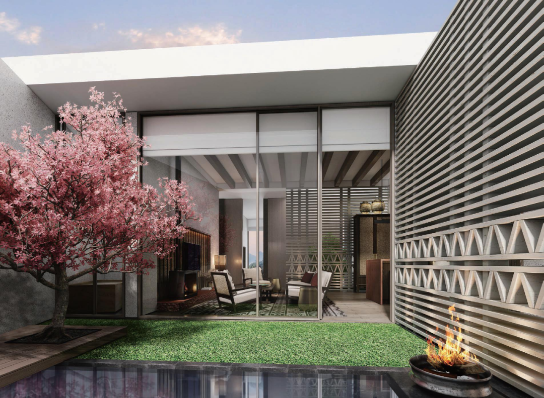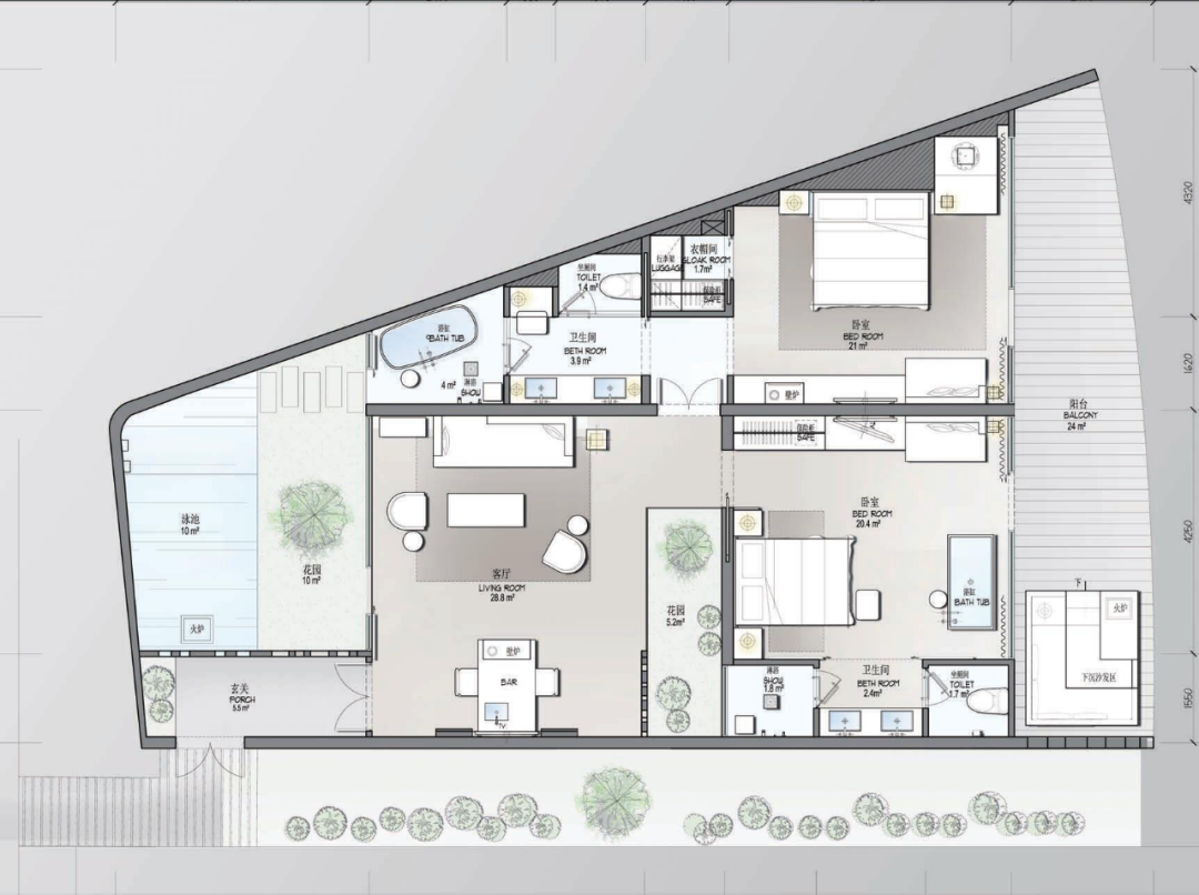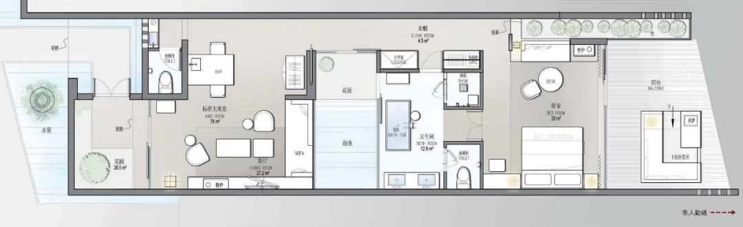 设计师将套房沿着场地中最佳景观面布置,感受出尘忘俗的幽静。