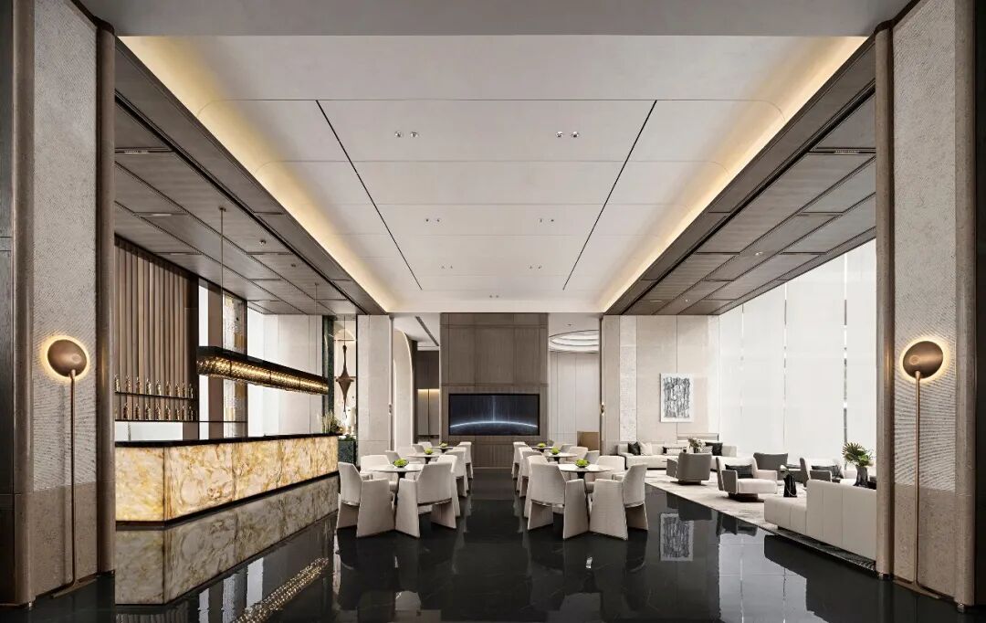 水吧区与洽谈形成一场浪漫的邂逅,光感极强的水吧区在一片宁静的自然色系中加入明黄,塑造强烈的视觉空间印象,艺术品在其间错落摆放,打造出雅致的都会风范。