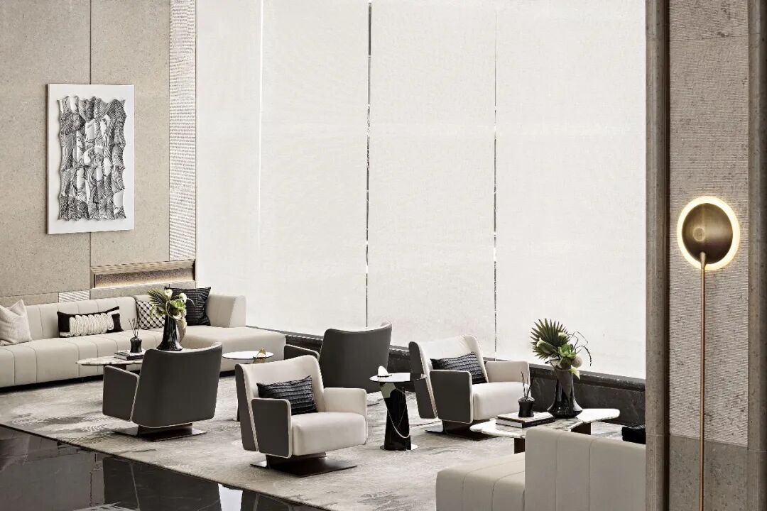 穿过桥厅,进入接待前厅,墨绿纹理大理石接待台为黑白灰主色的空间增添生机活力,天然材质营造空间的自然意境,奢华的金色在其间进行调和,轻奢与品味,艺术与人文的交融,带给访者极强的体验感与仪式感,一种新型的社区关系也正在萌发。