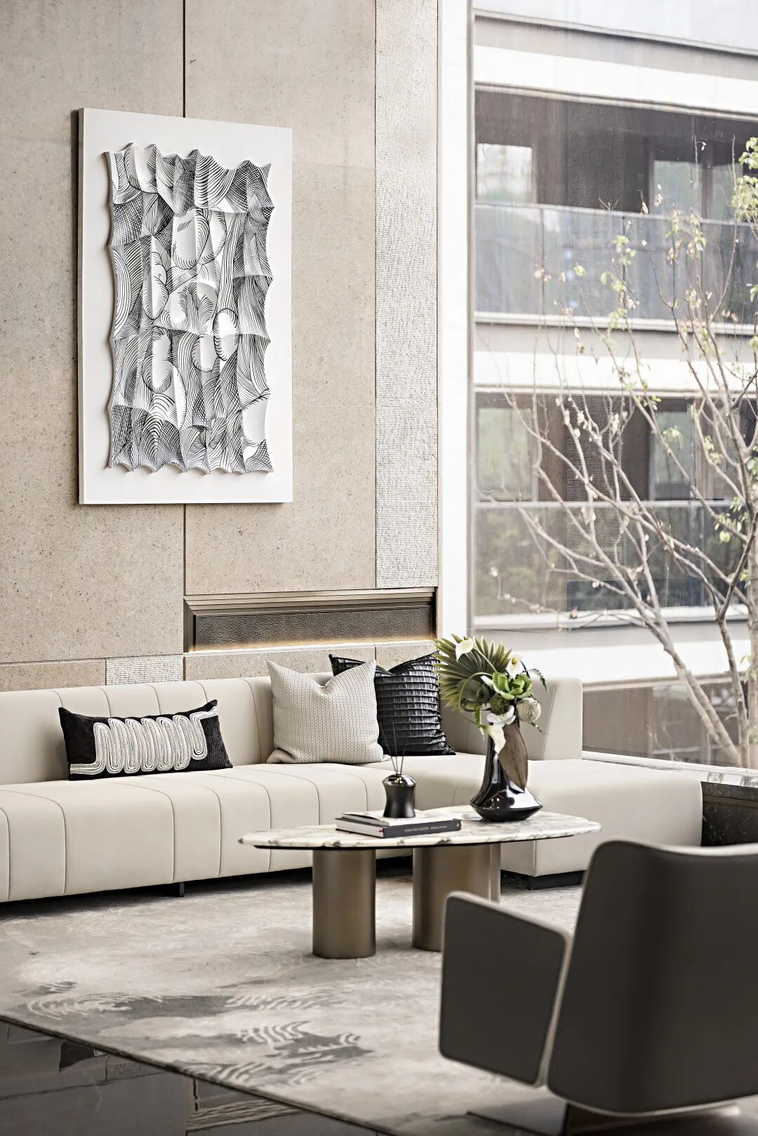 深洽区铺陈都市品质生活画卷,通透的落地窗将户外风景引入室内,表达自然宁静的生活美学,黑白的色调与光线形成有趣的光影互动,具有丰富精神内涵的艺术装饰在空间中有序陈列,营造出一个具有视觉性与品质感的美学空间。