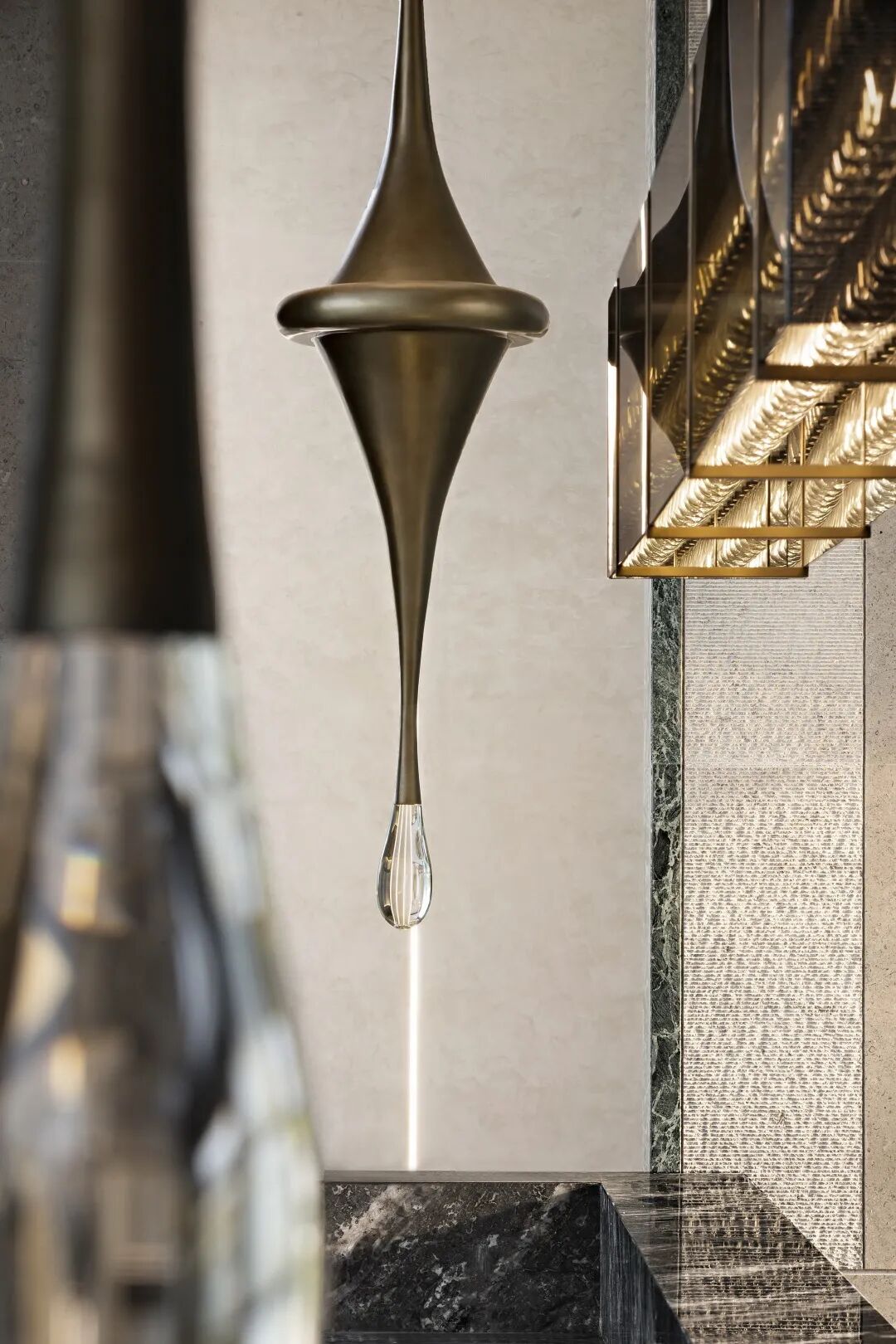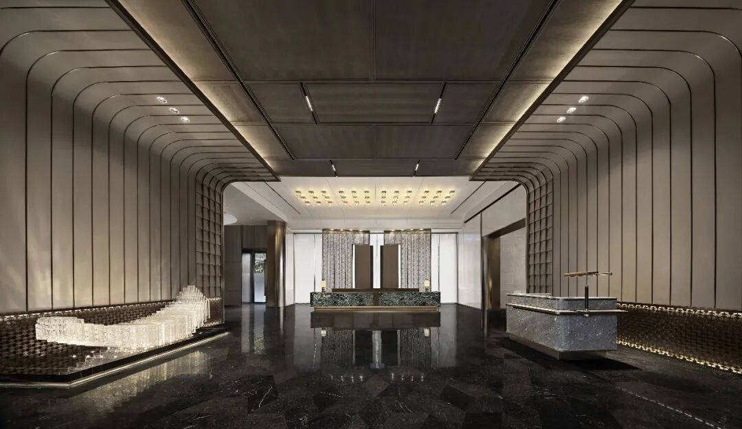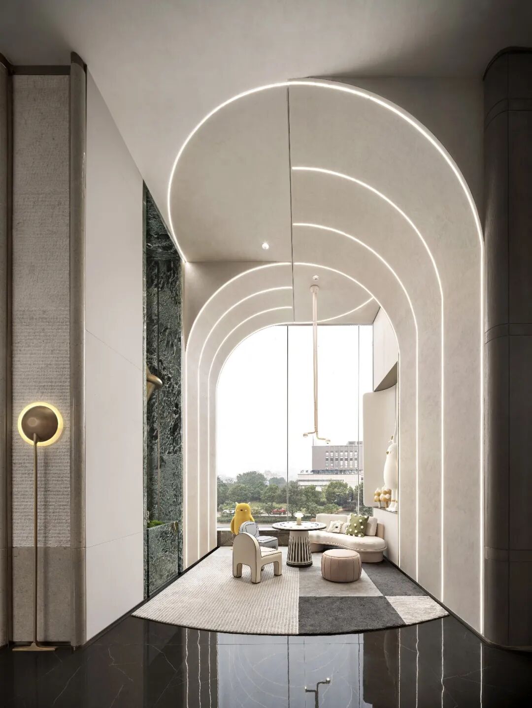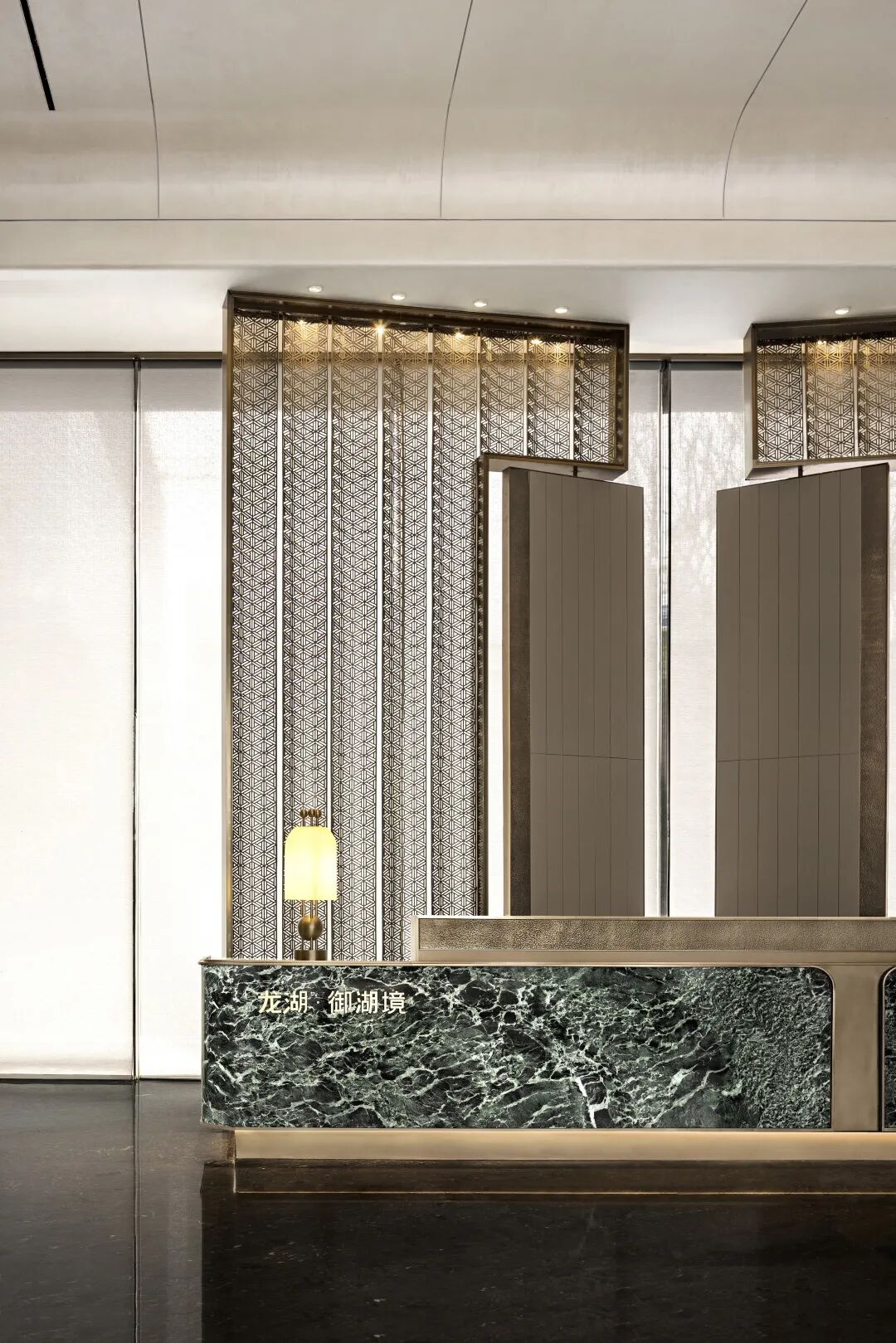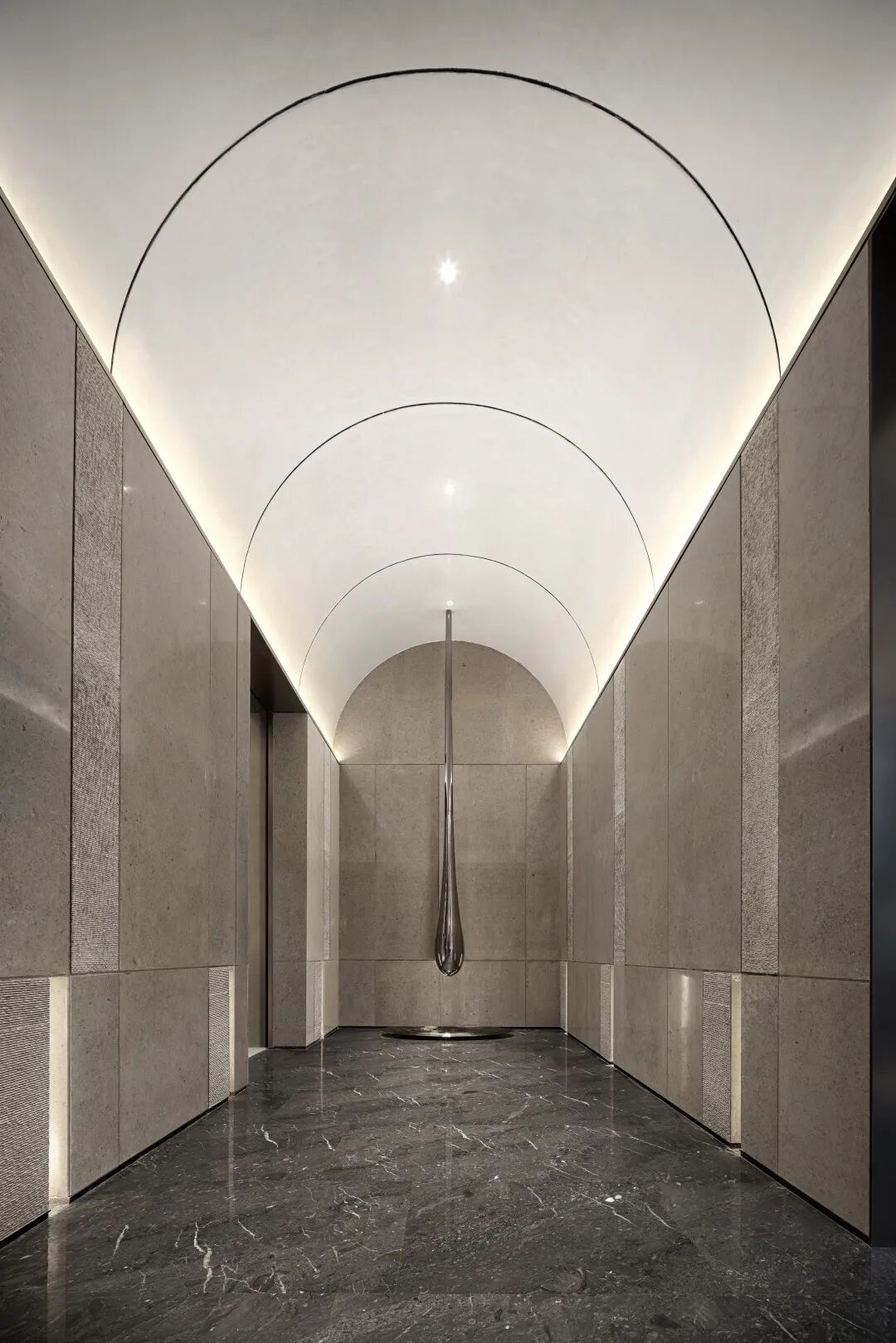 电梯厅延续着怡心湖的近水文化,湖边落水与电梯厅硬装纹样相互呼应, 水滴型艺术装置传承人文记忆,在遵循当代主义的简约调性之余,重塑生活之美。