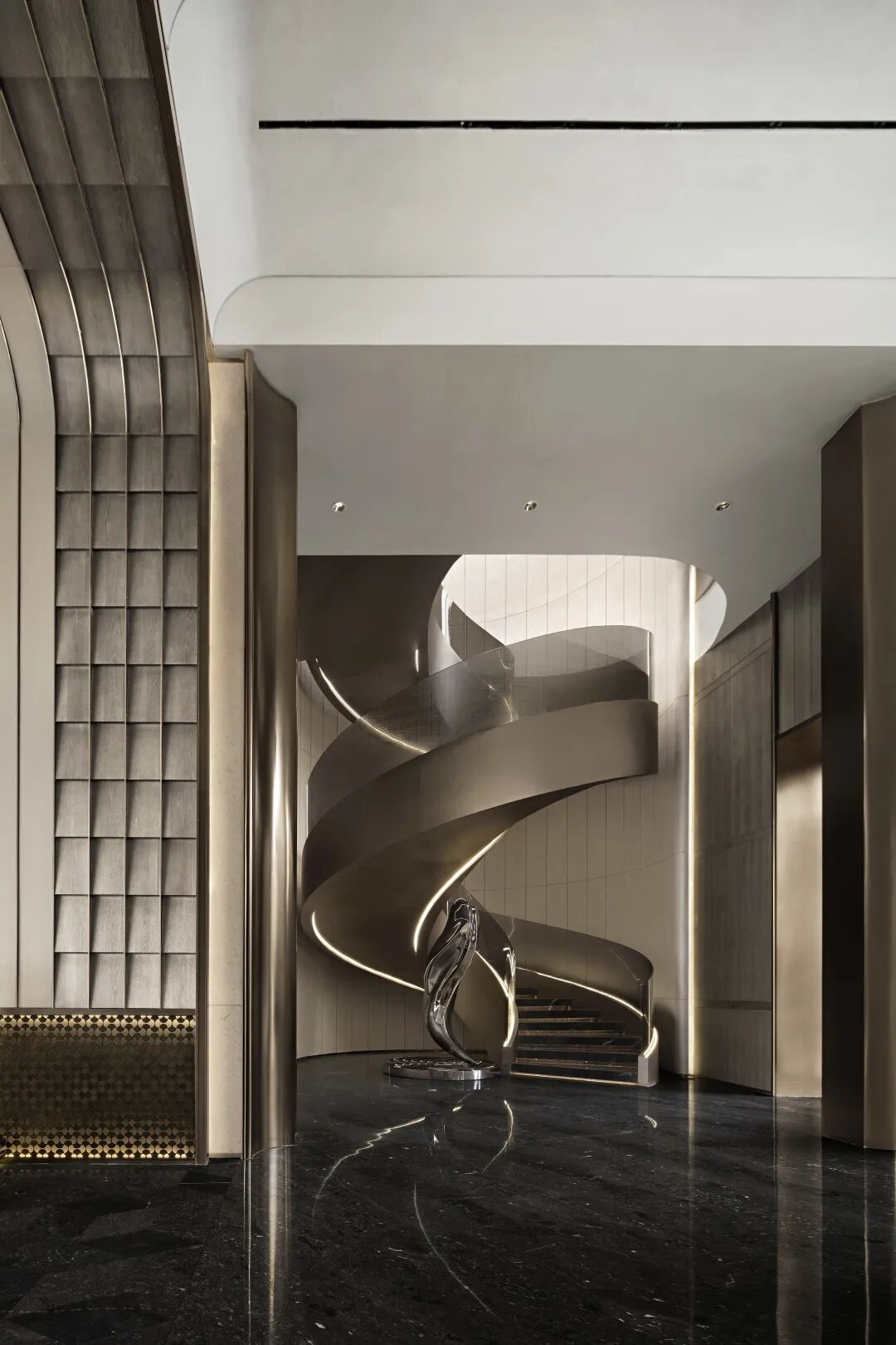 螺旋艺术楼梯既是承接上下的桥梁,也是空间中的艺术装置,舞动的旋律呈现升腾而上的艺术精神,古铜色金属材质显现出厚重的历史感,灯光随着楼梯渐次铺陈,静谧优雅又充满着艺术的气息。
