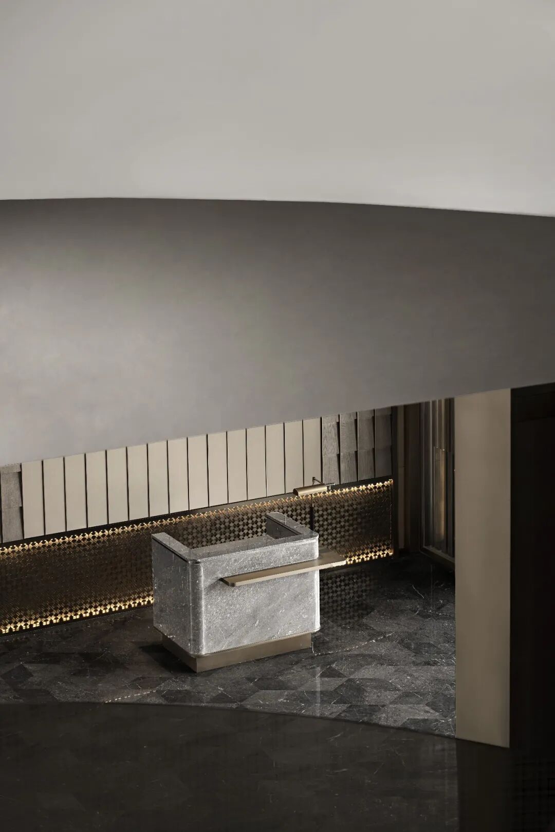 弧线延展空间的韵律营造仪式感,桥厅另一侧设置了一个游客接待处,打造高奢酒店式的观感体验,黑白灰石材用古铜色金属进行点缀,提升空间的质感,彰显尊贵享受的格调。
