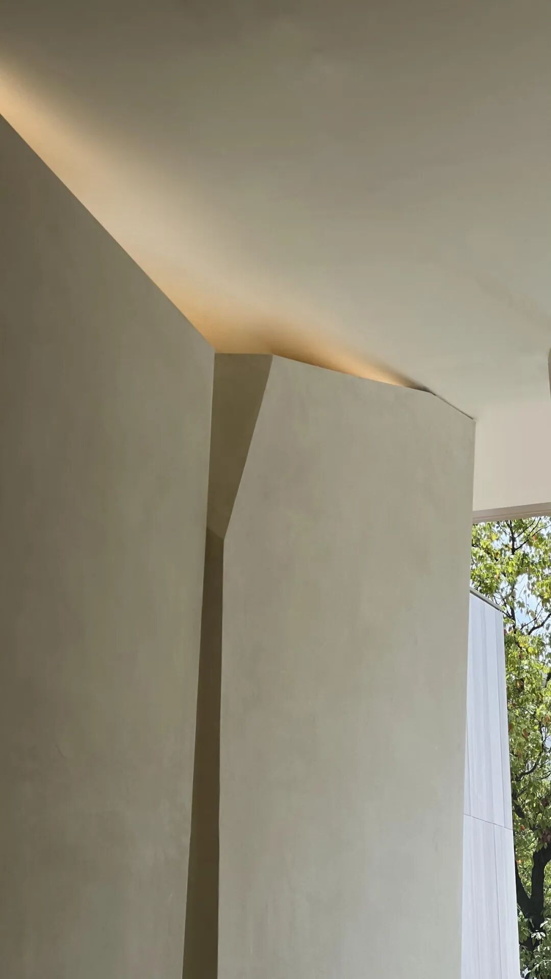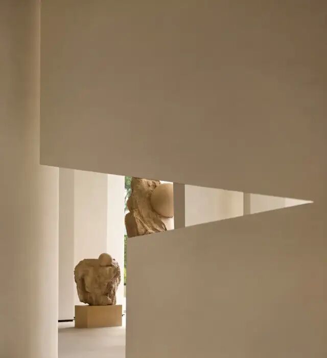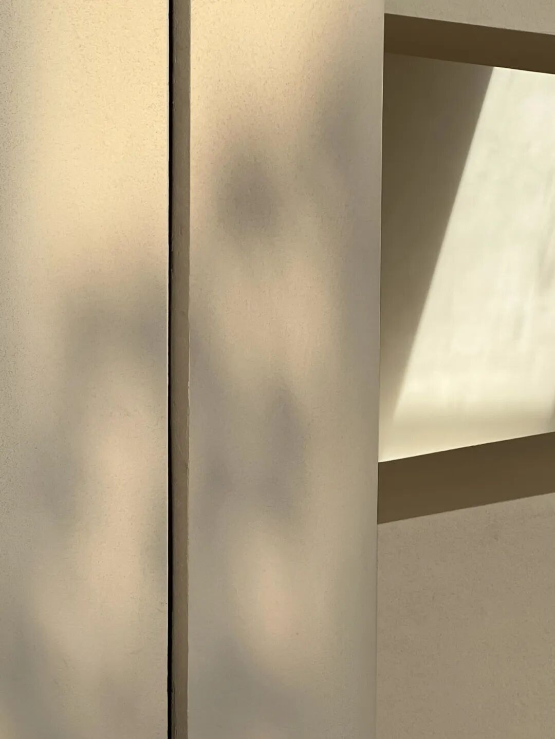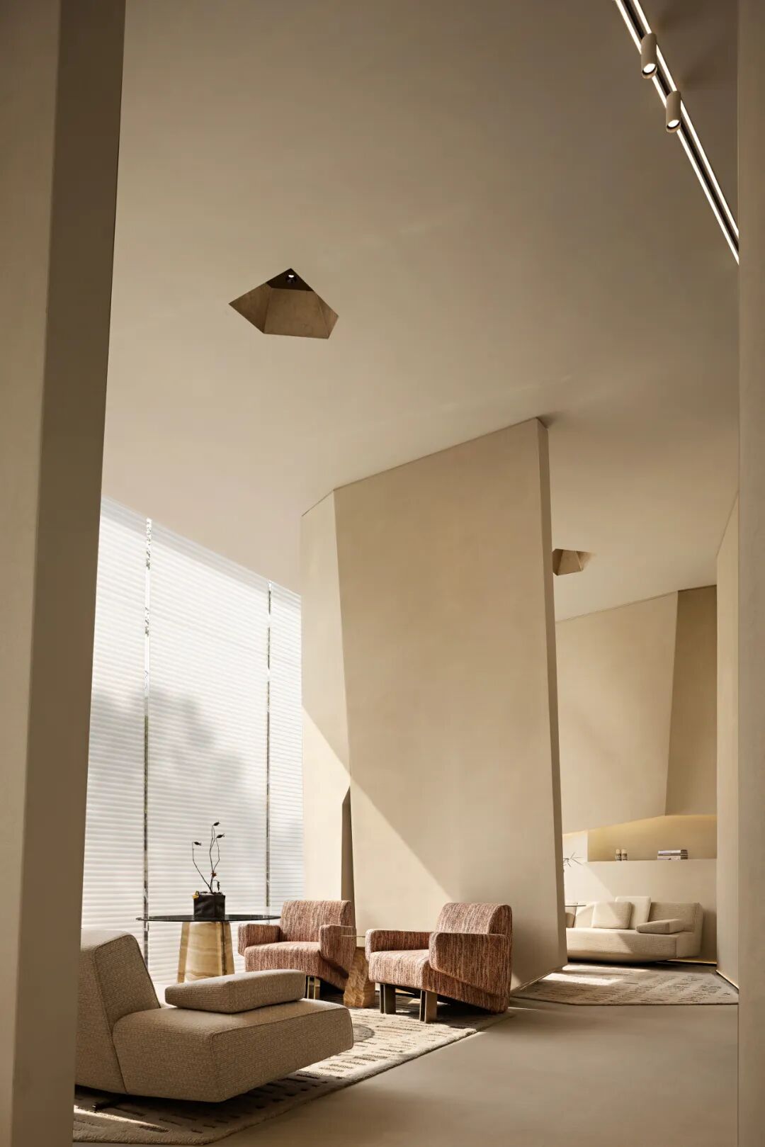 日光沿着一个缓坡下落到空间内部,它沿着斜墙向地面靠近,直到到达空间的地面,穿过墙面上的缝隙游走在空间当中。