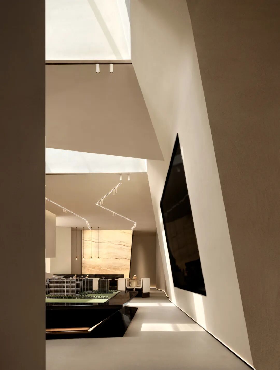 在整个生活馆中,人们的体验在氛围、光线和质感方面的明显差异之间取得平衡,从隐匿在山谷顶上的天光到光线充足的临水洽谈区,上升与下降,内部与外部、地面与天空或城市与自然之间的并列,唤起类似山谷游玩的相似感受。