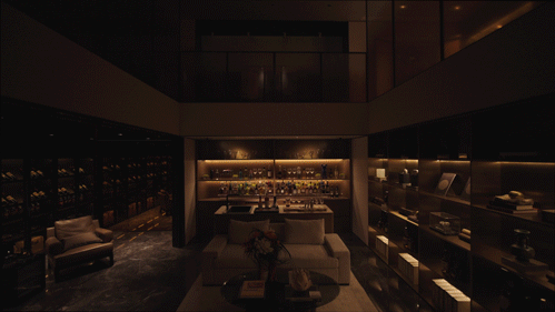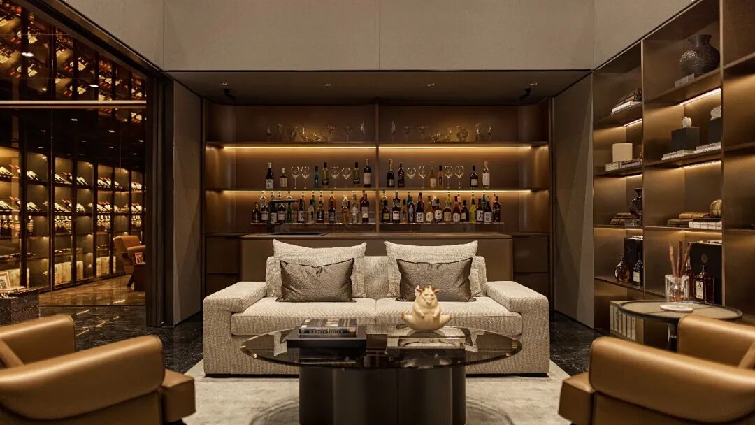 酒窖里摇晃着琳琅满目的红酒,镜面式的处理叠加了空间的维度,这无疑是圈层文化的重要感官呈现,亦是隐于一室之内的富贵人居。