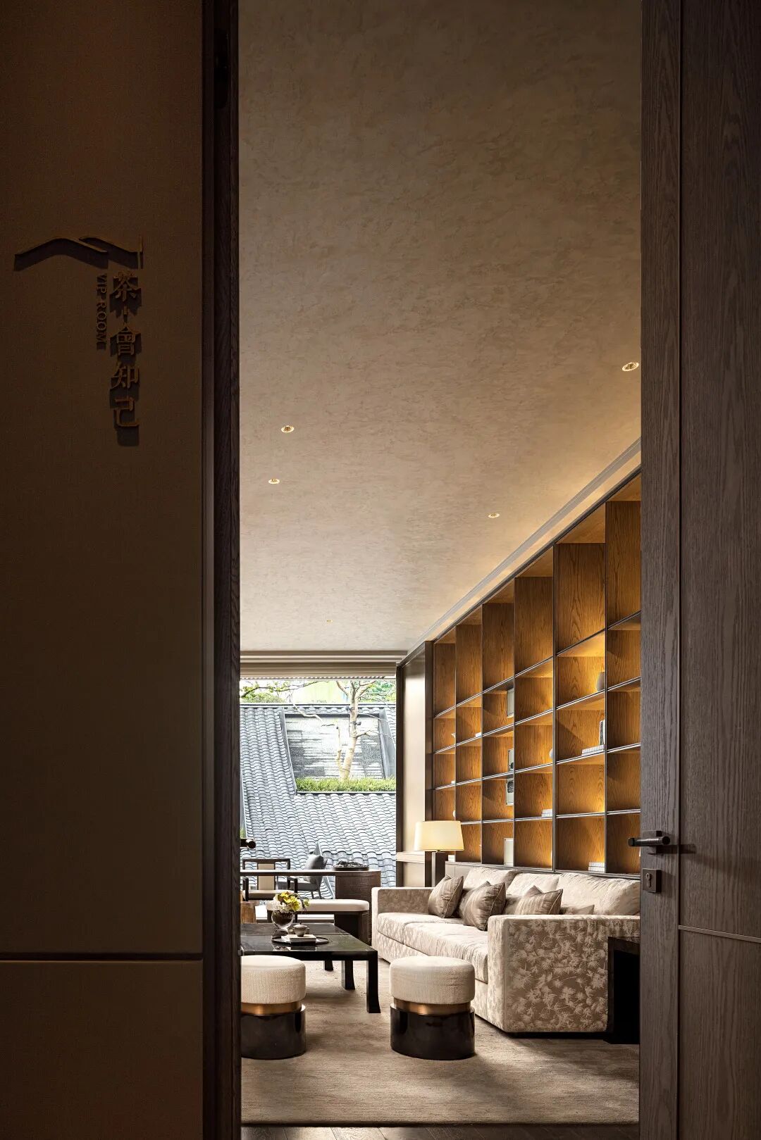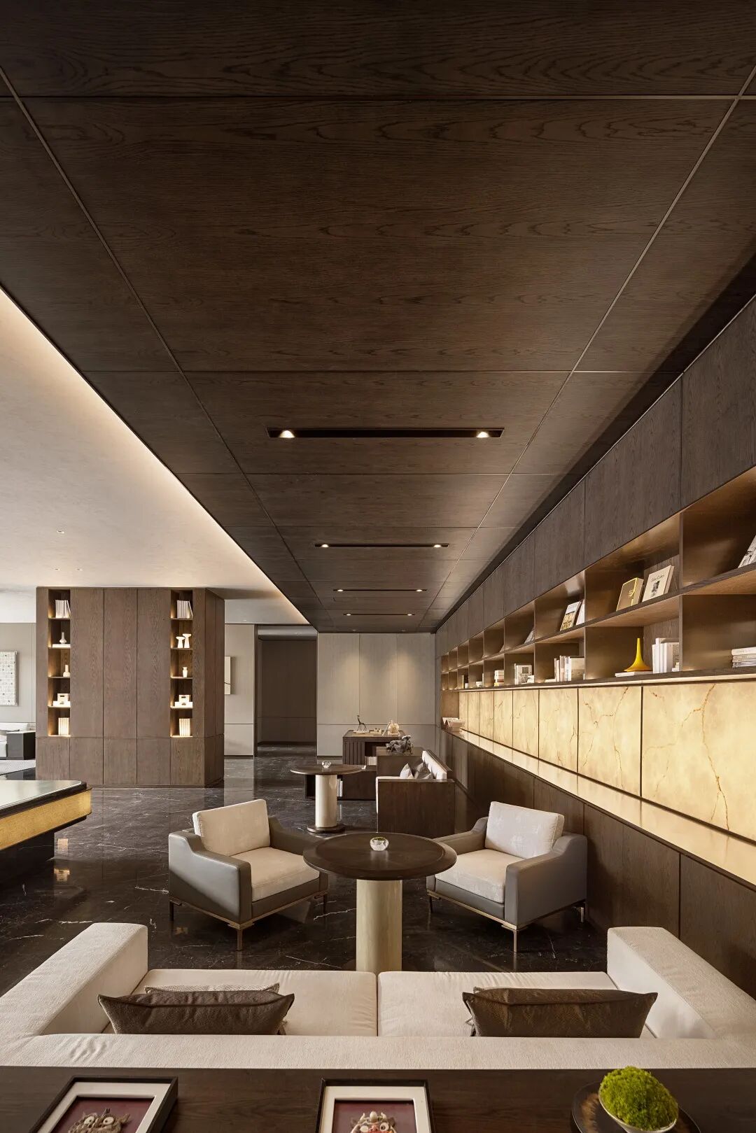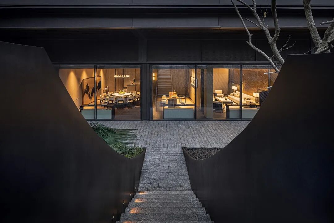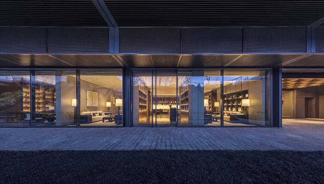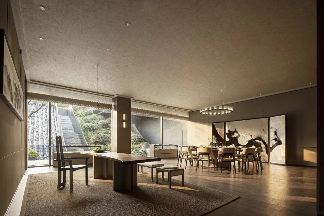 负一层开放洽谈区向室外无限延伸,室内宁静温润的内涵与室外草木园林的气韵相得益彰,既保有兼收并蓄的态度,又释放出东方美学的演绎。