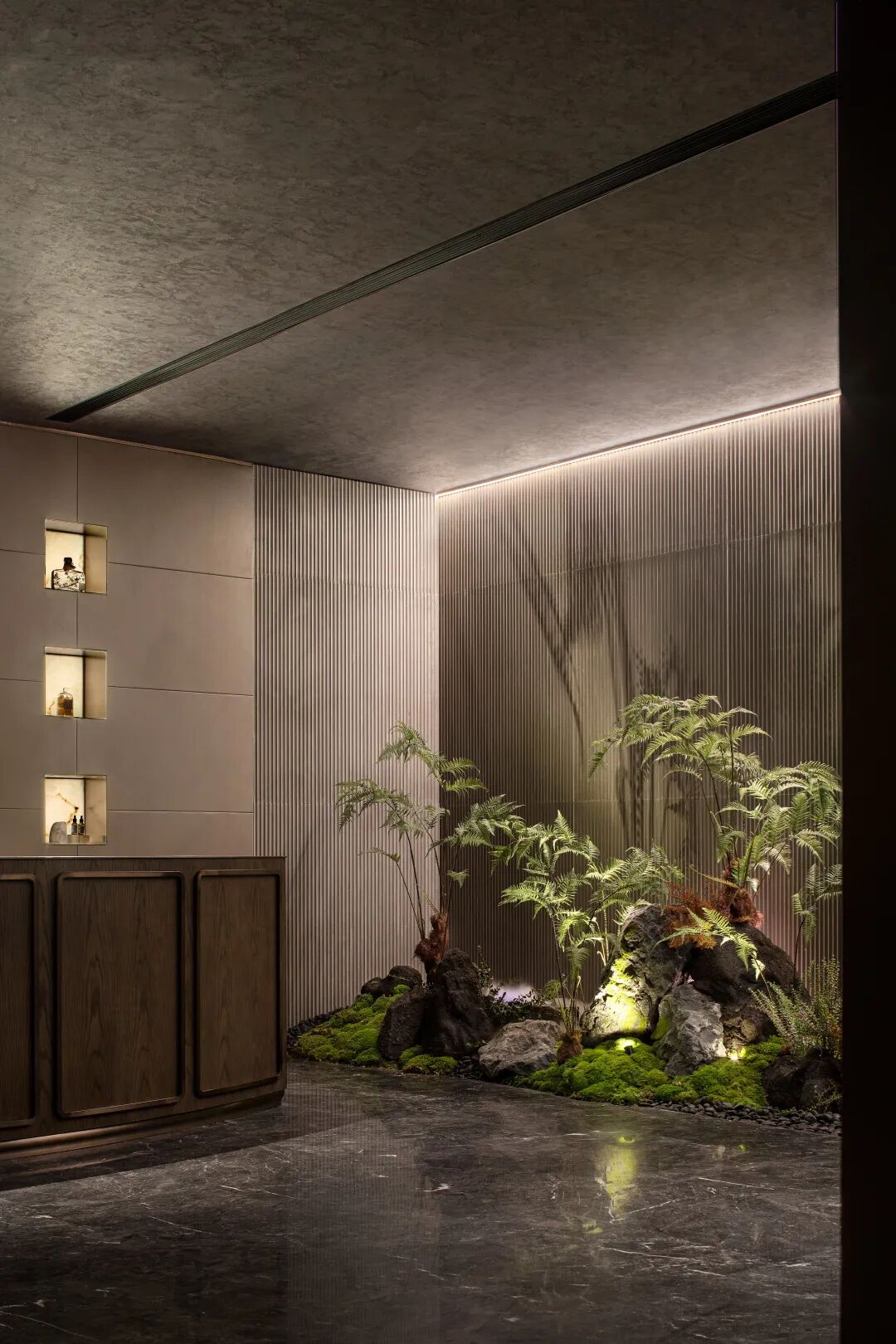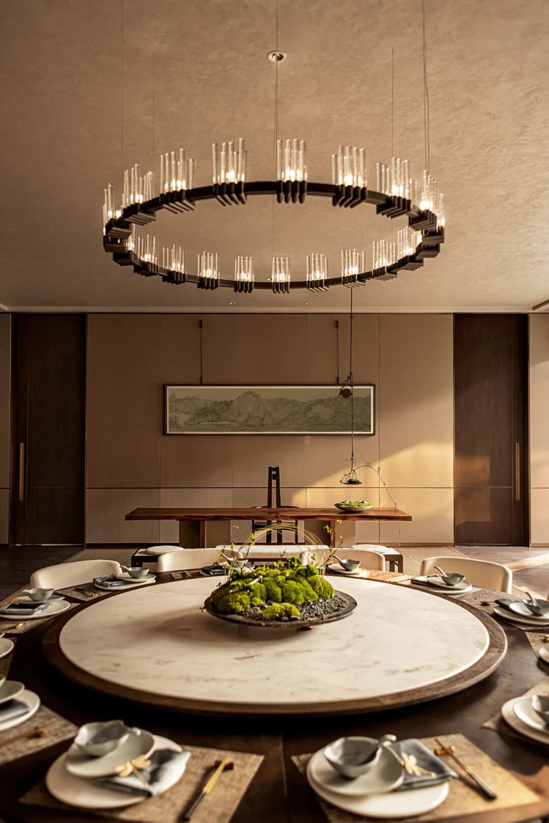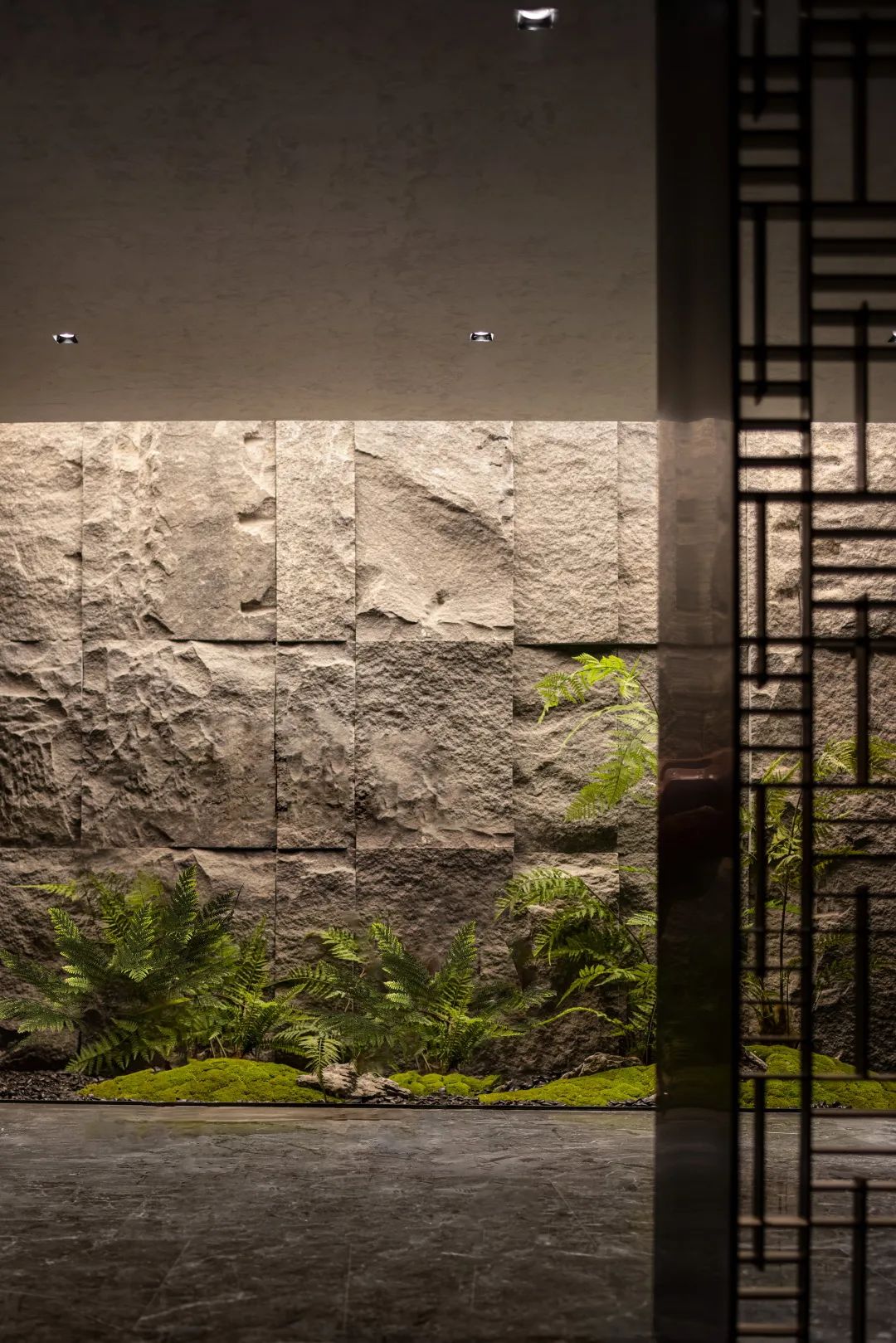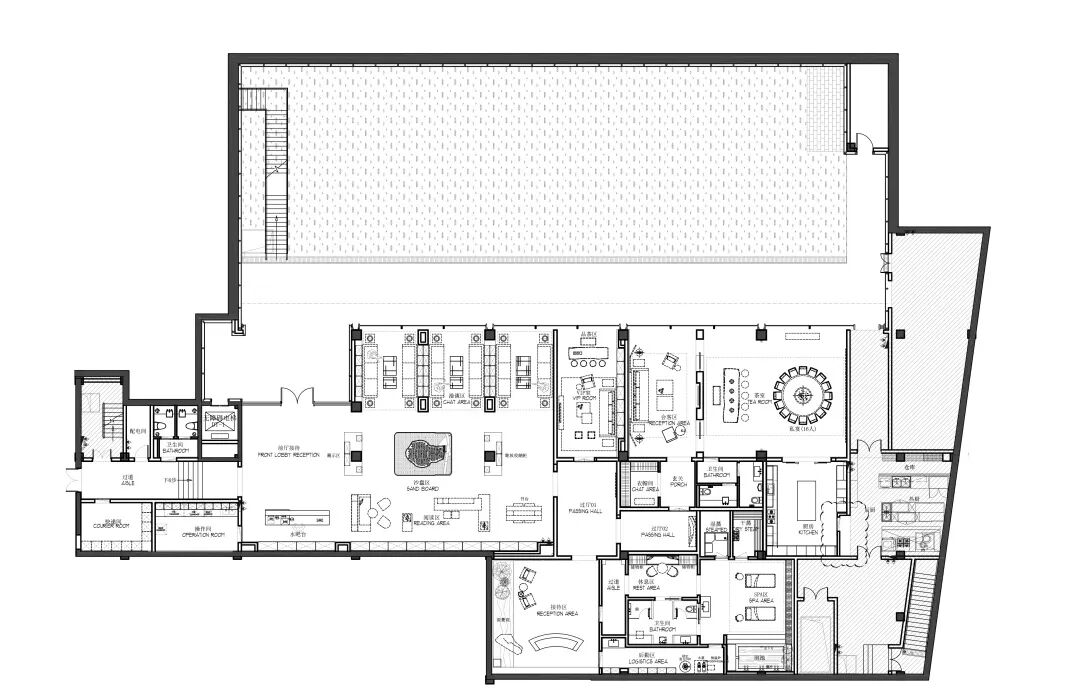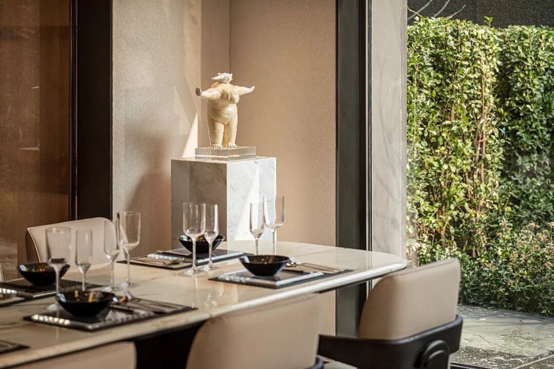 负一层开放洽谈区向室外无限延伸,室内宁静温润的内涵与室外草木园林的气韵相得益彰,既保有兼收并蓄的态度,又释放出东方美学的演绎。
