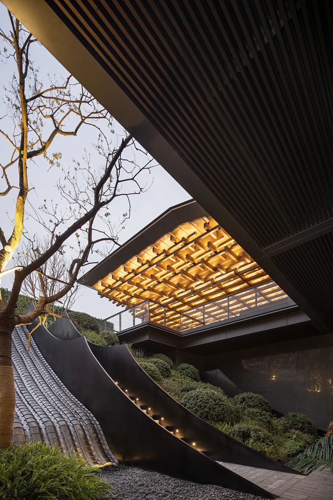 「榫卯结构」作为中国建筑文化的重要代表,咬合紧密,以结构稳定,承重能力而见长。青瓦坡顶下,内敛实用的结构显得稳重而庄严,大气磅礴。
