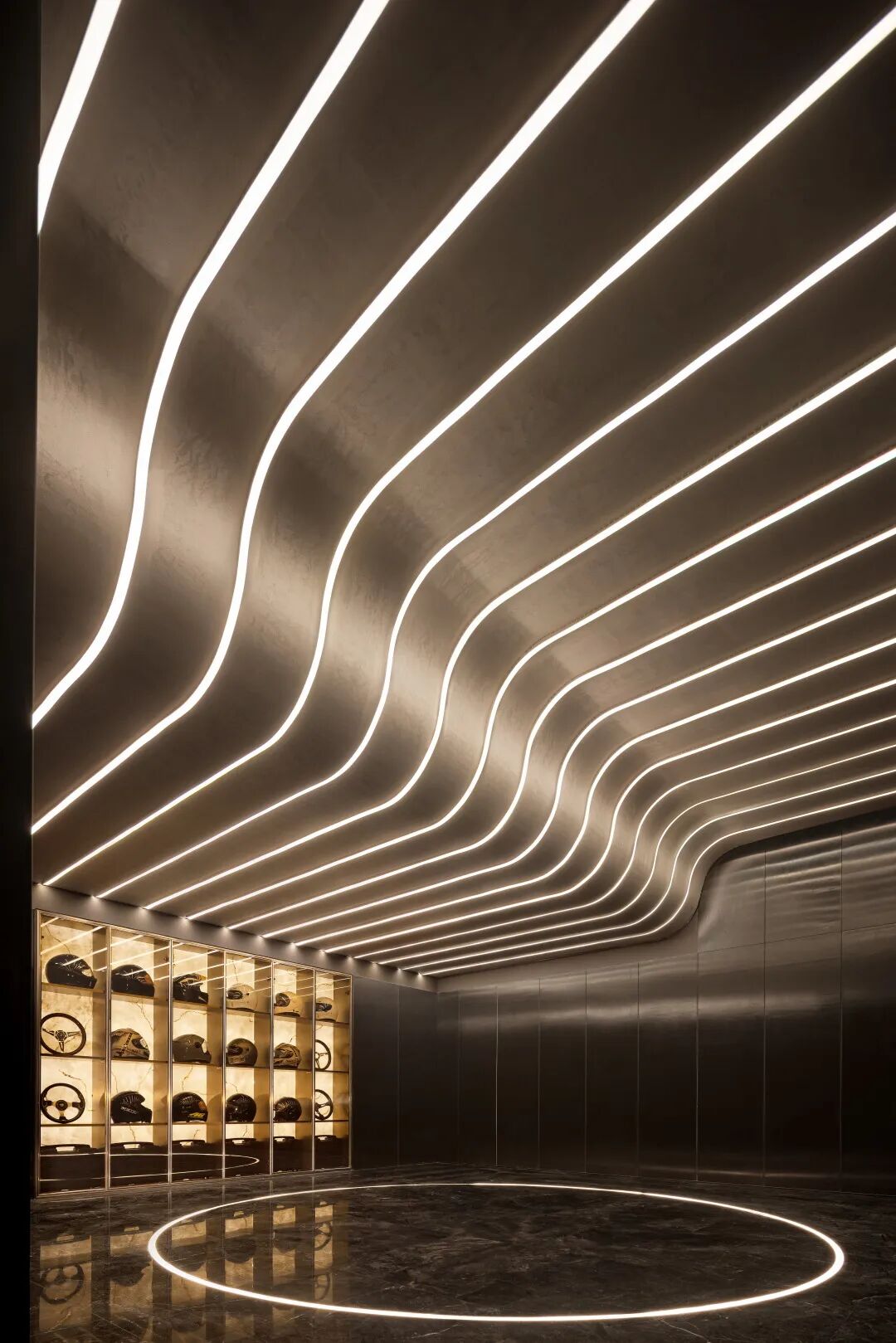 一道道光影流线般地划过车库空间,思维被极大限度地拉大,极富个人彩色和时尚前卫,简洁明了中带来上佳视觉效果。