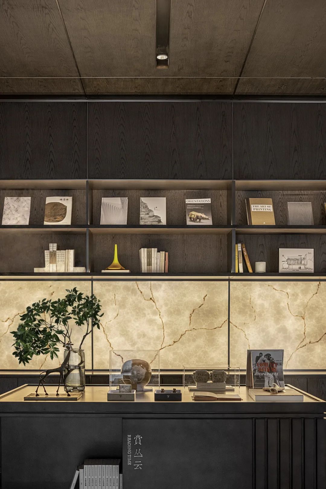 书院作为东方文化的承载,对于场域和精神的传承都具有重要意义。五组阵列式展示柜的排列组合,秩序井然,自由随心,创造出独具一格的书院气质,清净雅致。