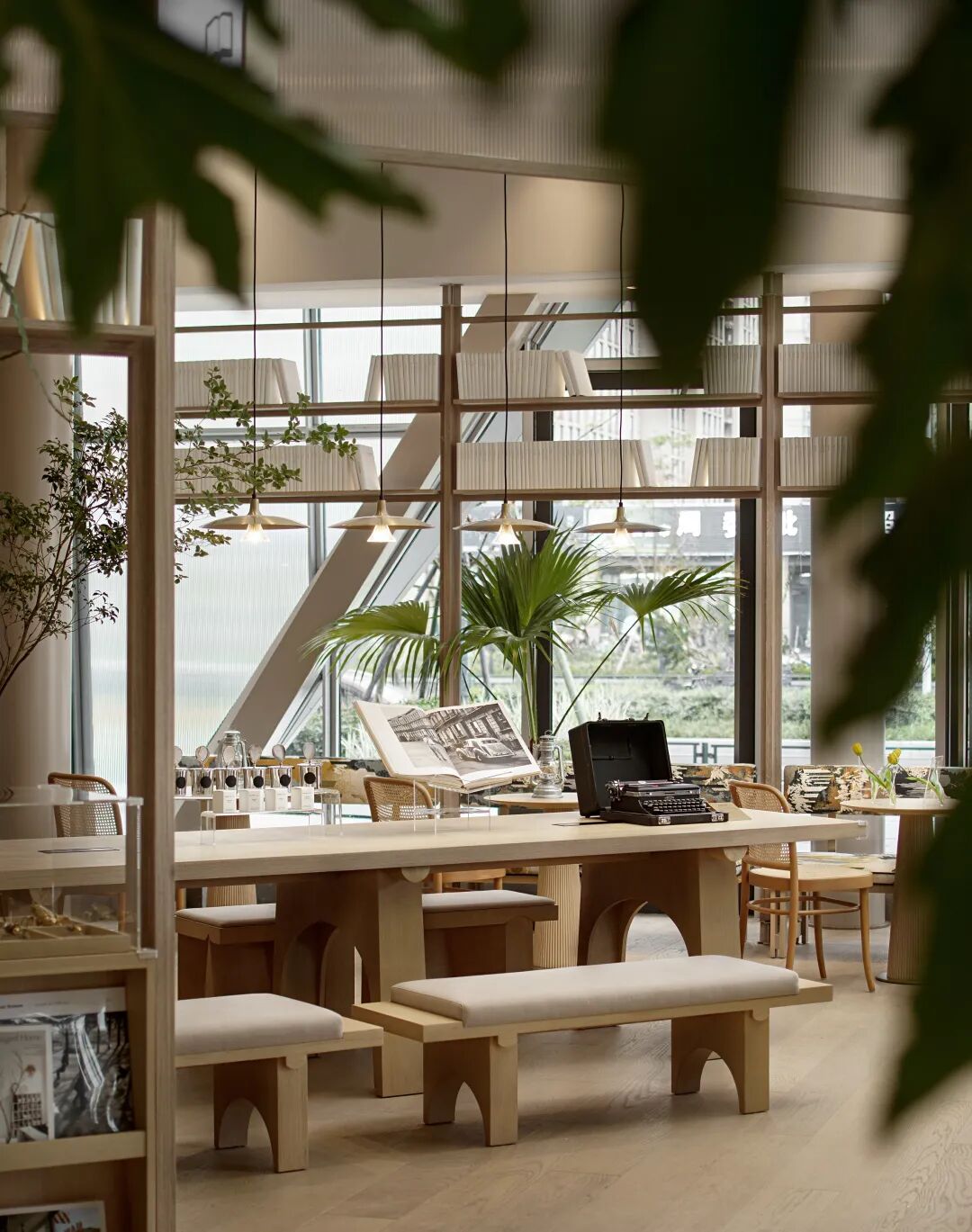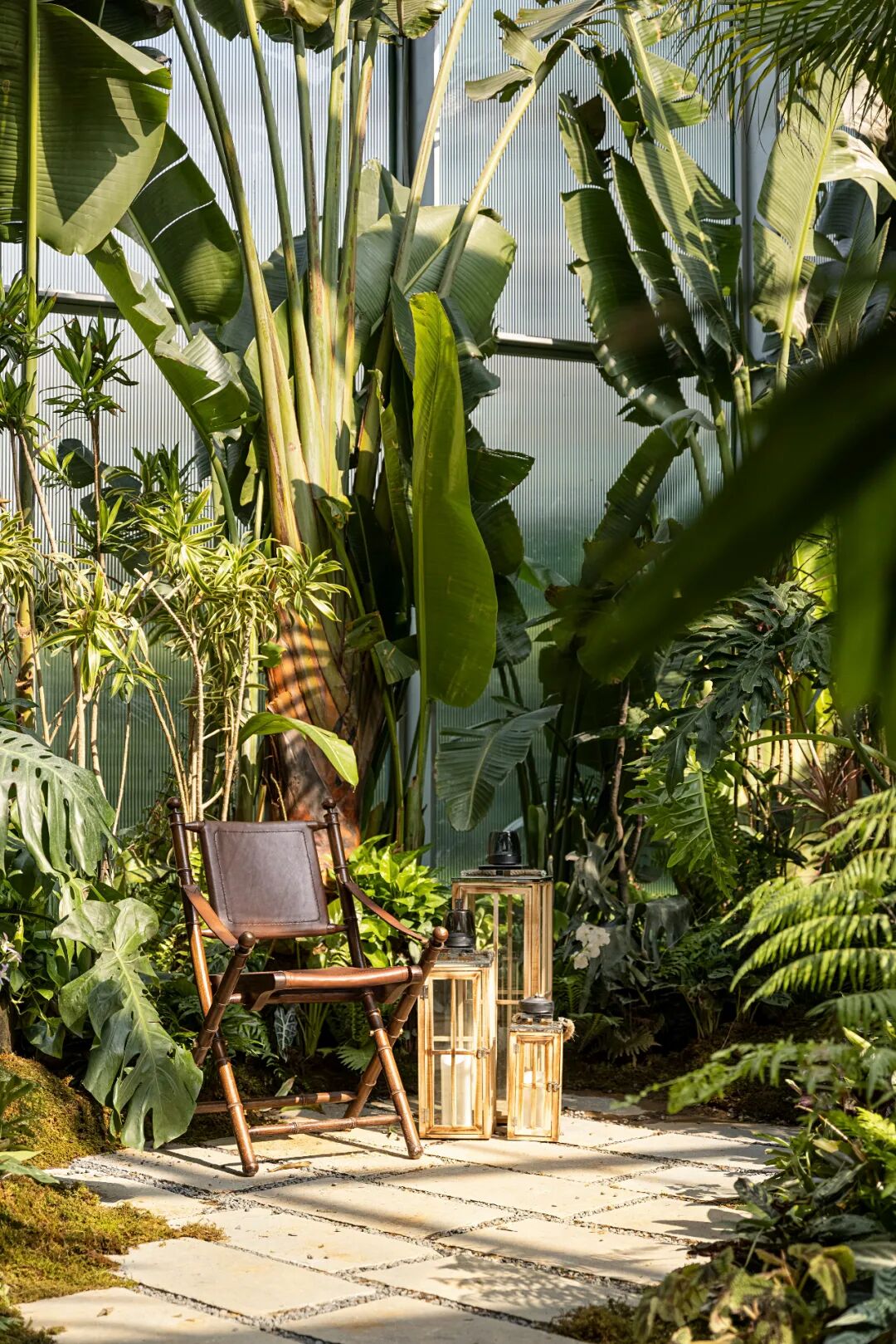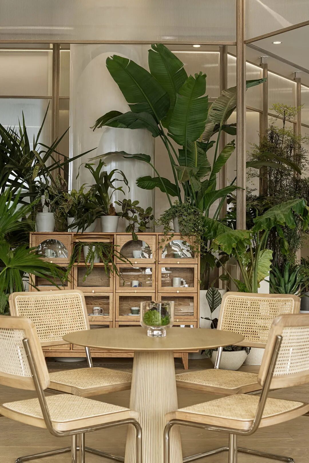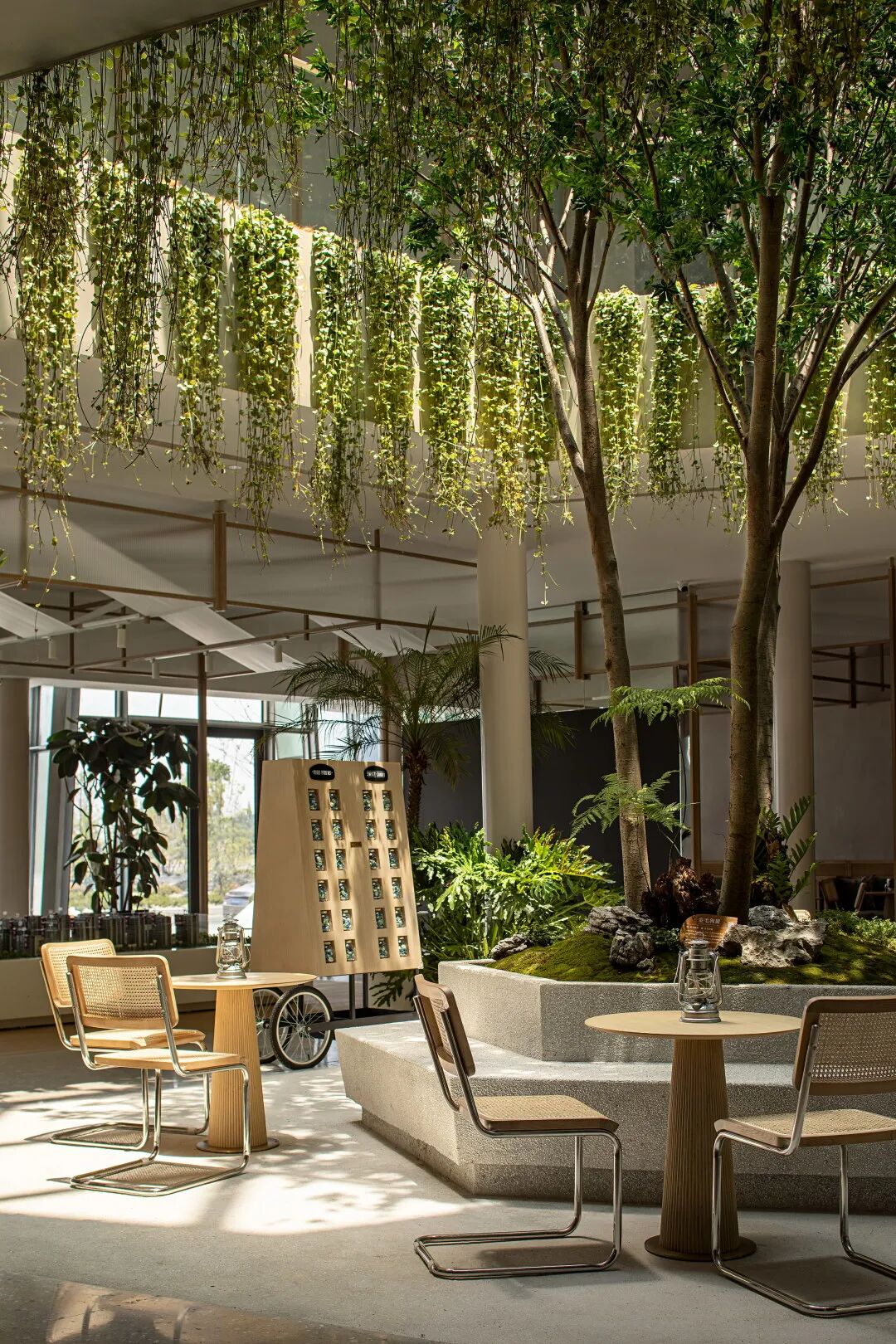 苍翠的树与叶,撑满空间的所及之处,却未对空间的流动形成任何的影响,反而赋予一种愈加自由而开阔的轻盈感。