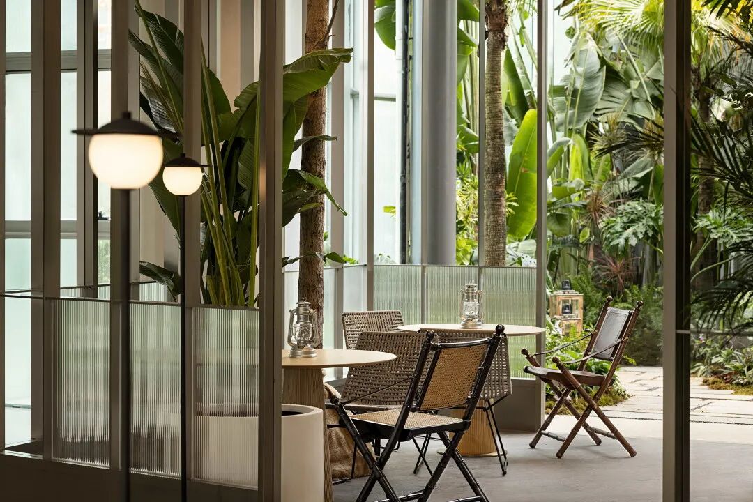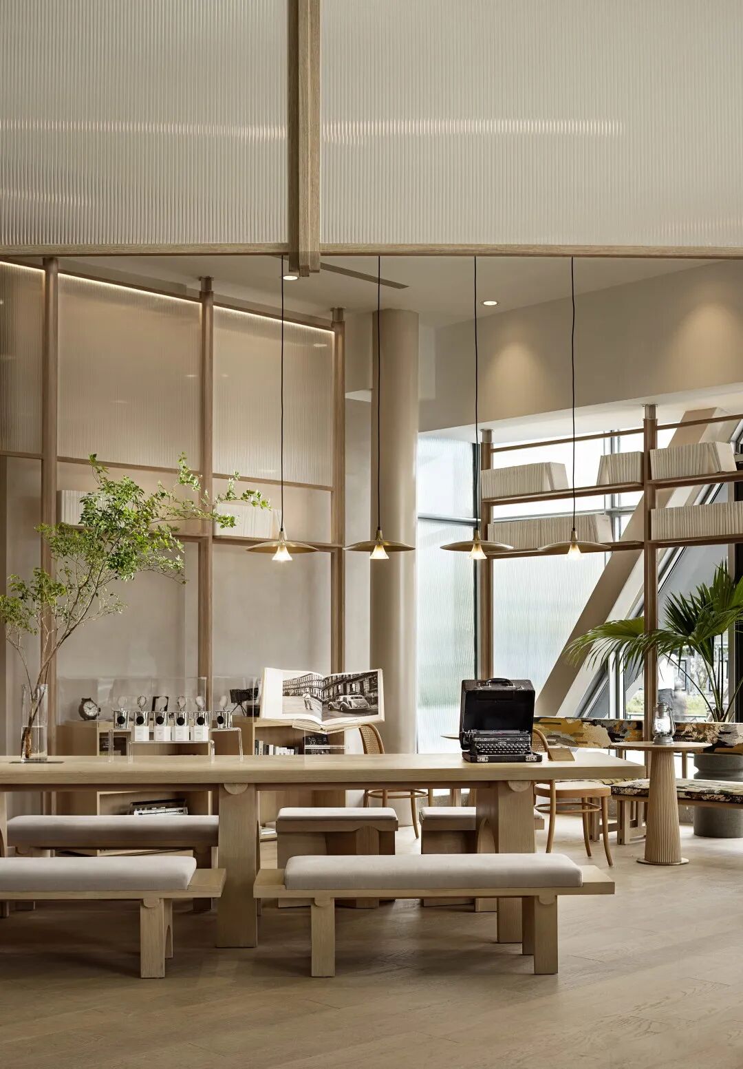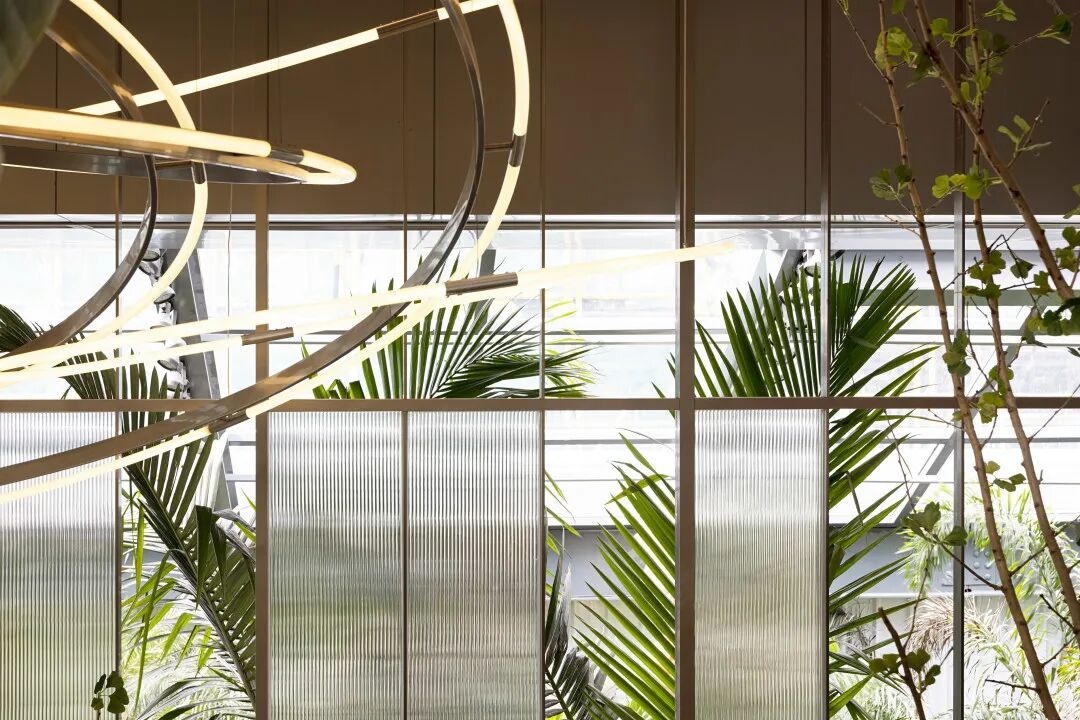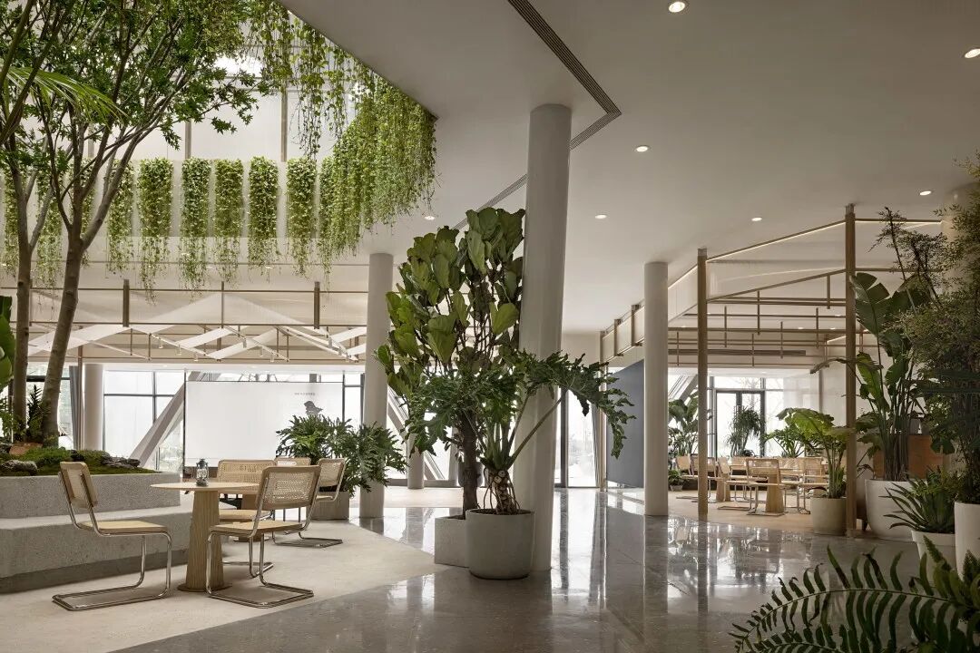 苍翠的树与叶,撑满空间的所及之处,却未对空间的流动形成任何的影响,反而赋予一种愈加自由而开阔的轻盈感。