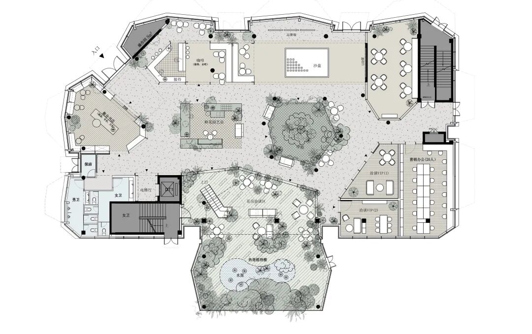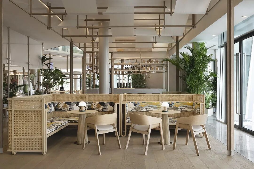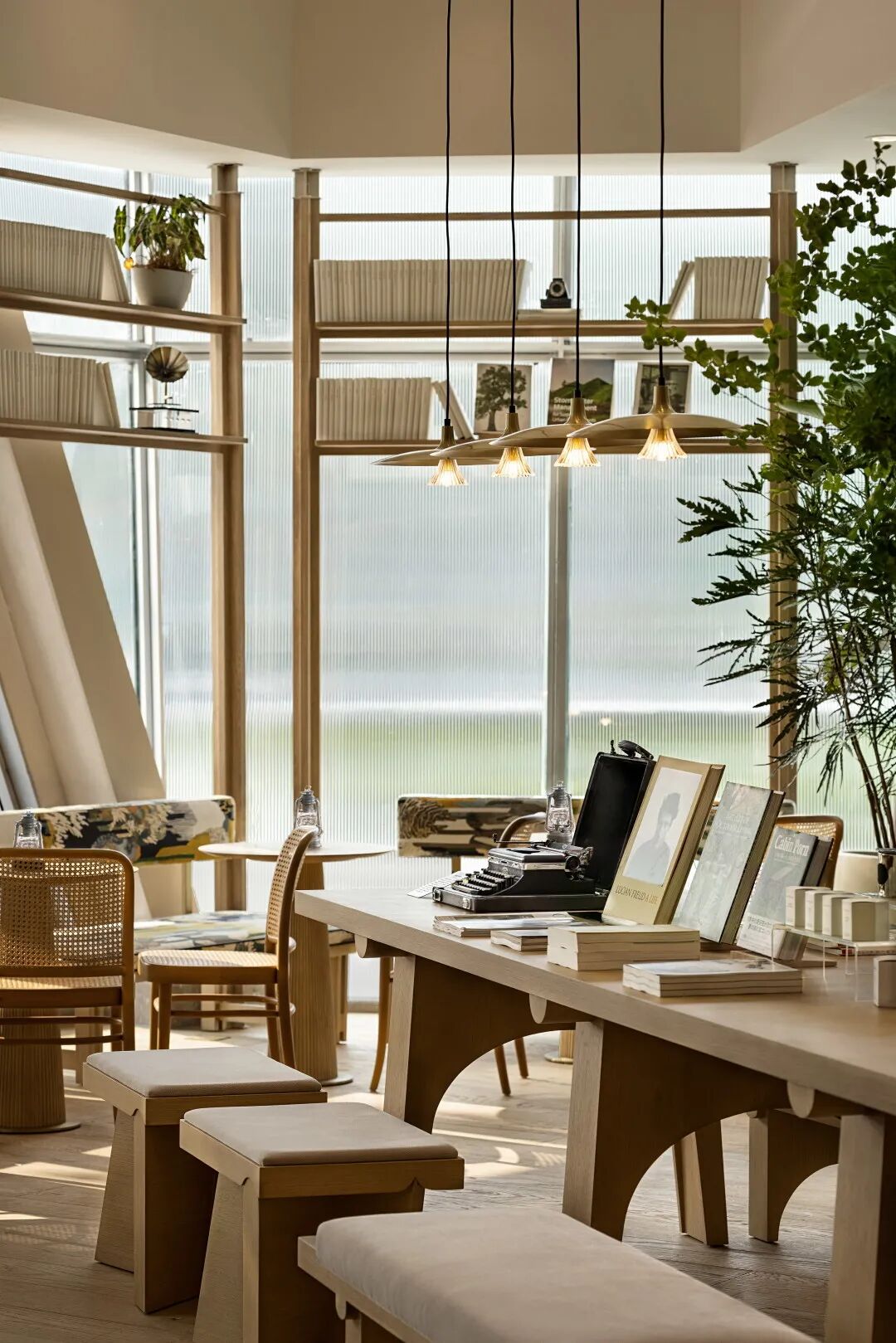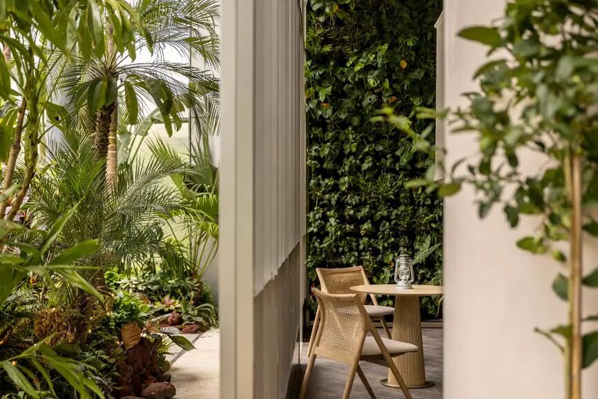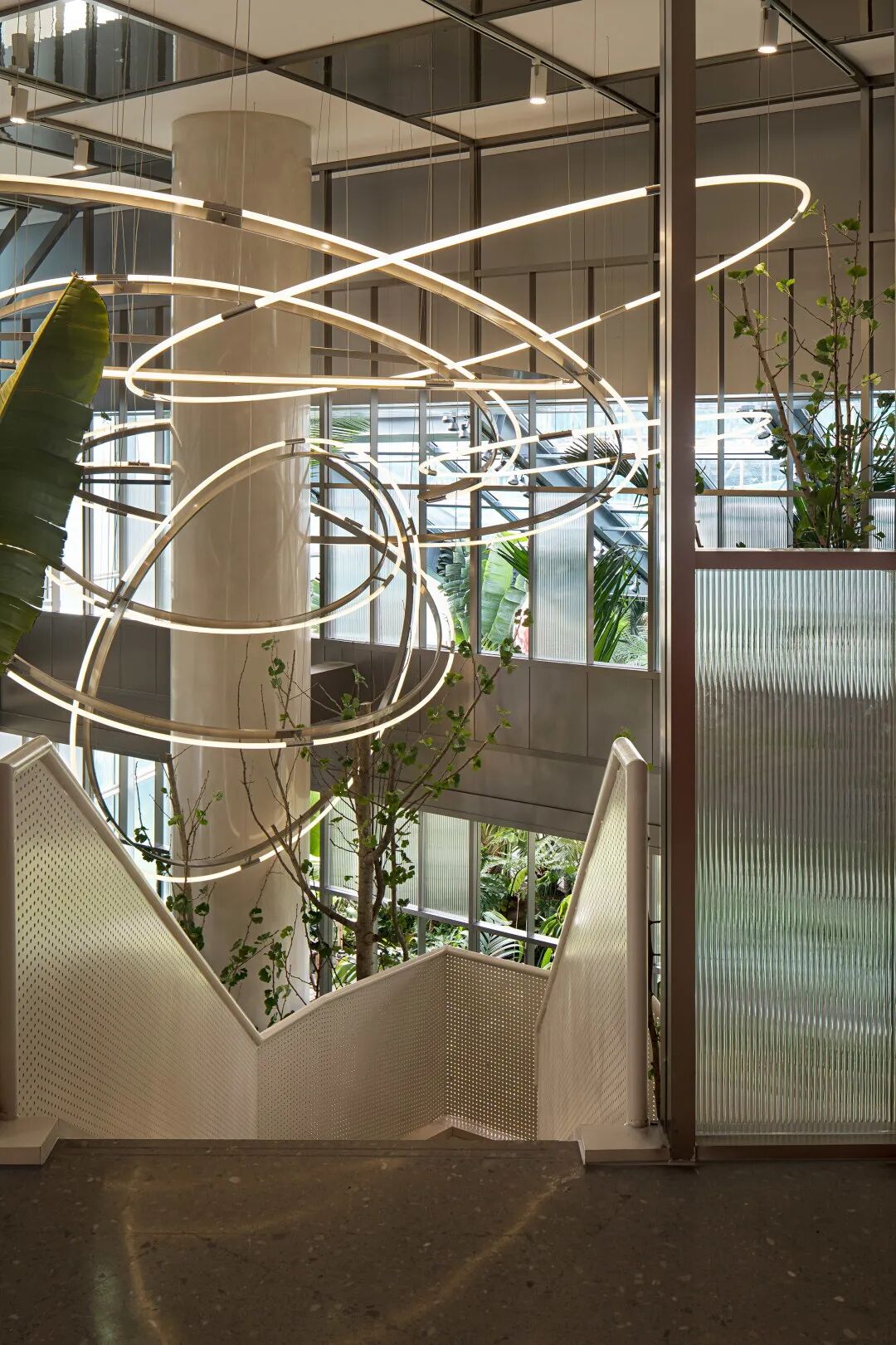 苍翠的树与叶,撑满空间的所及之处,却未对空间的流动形成任何的影响,反而赋予一种愈加自由而开阔的轻盈感。