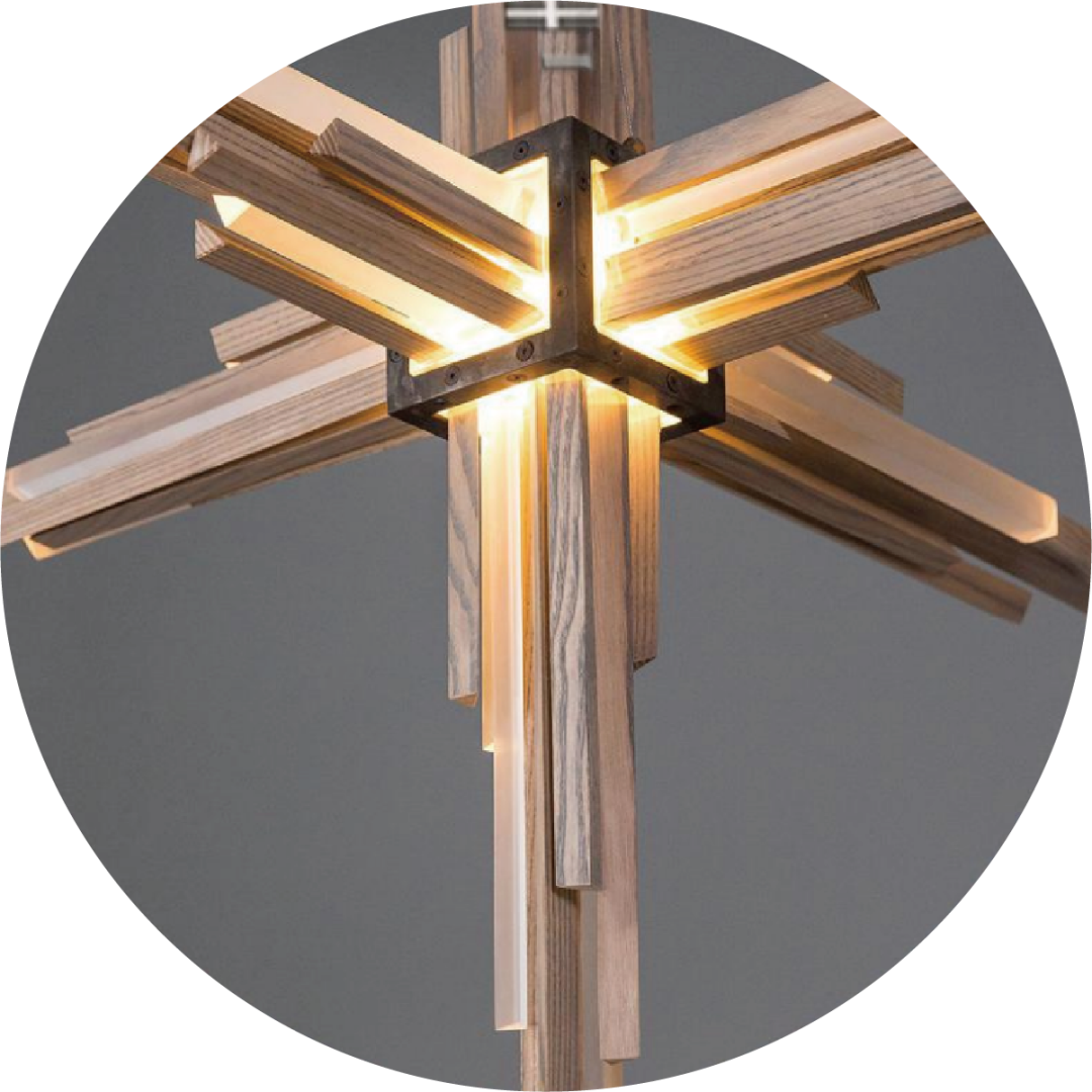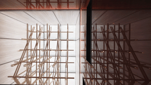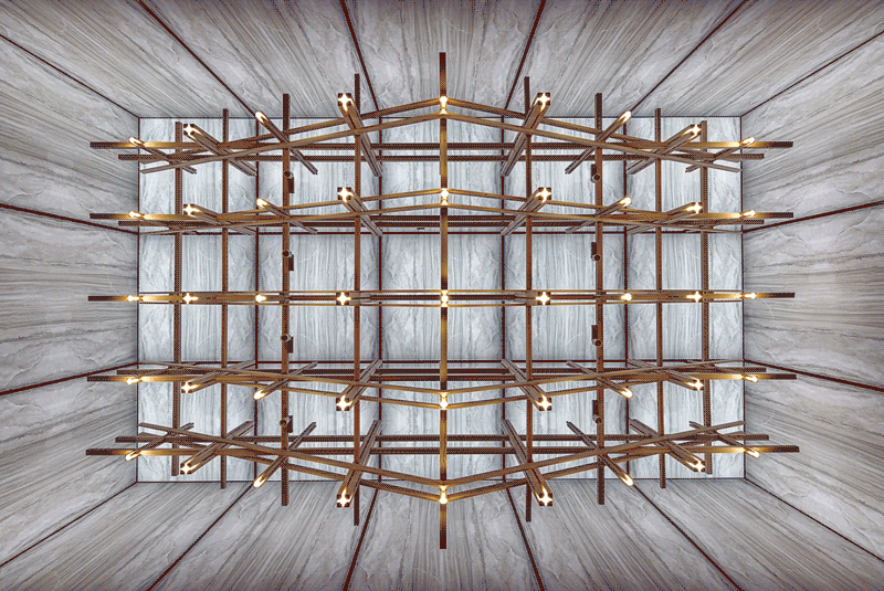 吊燈裝置代表的是“末”,鏡像出“本”。具有秩序感的結構橫豎相互支撐,形成了五個“人”字。