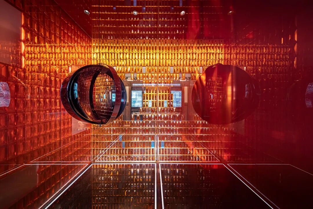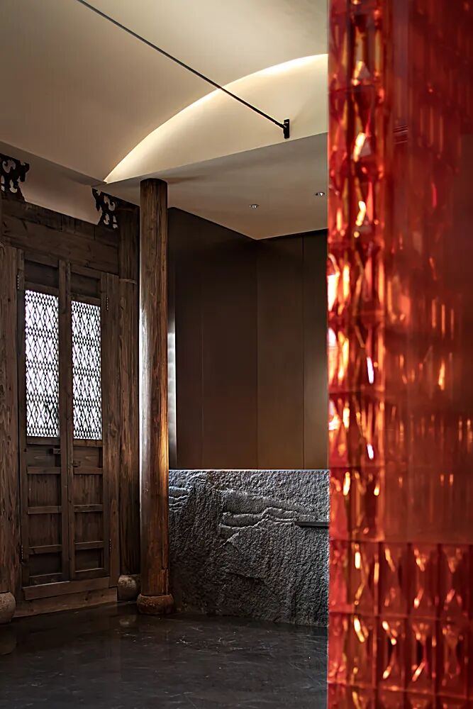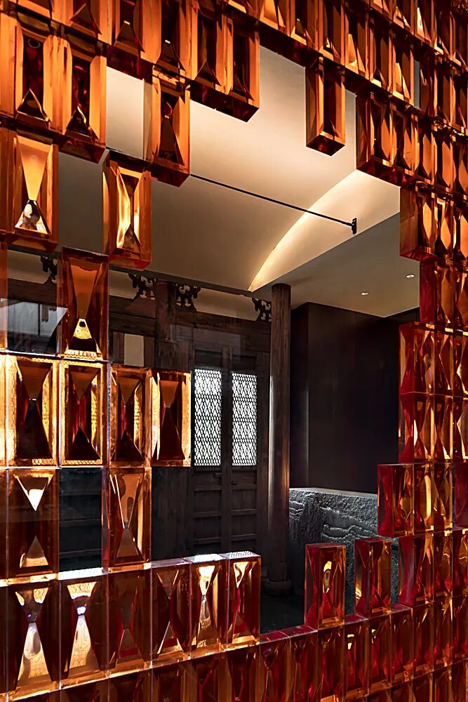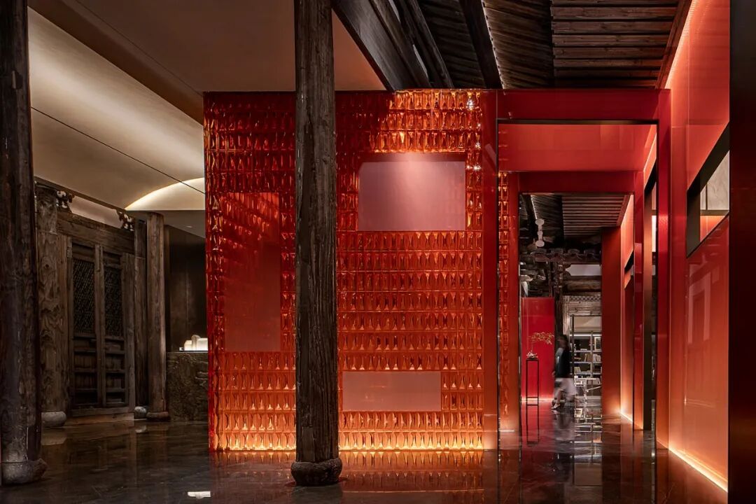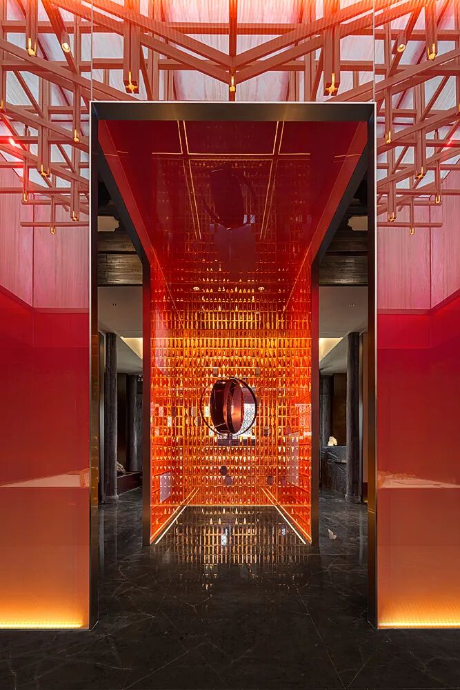 纁紅色夾絲漸變玻璃材質構建,以現代美學手法表達傳統建築文化,是對歷史文化建築的致敬,同時我們也希望借此來賦予空間隱貴尊享的體驗。