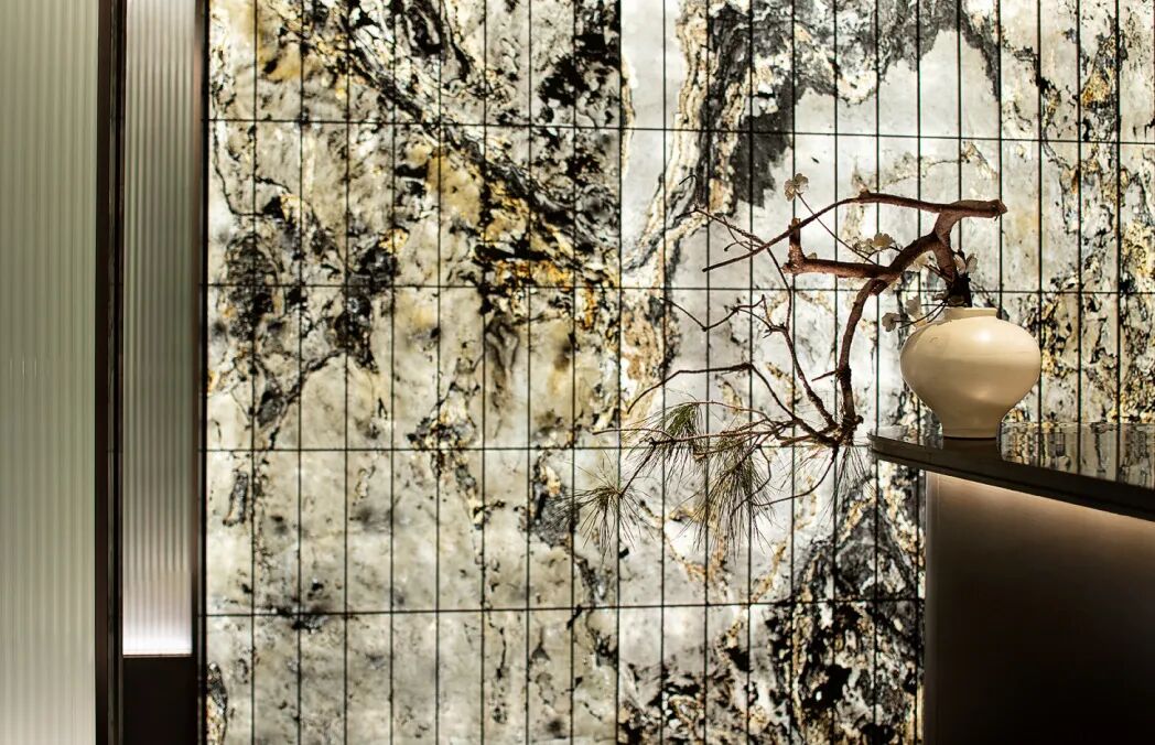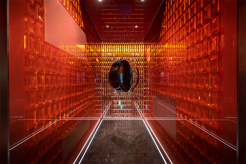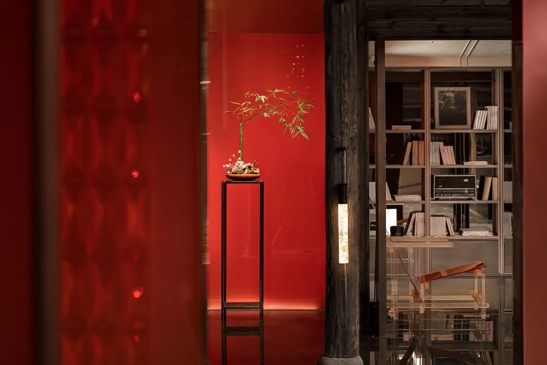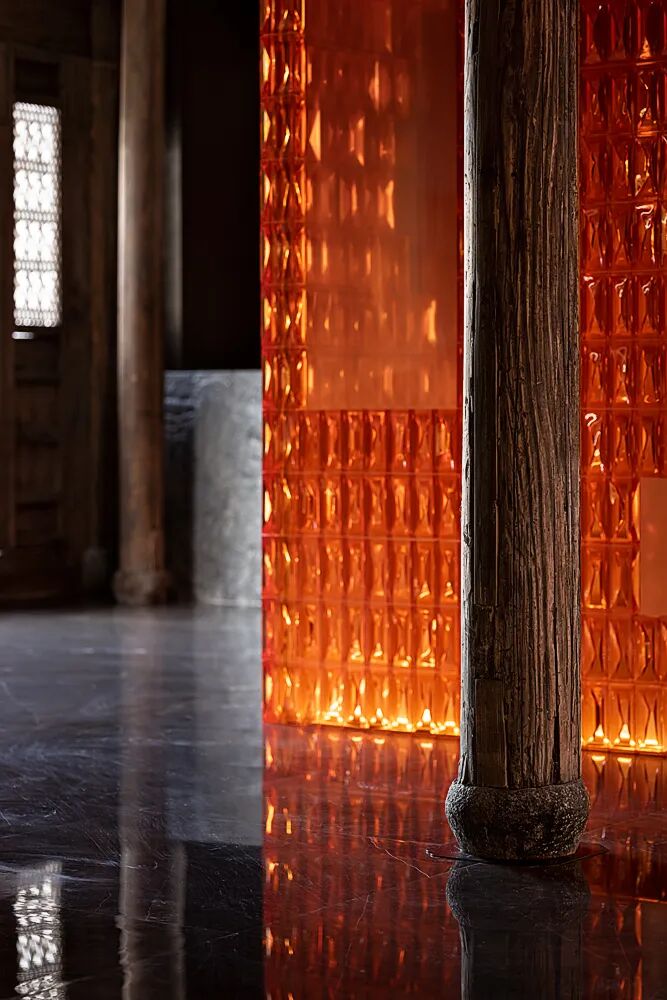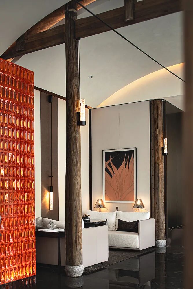 纁紅色夾絲漸變玻璃材質構建,以現代美學手法表達傳統建築文化,是對歷史文化建築的致敬,同時我們也希望借此來賦予空間隱貴尊享的體驗。