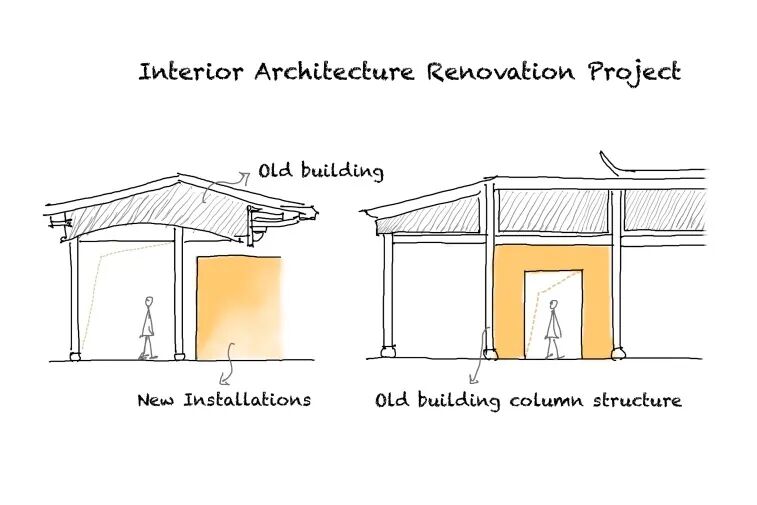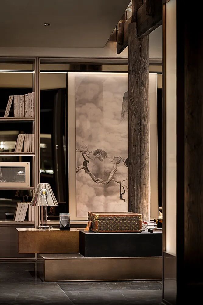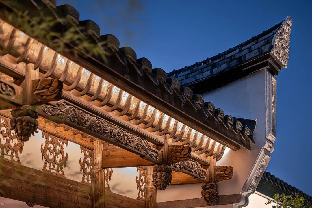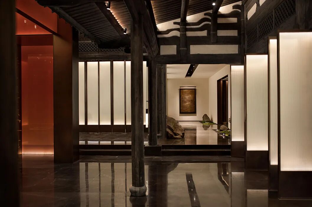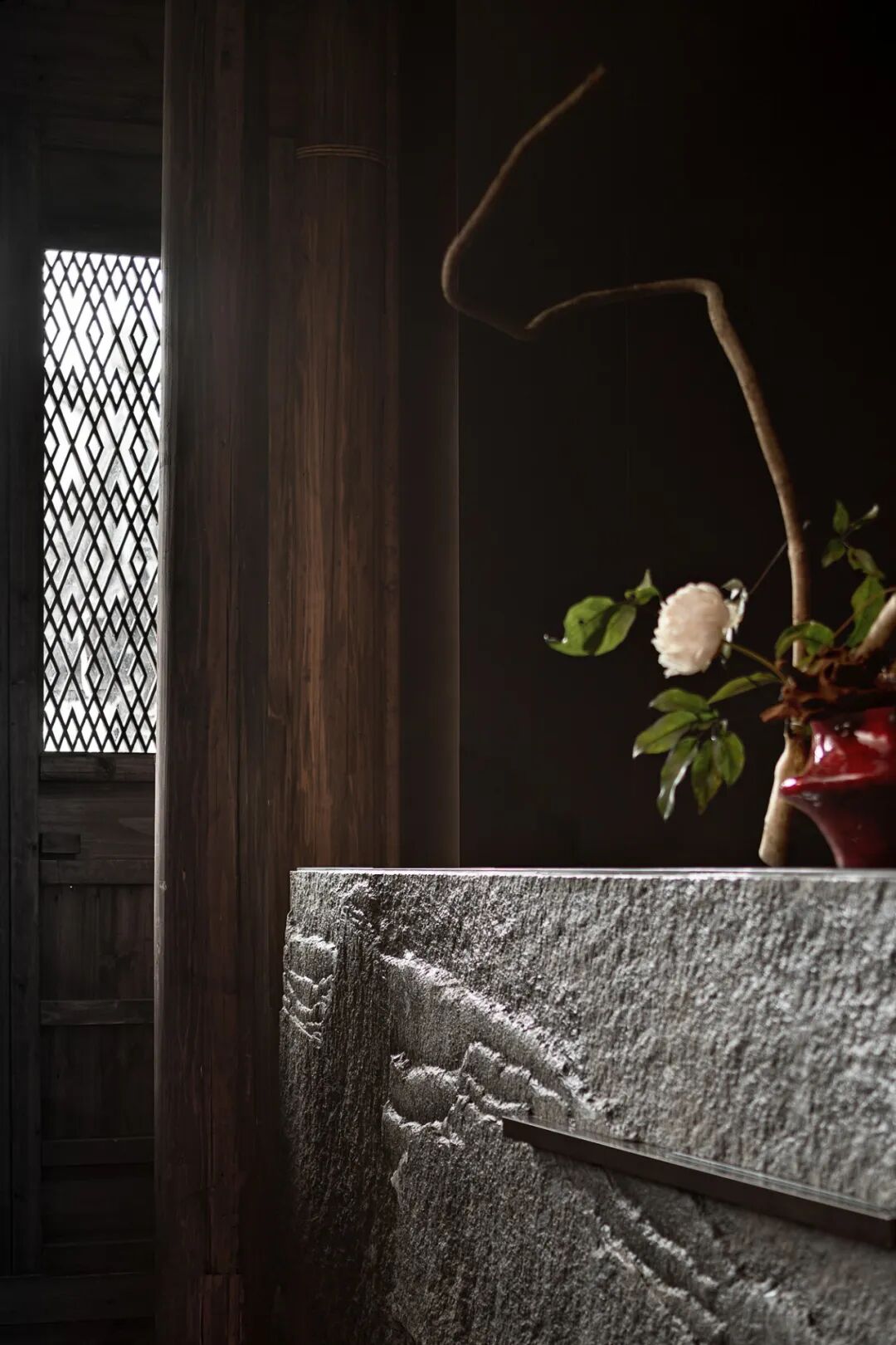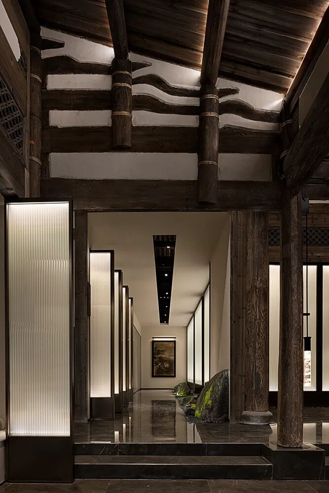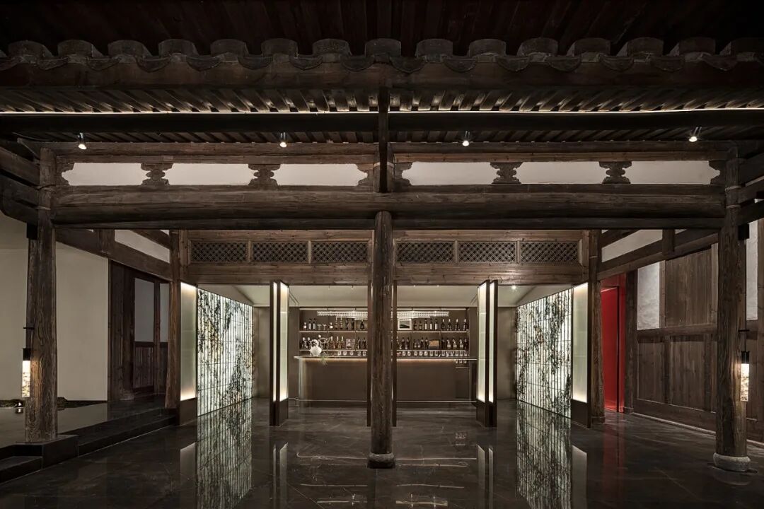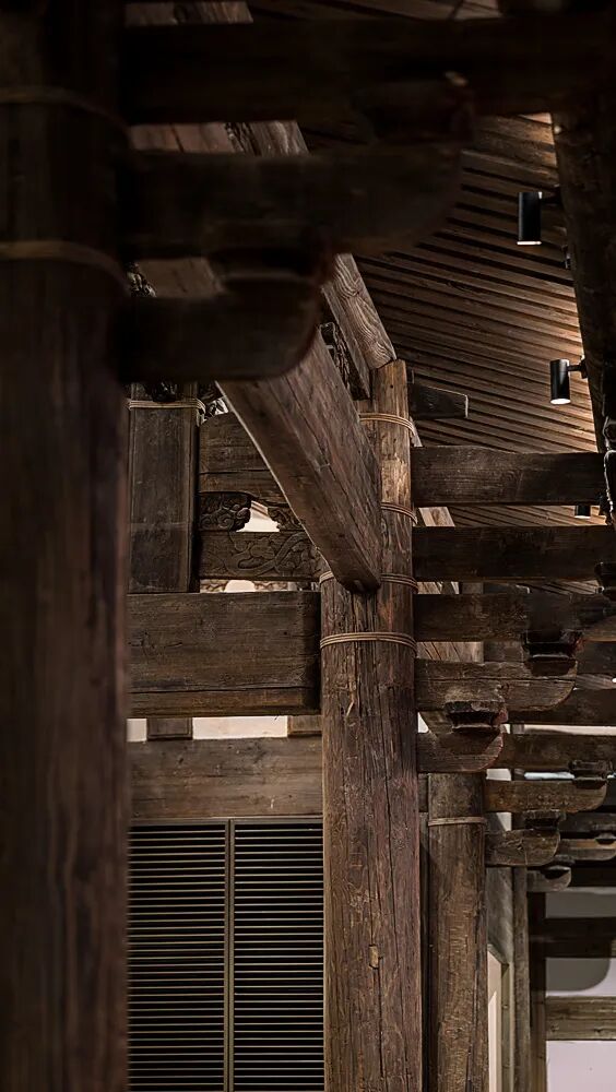 流光照亮高挑的屋頂,精雕細琢的柱梁與柱互為映襯,空間大體為質樸真色。在飾面和結構的處理上,使用舊建築上杉木板的標準尺度,從細節上再現時代風貌。在修舊如舊的同時,引入些許現代藝術材料,展現時代魅力。