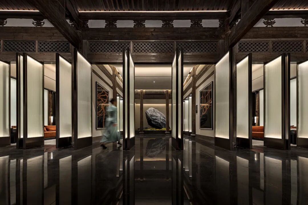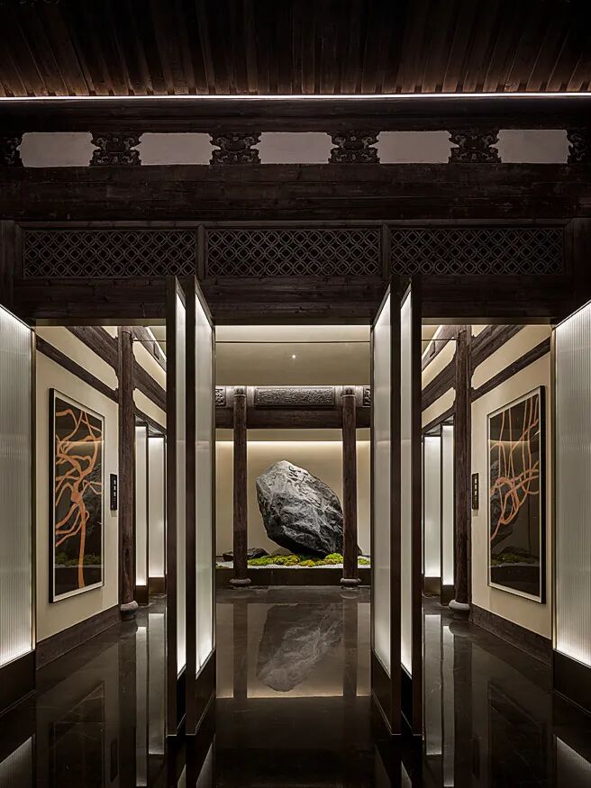 采用傳統的屏風及格刪木門板等半通透處理手法,進行空間的圍合和區隔。通過傳統佈局手法將裏外連通,空間分割自然,新舊空間融為一體。