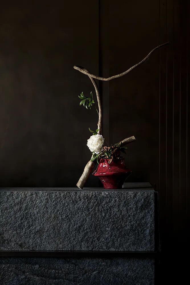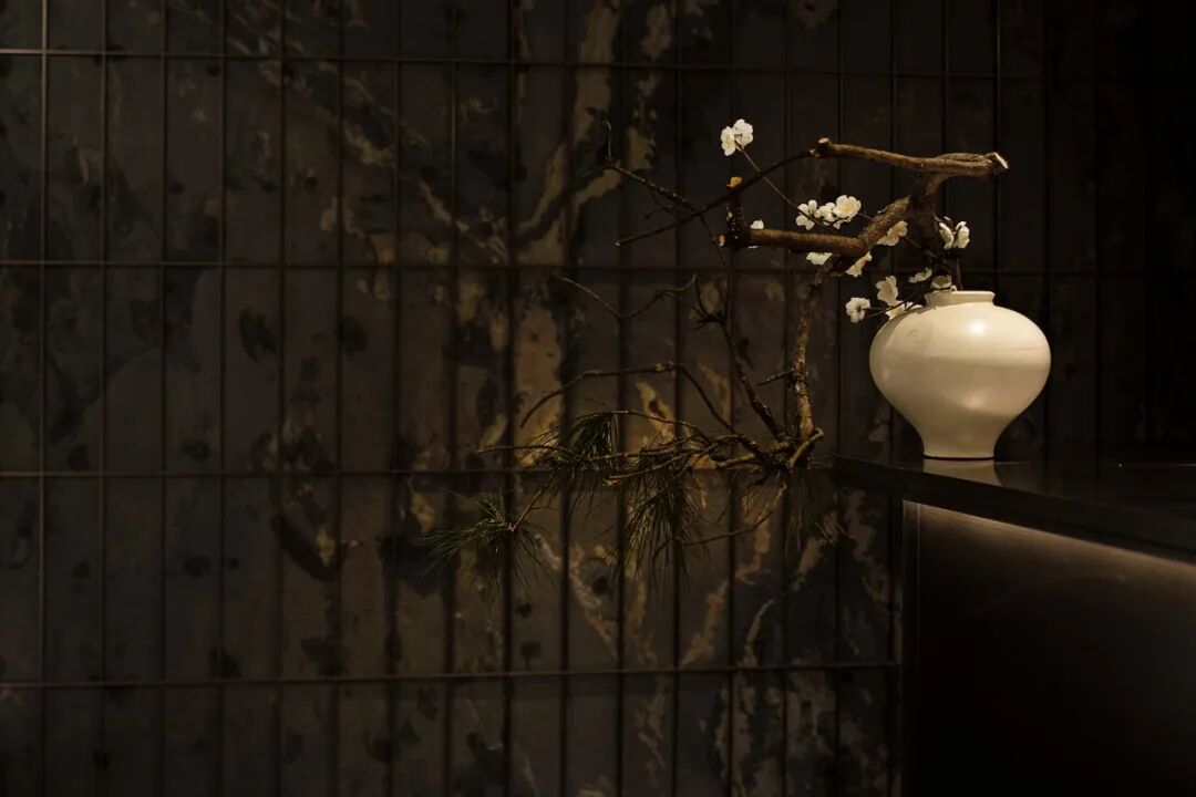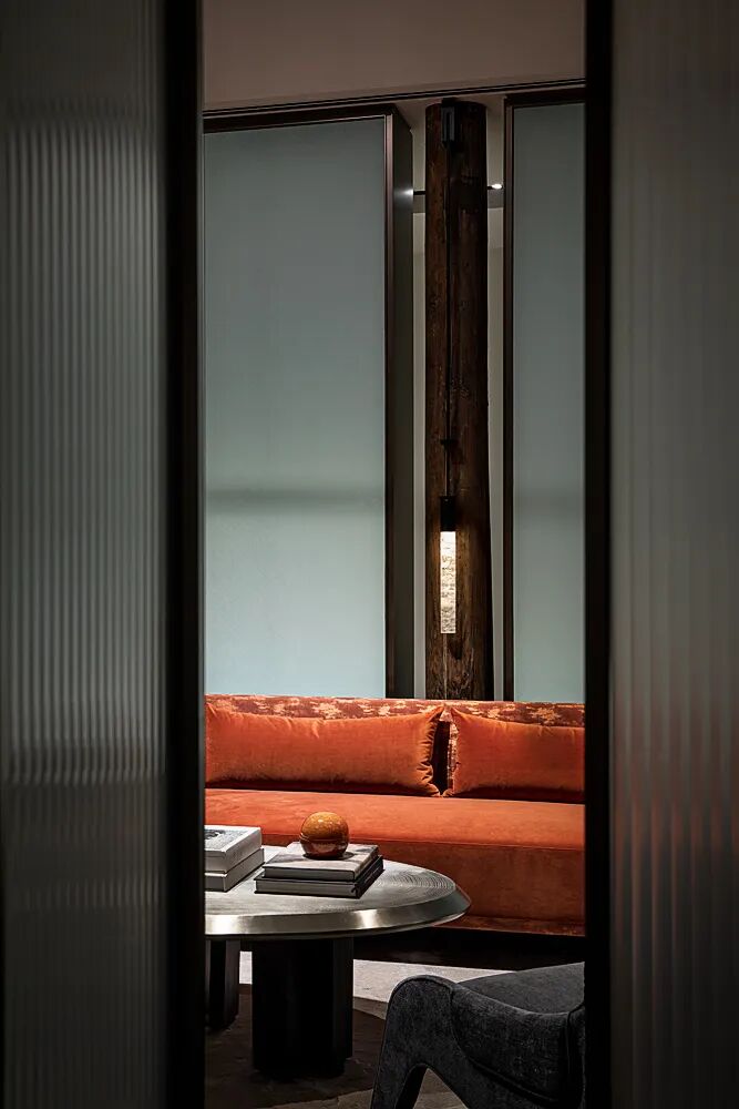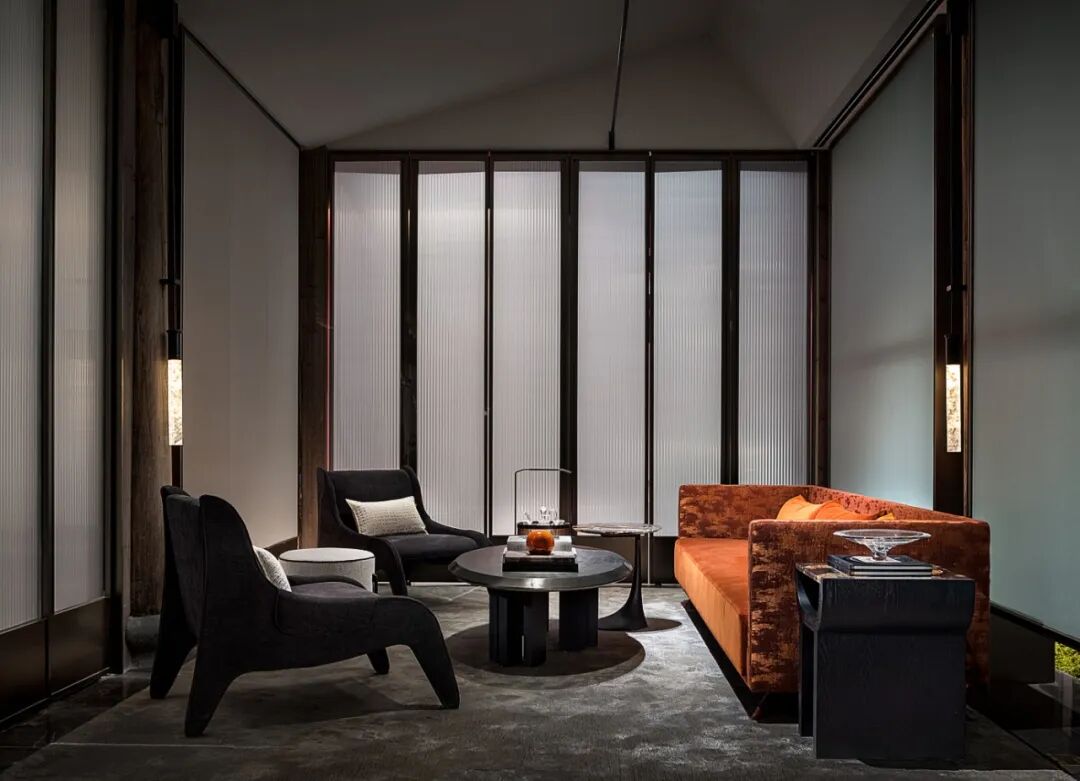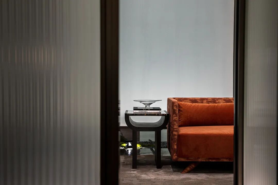 延續中庭的纁紅色夾絲漸變玻璃,移步至初步洽談空間,清新雅致的綠植與大面積落地窗,圍合起清冽空靈之感。空間不多矯飾,大量的留白,減少陳設裝飾的構成元素,於雅致中流露出中國水墨寫意之美,簡雅而素淡。
