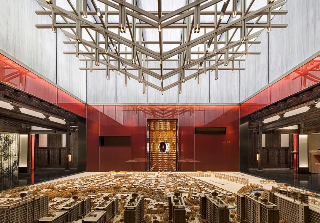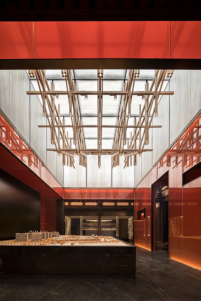初識郭宅,是一片紅磚砌起的馬頭墻,售樓處前廳采用紅色亞克力磚搭建的空間以圍合雕塑,藉此回首過去。當我們大膽嘗試創造新的鏈接時,我們知道傳統人文和社群將會成為更新和支撐我們的根本,為繼續成長提供動力。