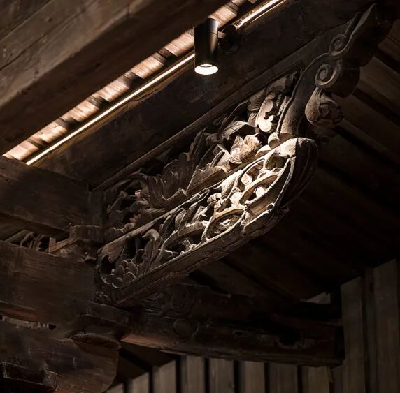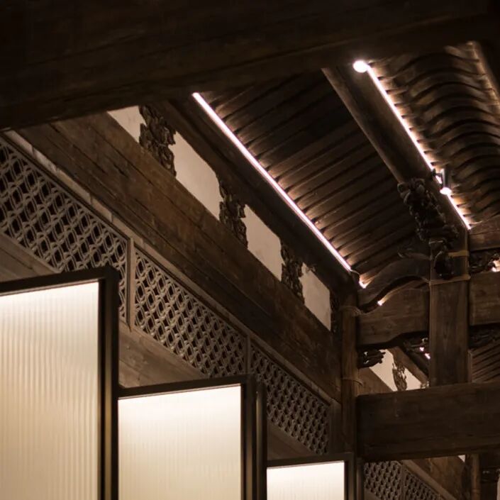 木材作為一種傳統材料,在設計中被重新認知,轉變為一個具有秩序感的燈光裝置。與舊有木梁和木紋光膜相呼應。從木頭縫隙中透出的暖光也象征著“新生”。老宅新生,“人”是支撐發展的根本。