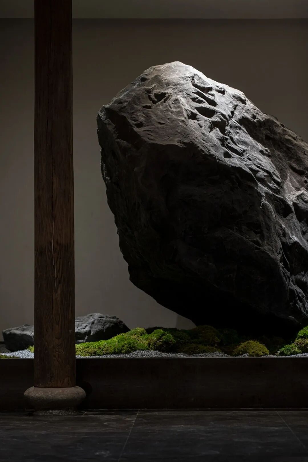 此處置於山石,象征堅強、勇氣、無畏,誠實。探索了地形和自然領域的力量,從自然石頭挑選出來,拓下石頭表面的機理,組成拼接為獨特的藝術作品。