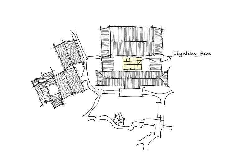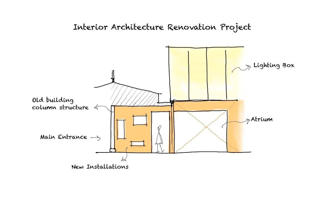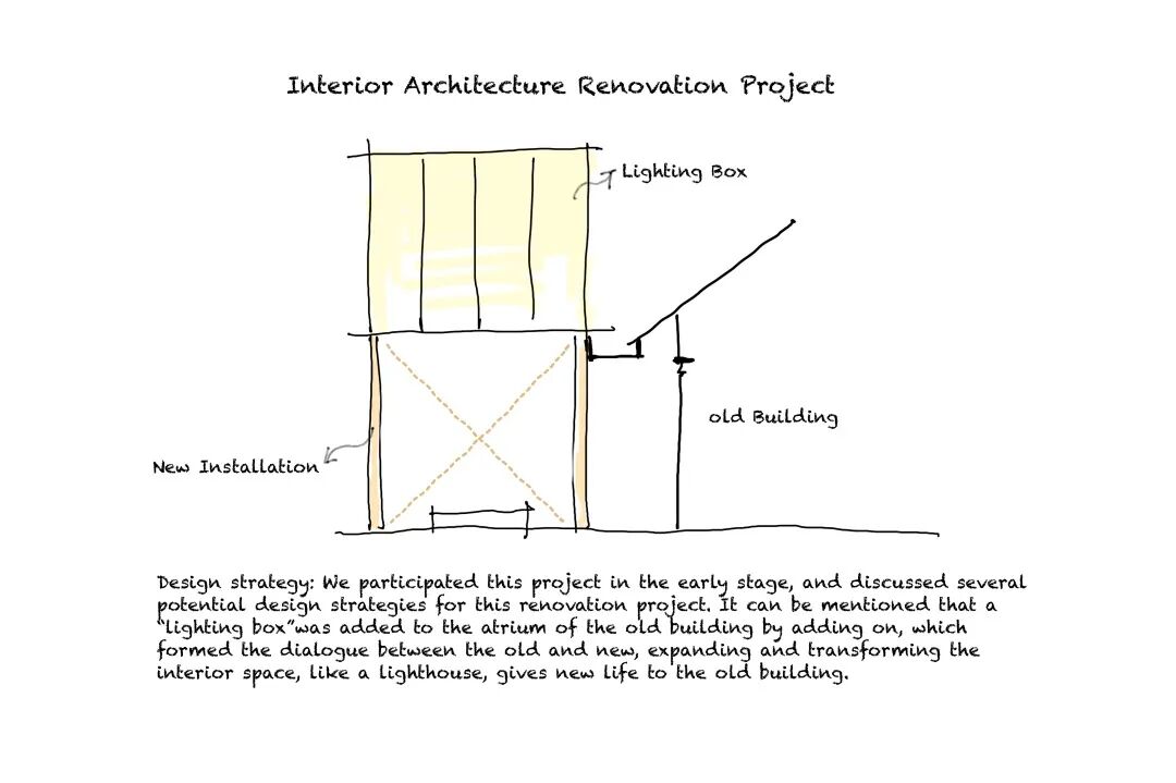 設計團隊結合融信集團整體結構方案與定位主旨,在區塊中心老建築郭宅,塑造出整體風貌煥新的“品牌秀場”。講述一個傳統和現代語匯碰撞的故事,用現代設計手法致敬福州人文意象和傳統東方美學。矩陣在前期參與室內建築改建策略設計中,以Add on的方式在老建築中庭增加"Lighting Box",拓展室內空間並形成新舊對話。