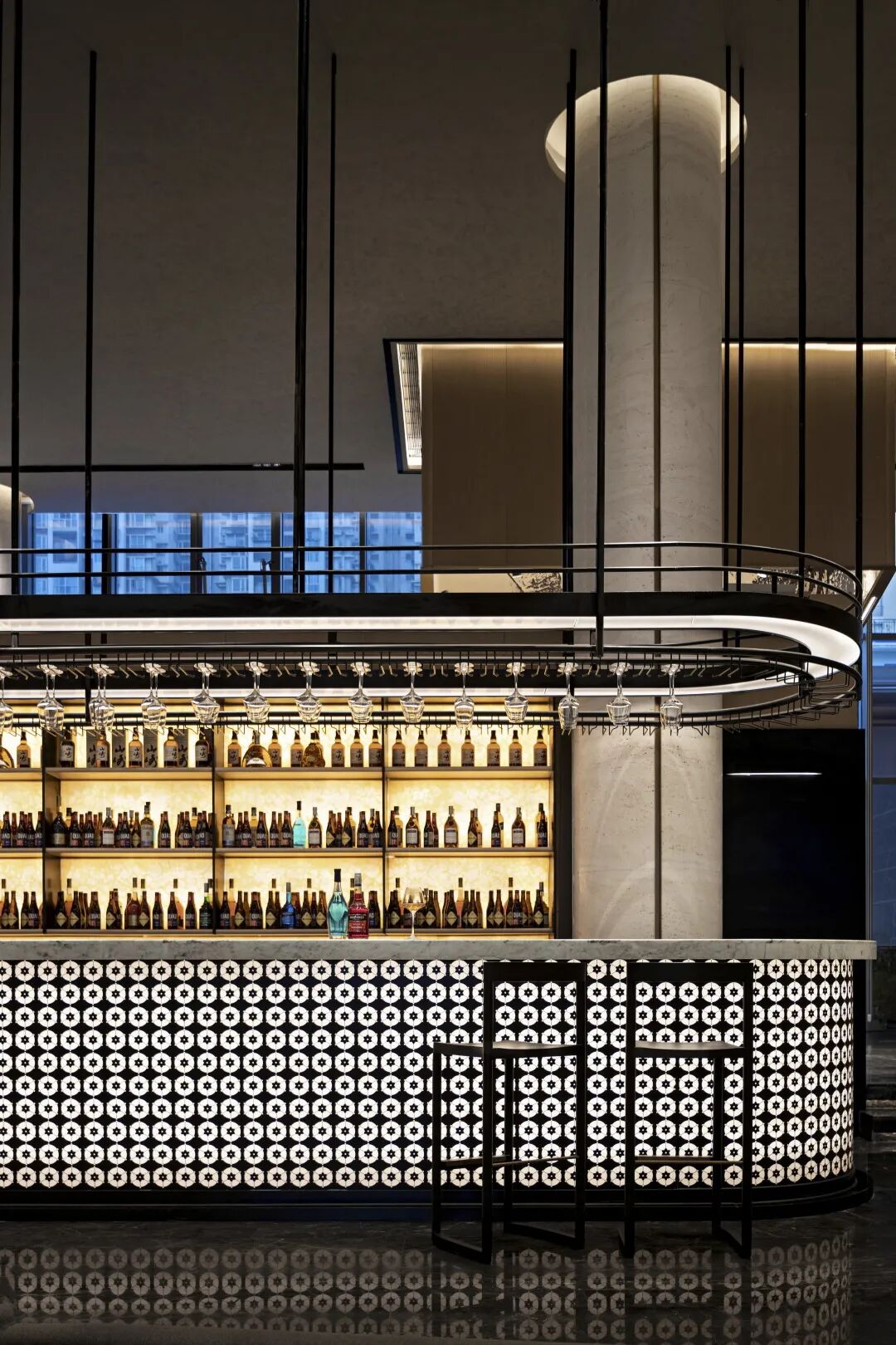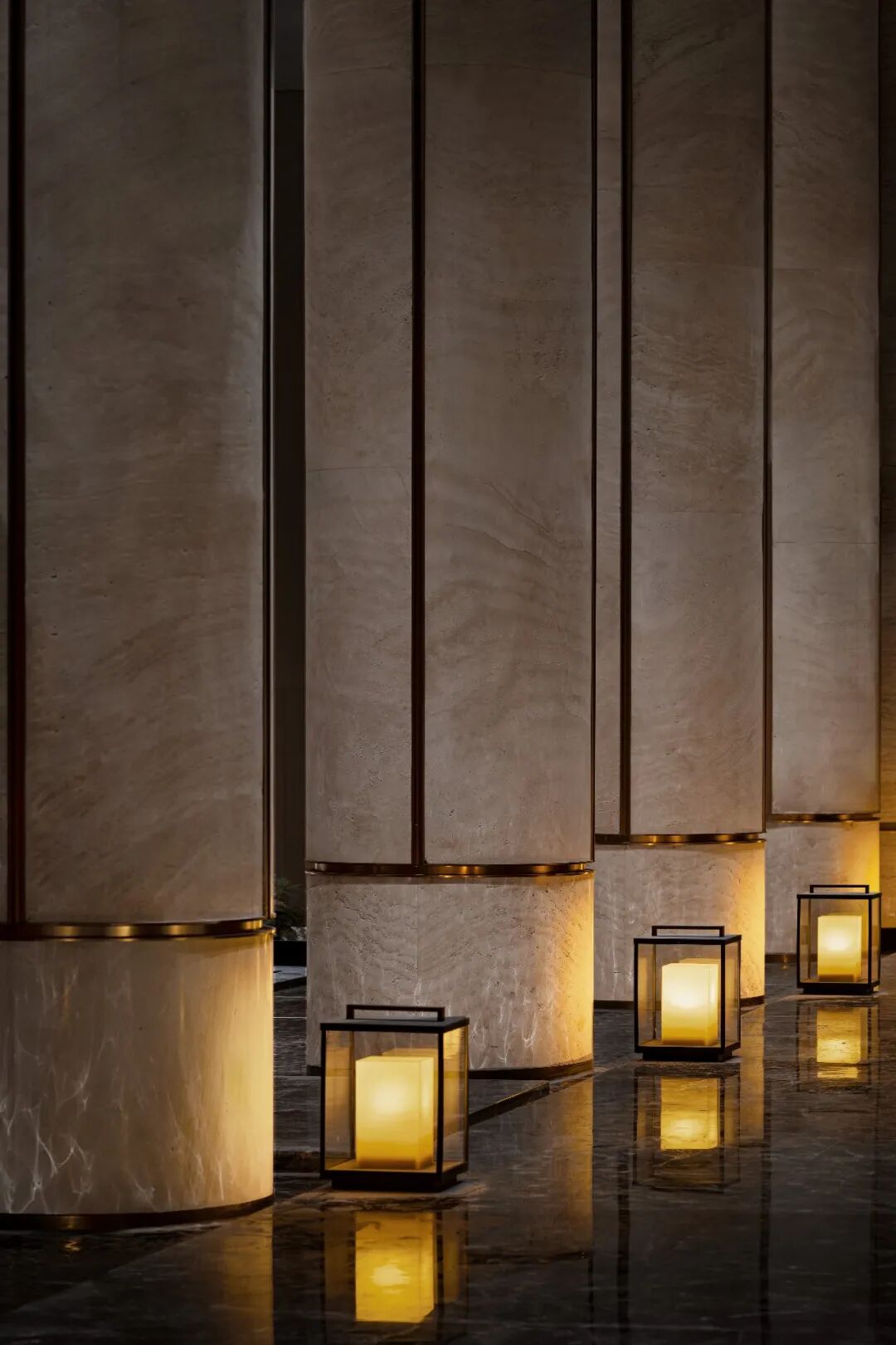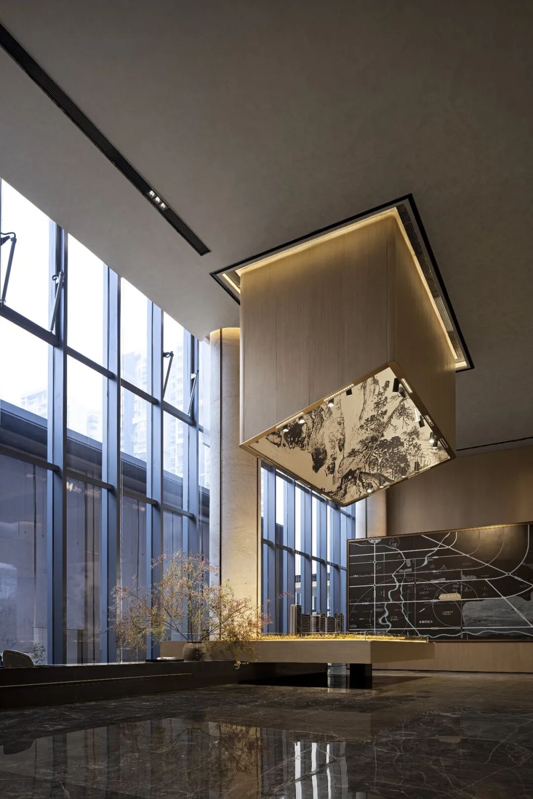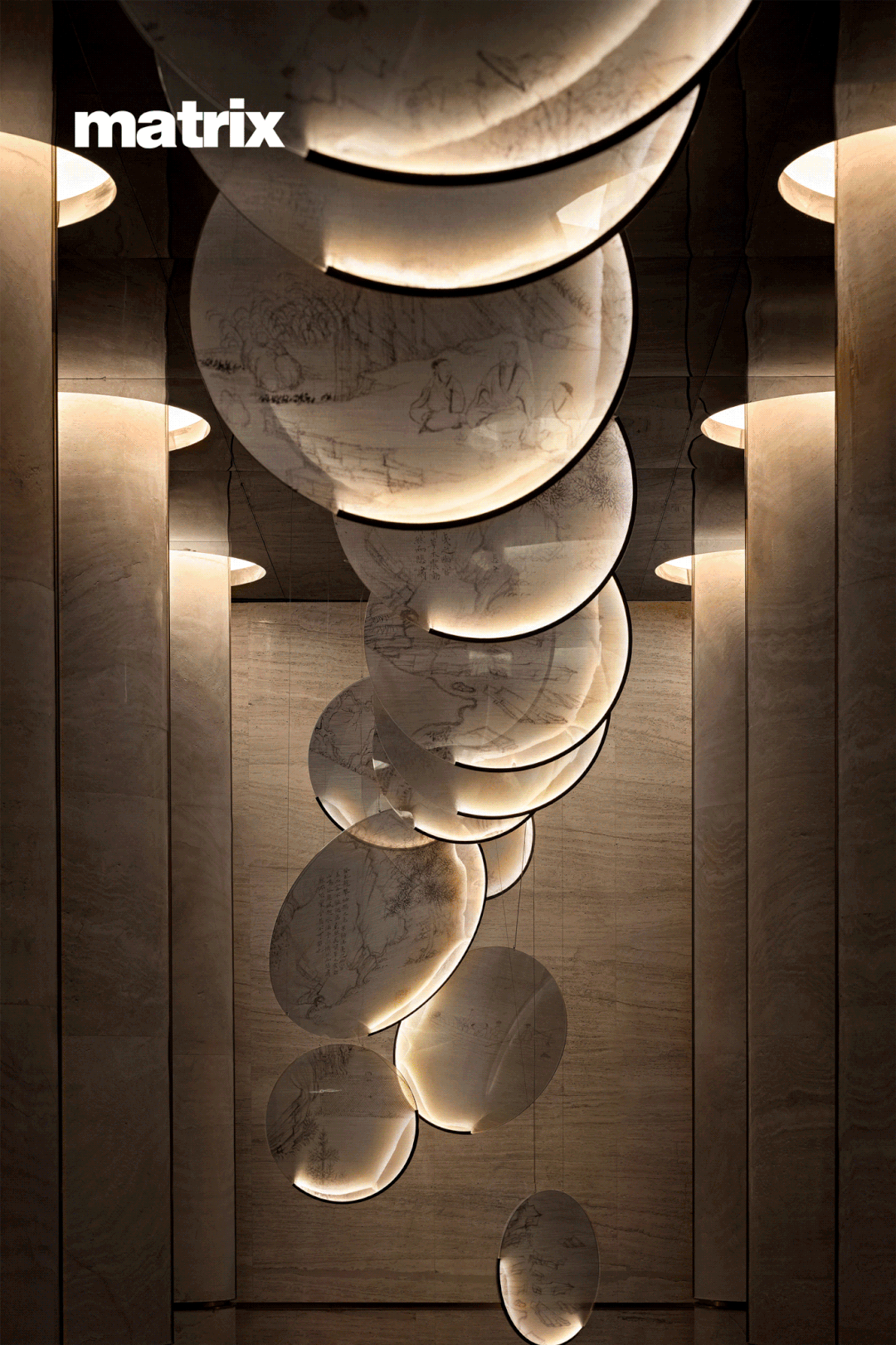 城市以文化底蕴为依托,空间以形态架构作支撑。如诗如画的过道空间,天花镜面将画卷徐徐展开,立柱与灯饰合二为一,全景式的构图使得整体画面在雄伟壮观中,又不乏细致缜密。