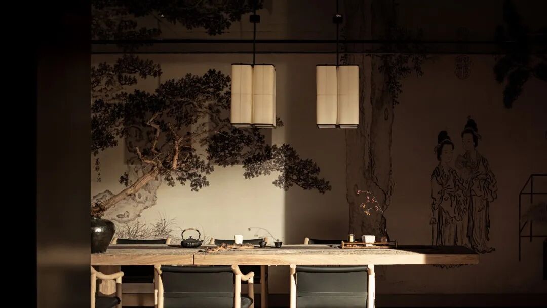 茶室以一面古朴的画作为屏风,悬吊两盏灯饰,约上三两好友,点一盏茶,畅谈言欢,悠然自得。
