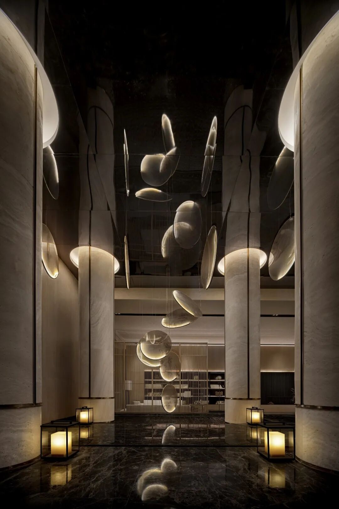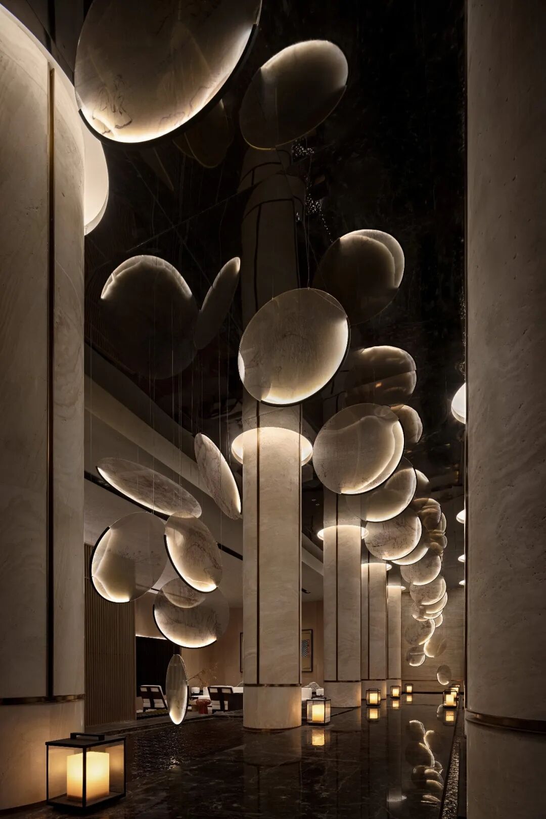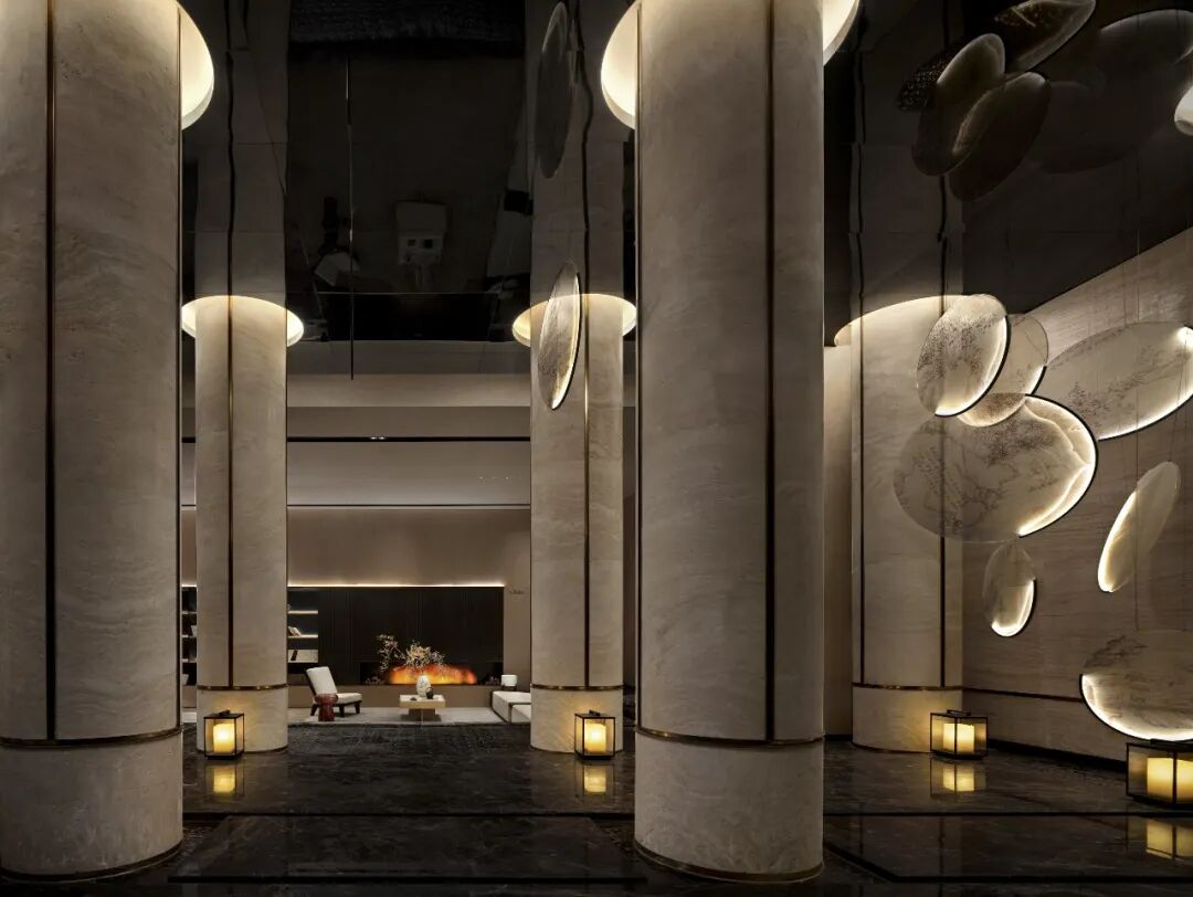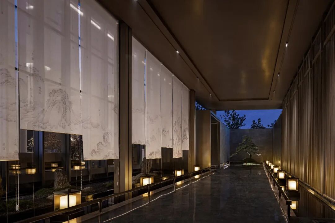 成都地势中间低,四周高,是名副其实的盆地。成都特有的“高”与“低”柔和在一块,水墨画点缀的灯饰映照在大理石的地面上,将人的思绪引向传统的一方。